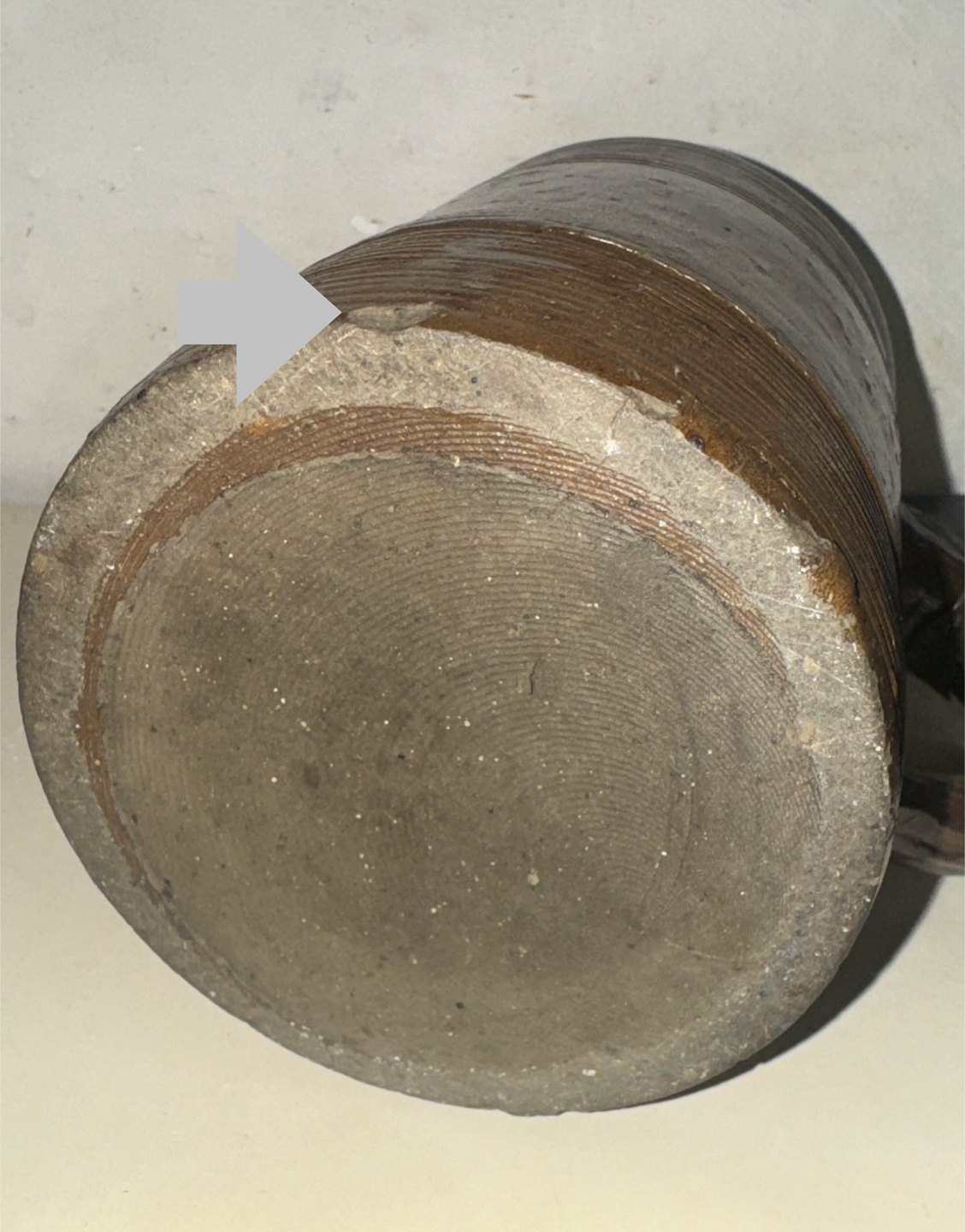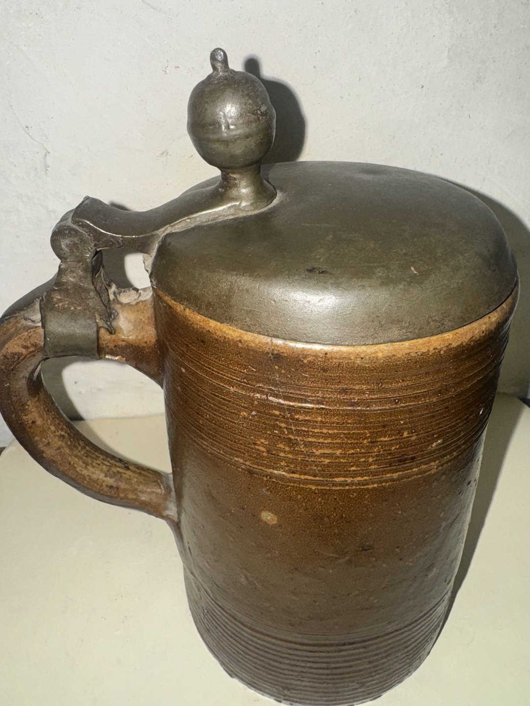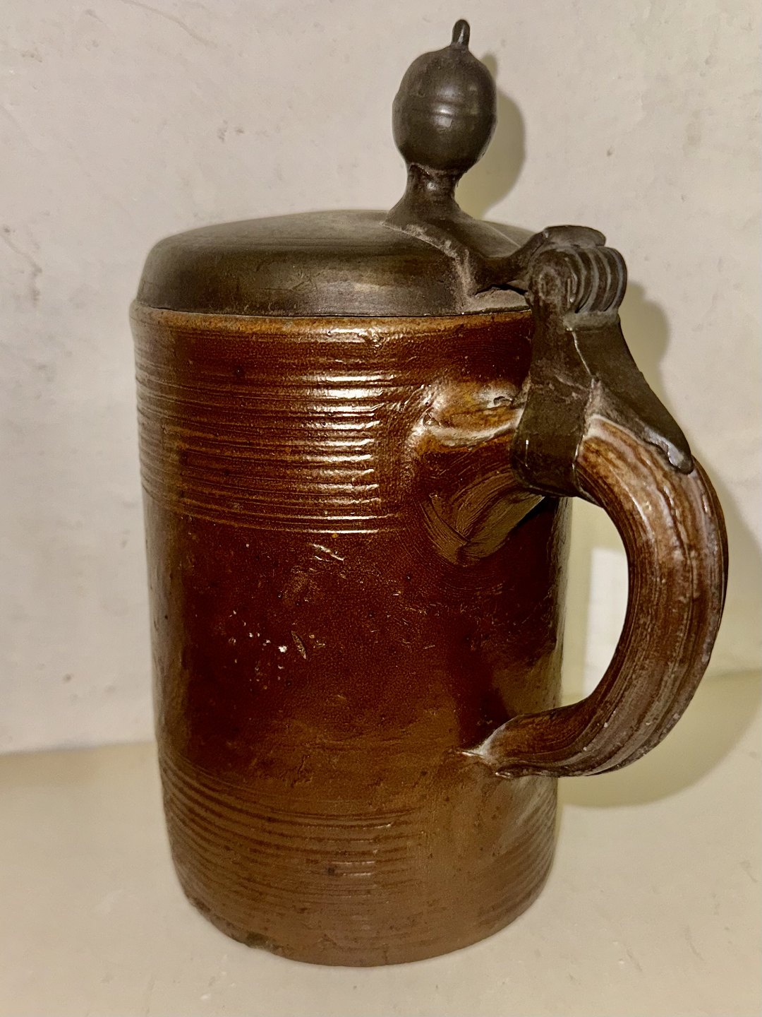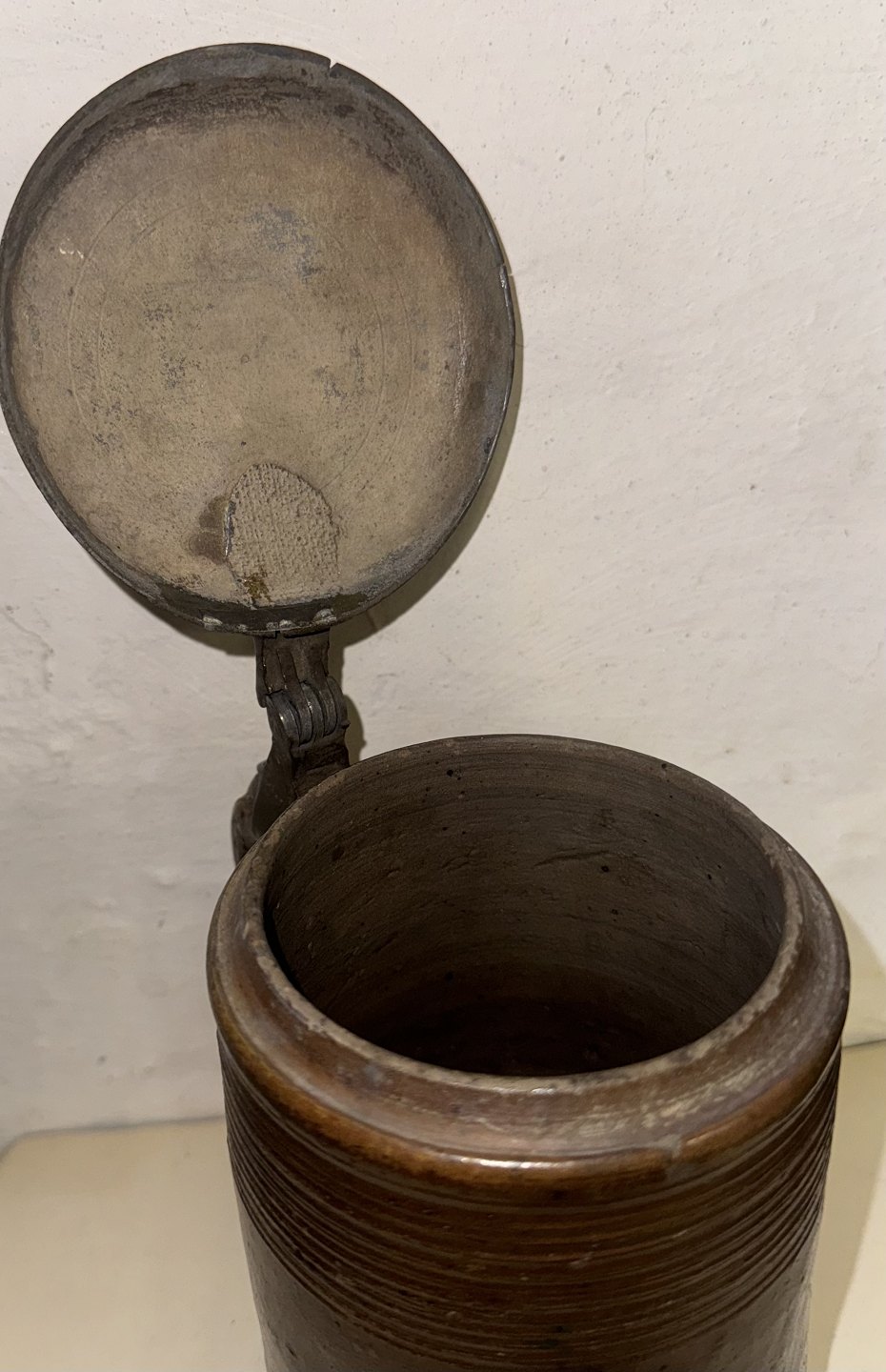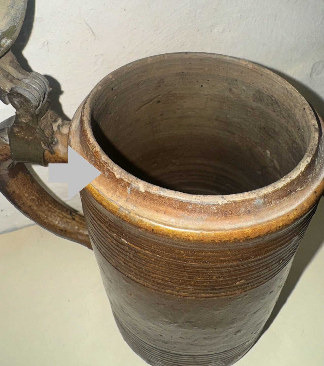 Krus i keramik med låg i metal. Fremstillet i Tyskland i første halvdel af det 19. århundrede. Kruset har lidt brugsspor (se fotos med de grå pile). Mål: 15,5 cm og 21,5 cm inklusiv toppen af låget.