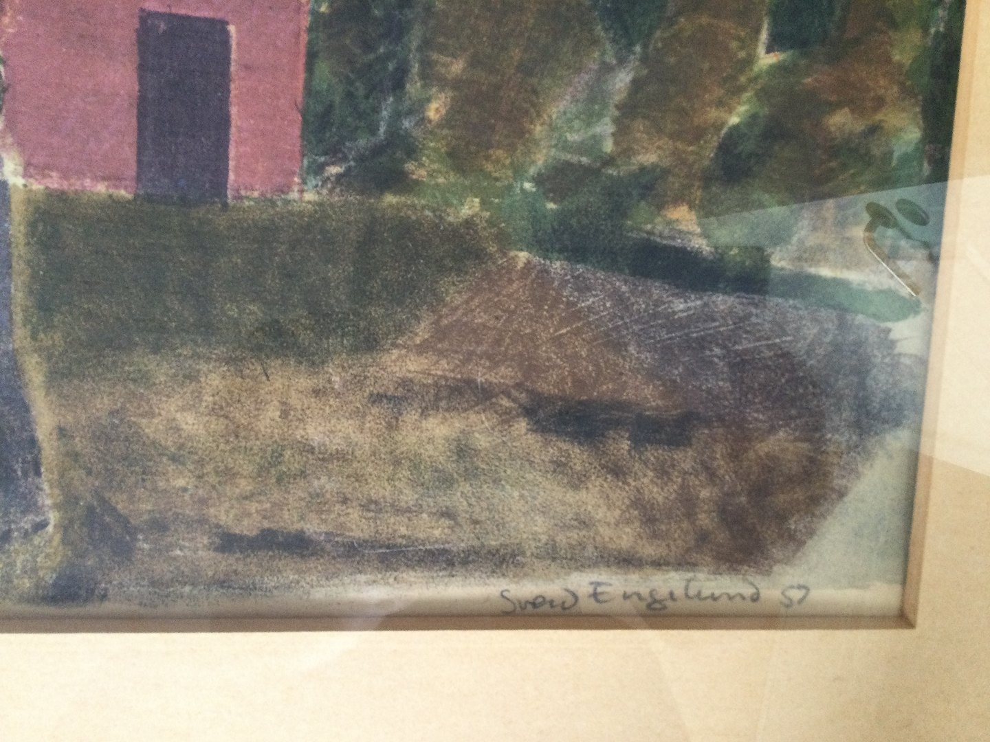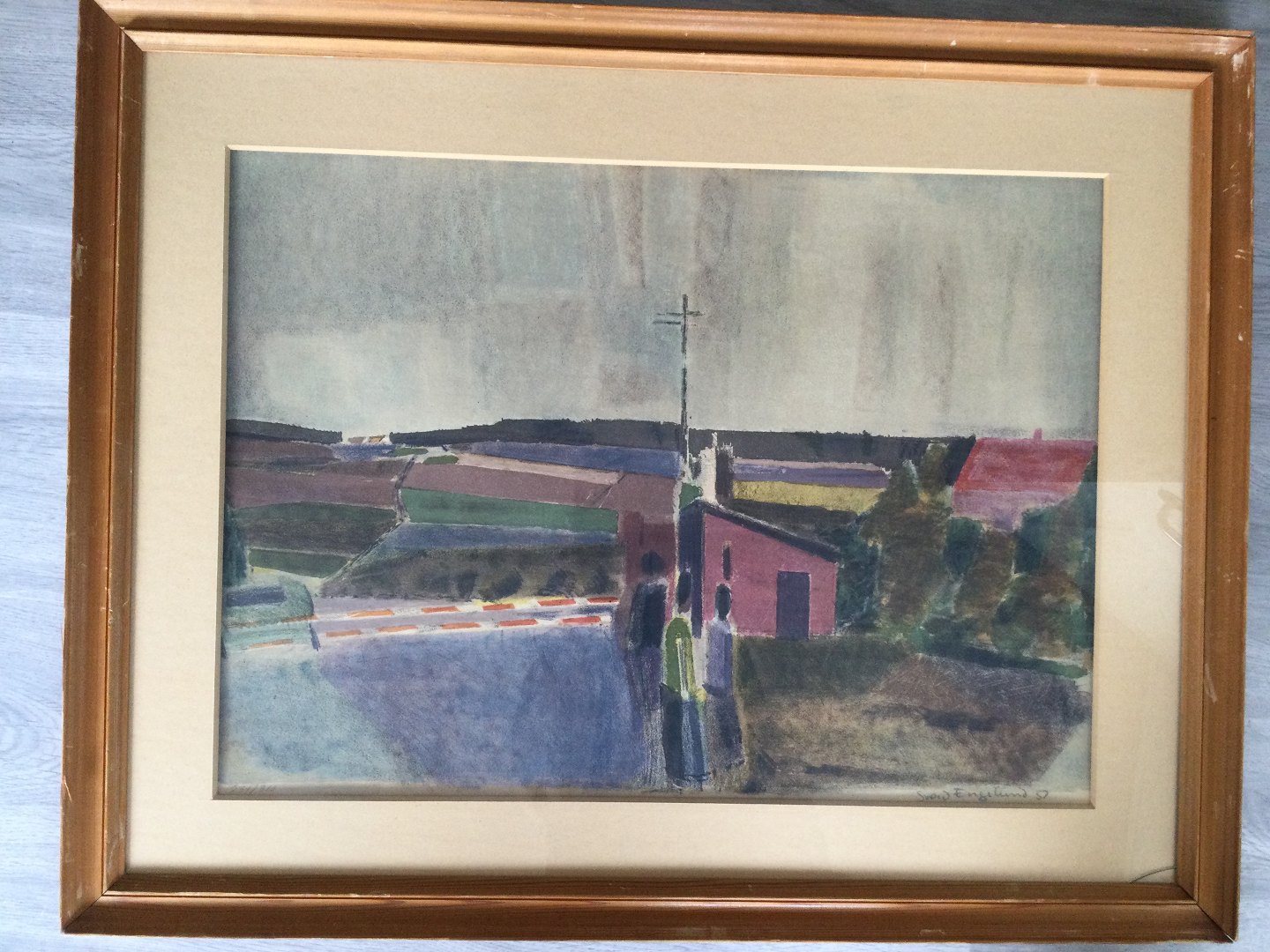 Farvelitografi af Svend Engelund - Personer ved hus i landskab 1957.
