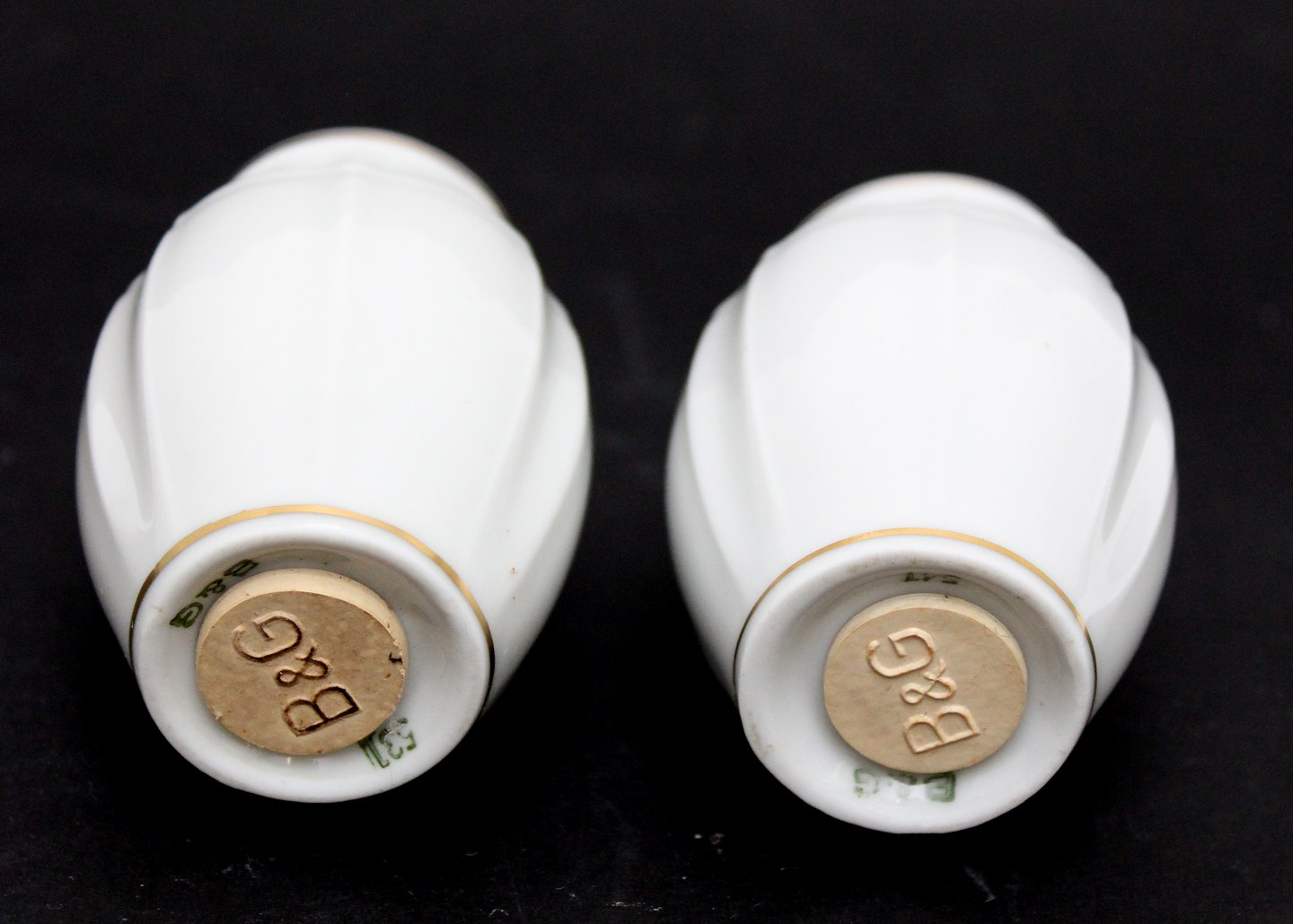 Bing & Grøndahl, Offenbach, Salt og Peber sæt. Hvidt kantet porcelæn med guld. Højde 7,5 cm. Salt og peber med original B&G propper. Pris: 375 kr. for sættet.2 nye gummipropper kan tilkøbes for 25 kr.