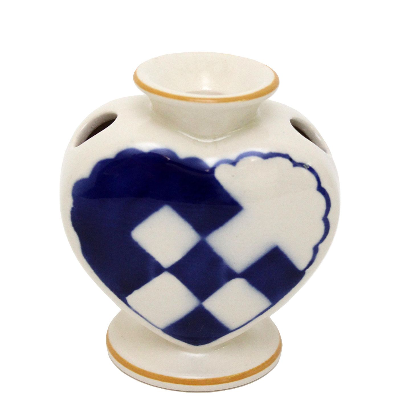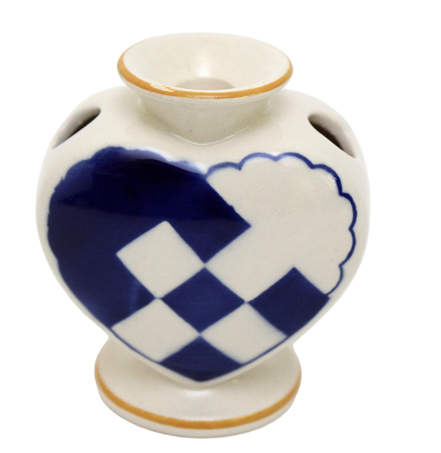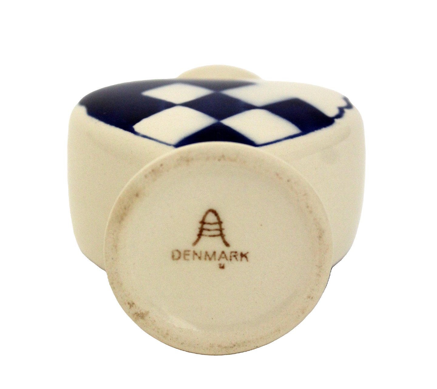 Aluminia, Blåt Julehjerte med gule kanter. Flot stand med få overfladekrakeleringer under kraven og manglende gul farve på kanten. Designet af Hans Henrik Hansen i 1944. Højde 7,7 cm. Bredde 7,6 cm. Pris: 1300 kr.