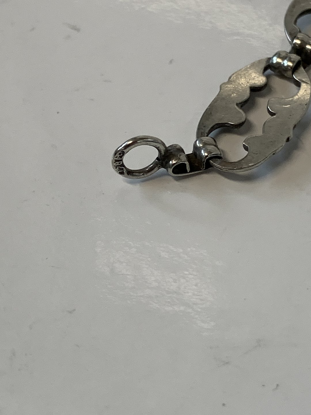 Smuk og elegant sølvhalskæde, udført i 830 sølv. Kæden har smukke detaljerede led, der giver halskæden et smukt feminint udseende. Sølvkæden kan især bruges til en flot kjole, men kan også bruges til en pæn skjorte.Stemplet 830