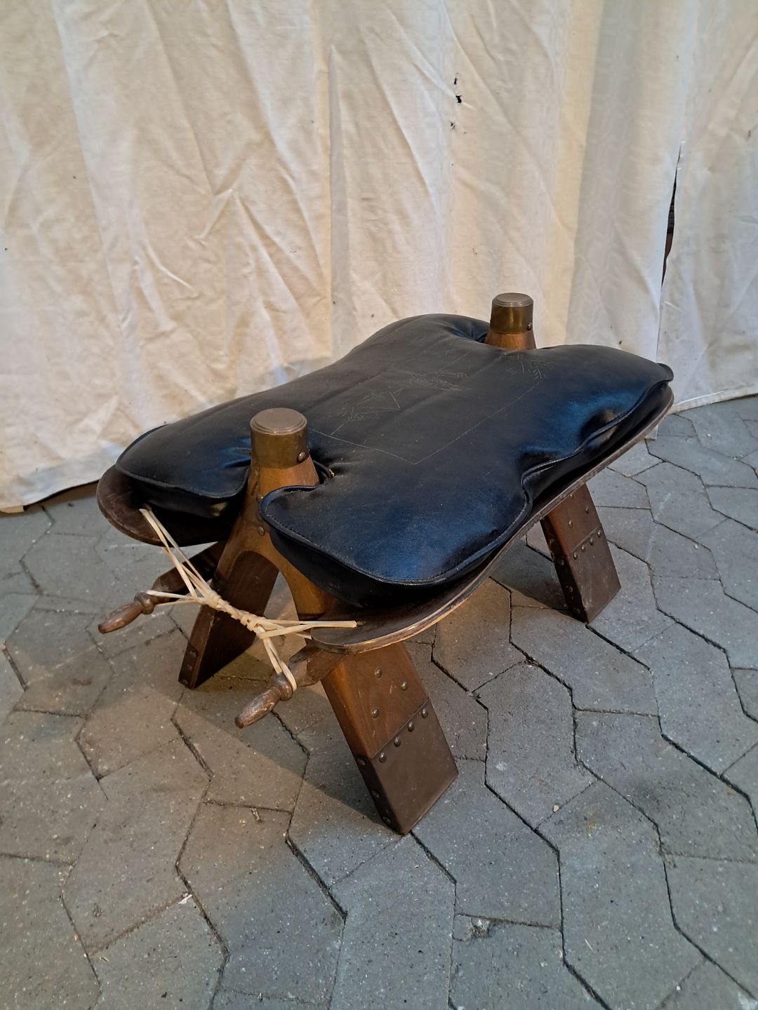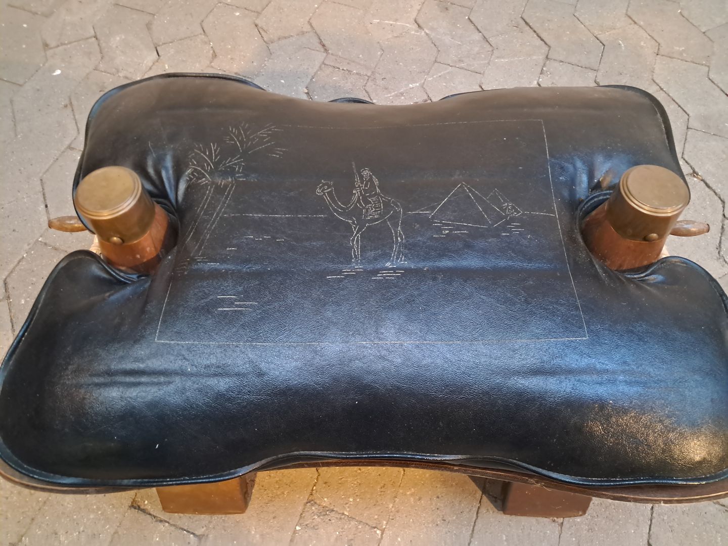 Skammel i massivt træ med kunstlæder hynde, fra 1980erne.Den har brugsspor.