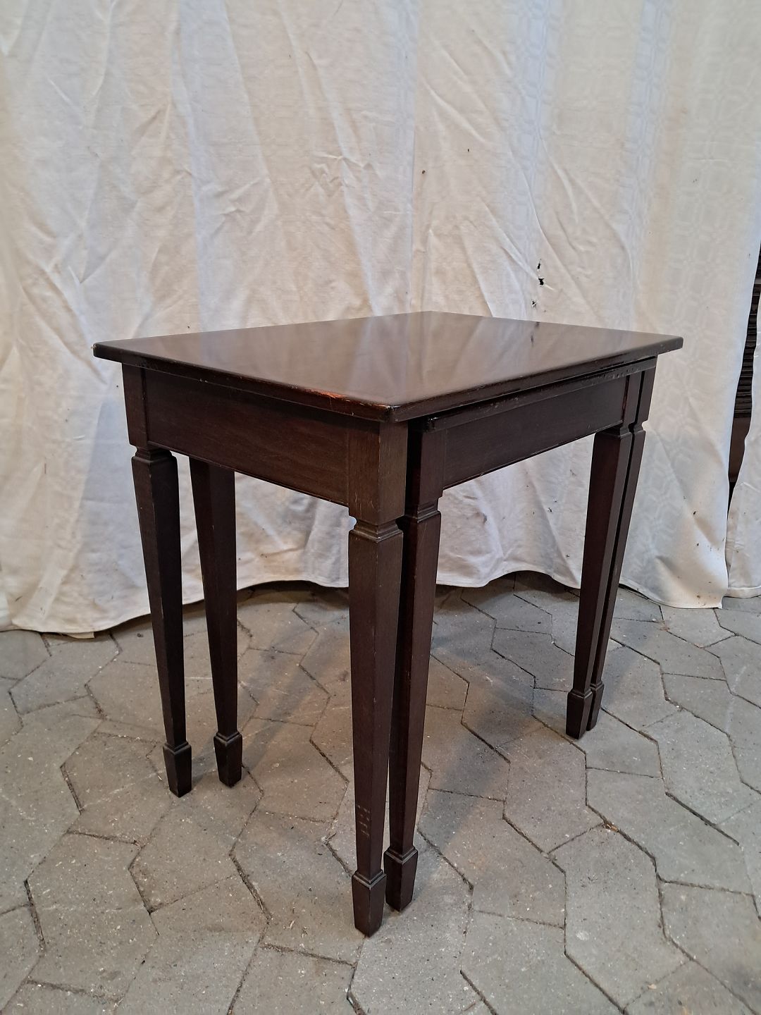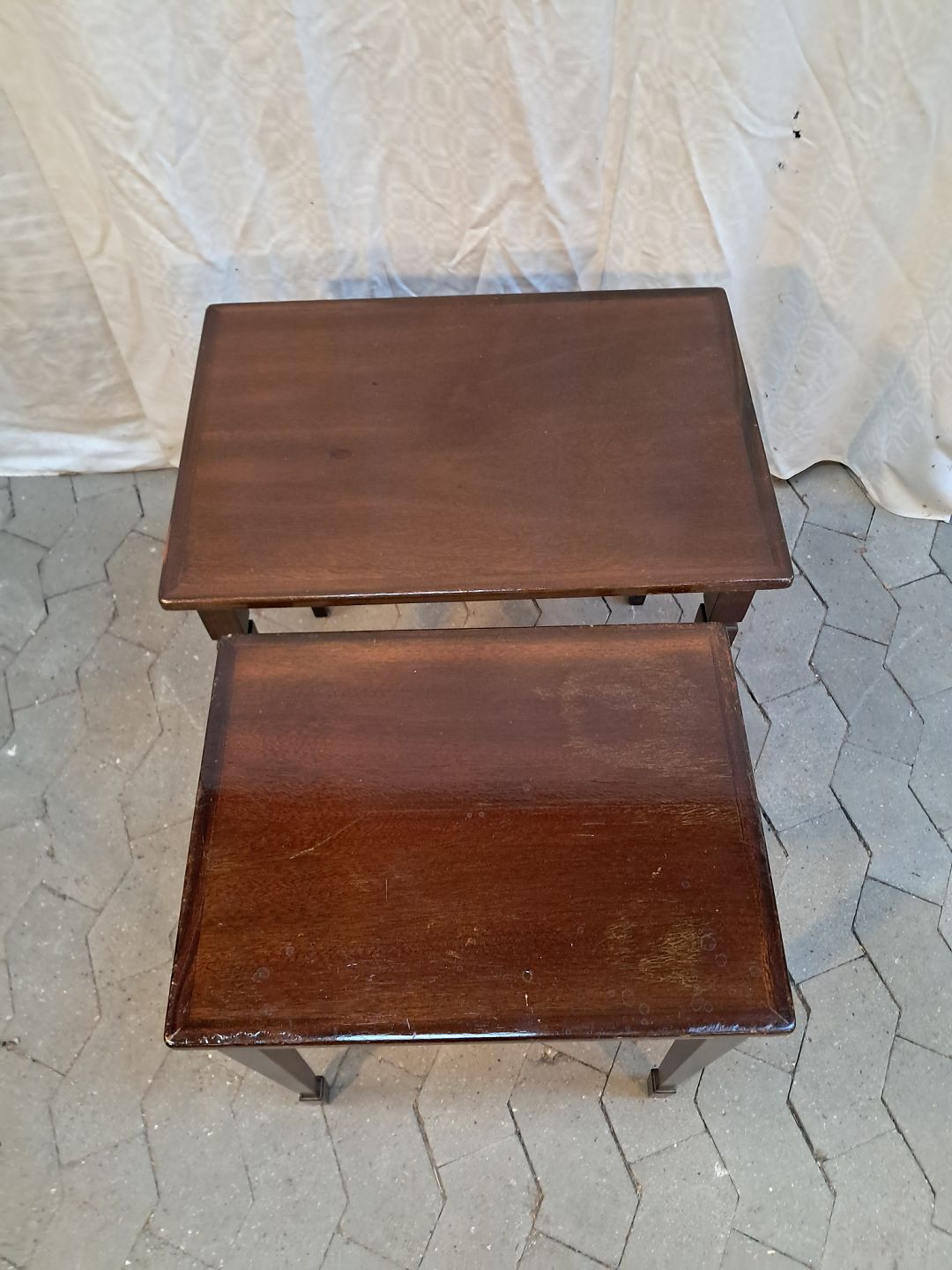 2 Indskudsborde i fineret mahogni, fra 1980erne.De har brugsspor.