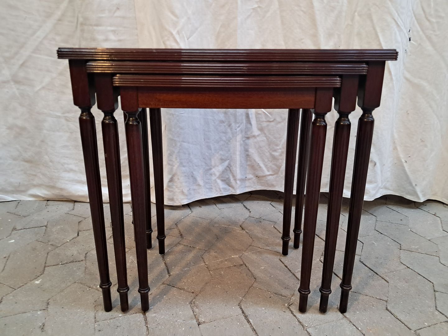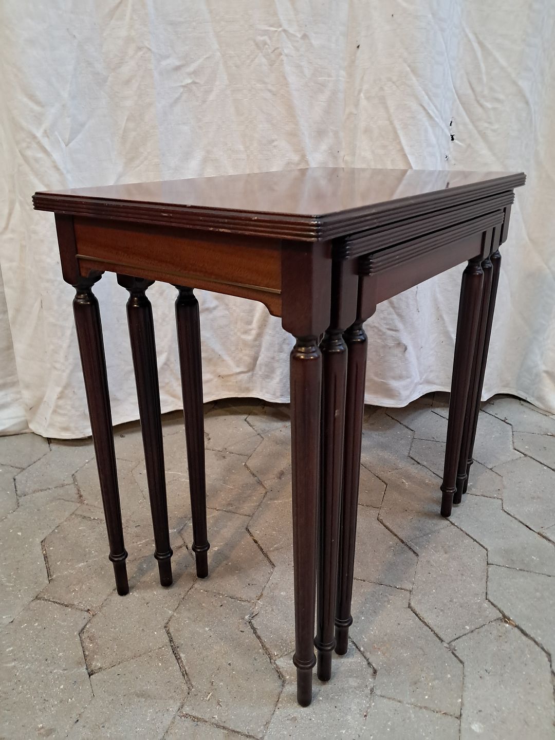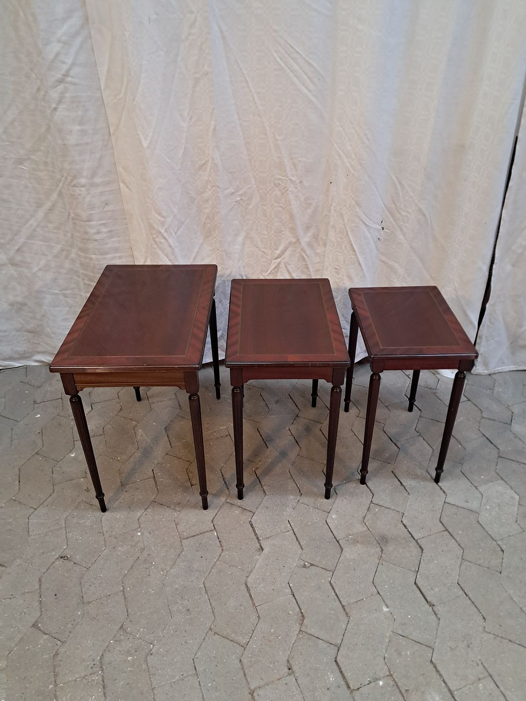 3 Indskudsborde i fineret mahogni, fra 1980erne.De har små brugsspor.