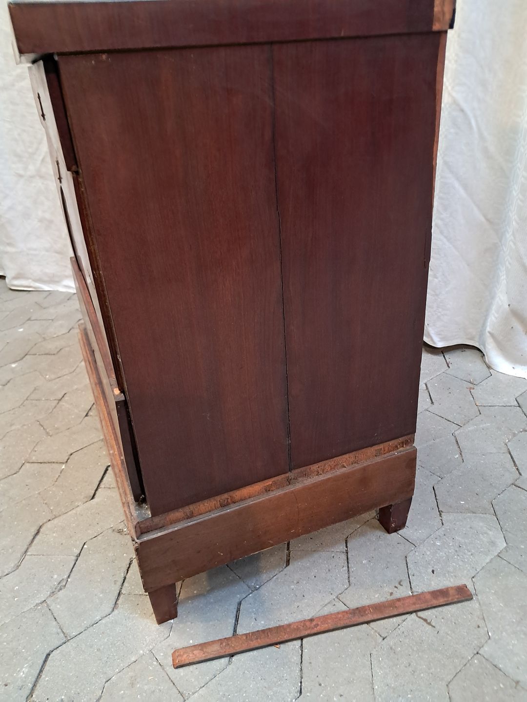 Kommodei fineret mahogni, fra 1910erne.Den har brugsspor og skufferne køre dårligt/trænger til service.