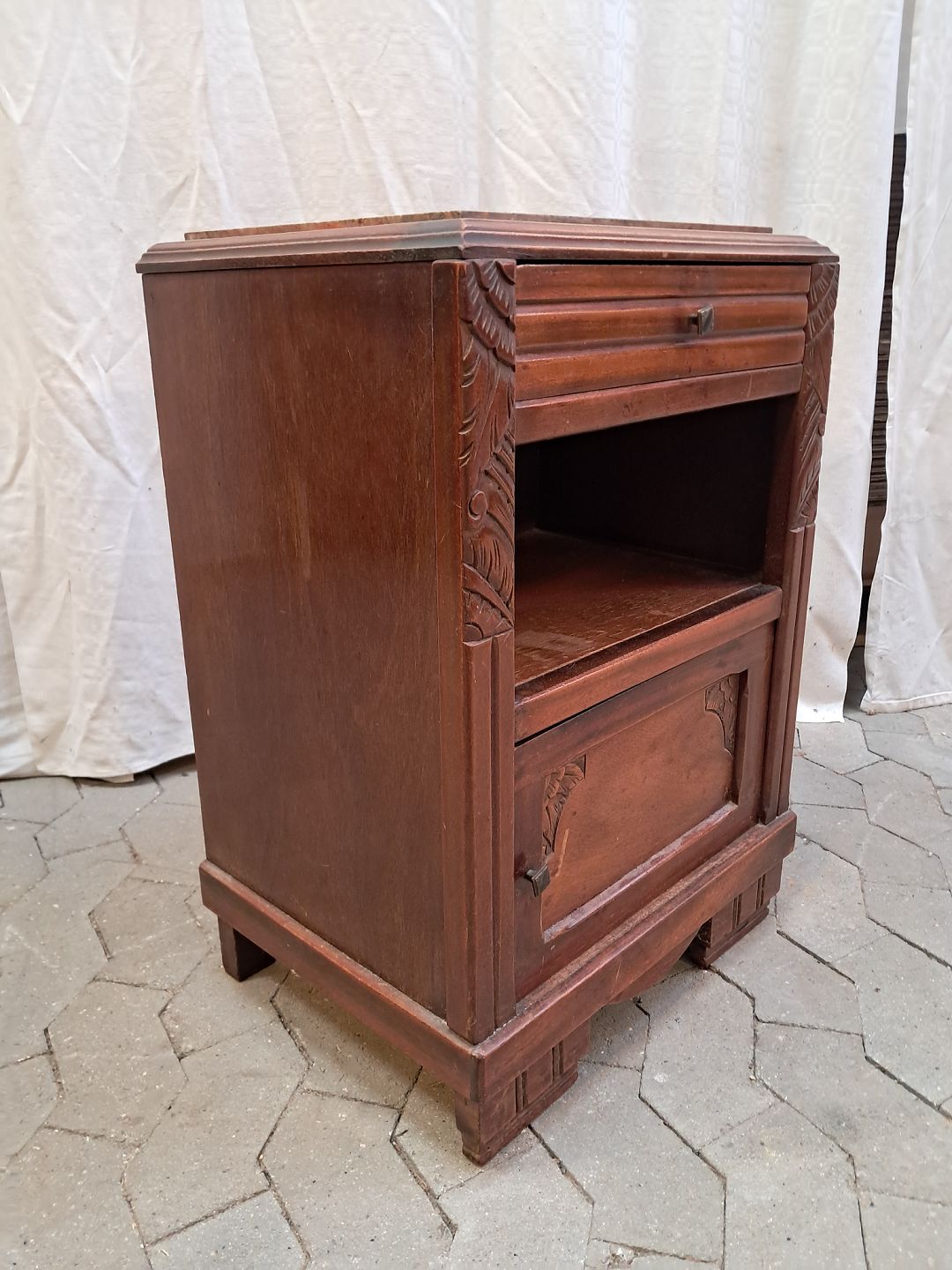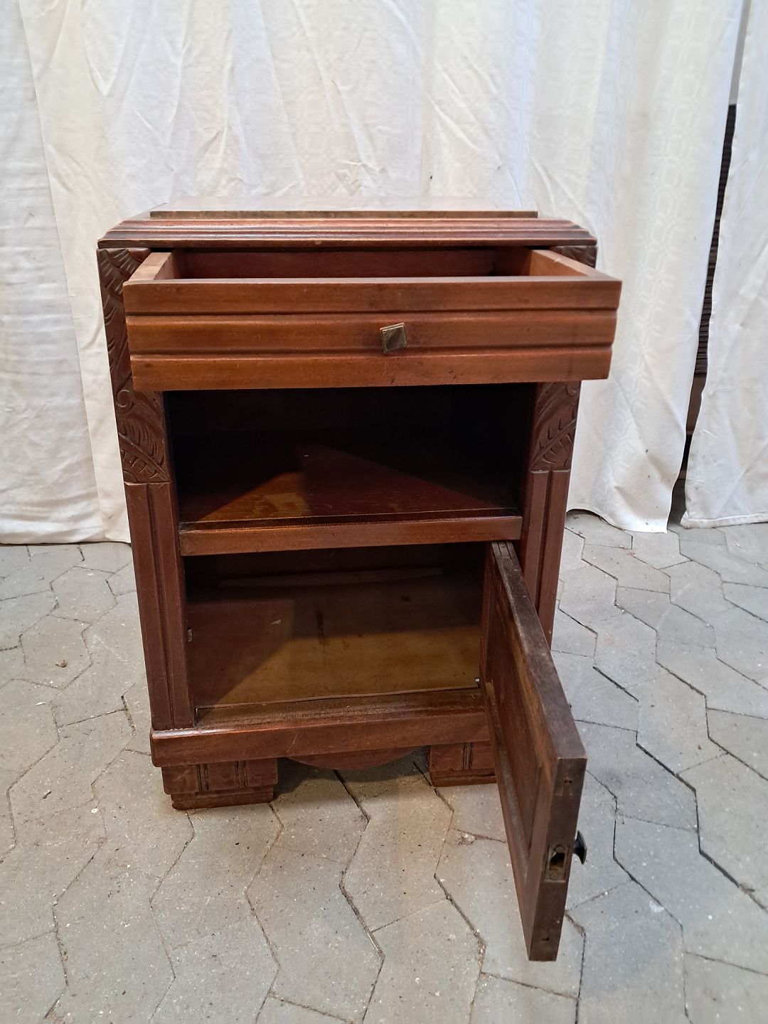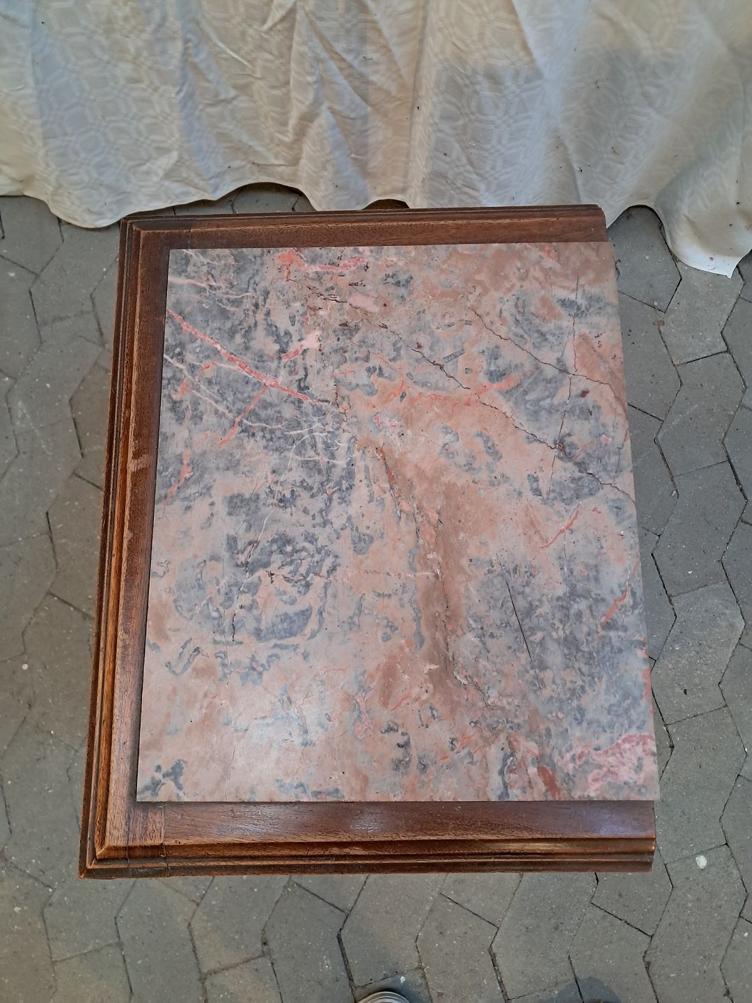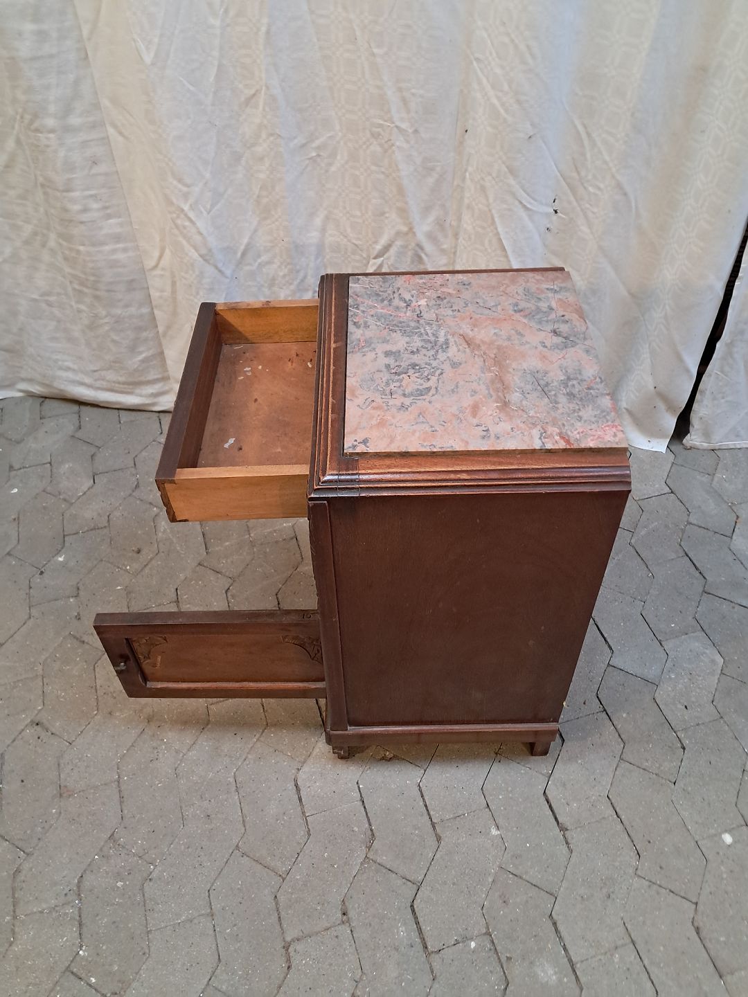 Lille skab i mahogni med marmorplade, fra 1910erne.Det har brugsspor.