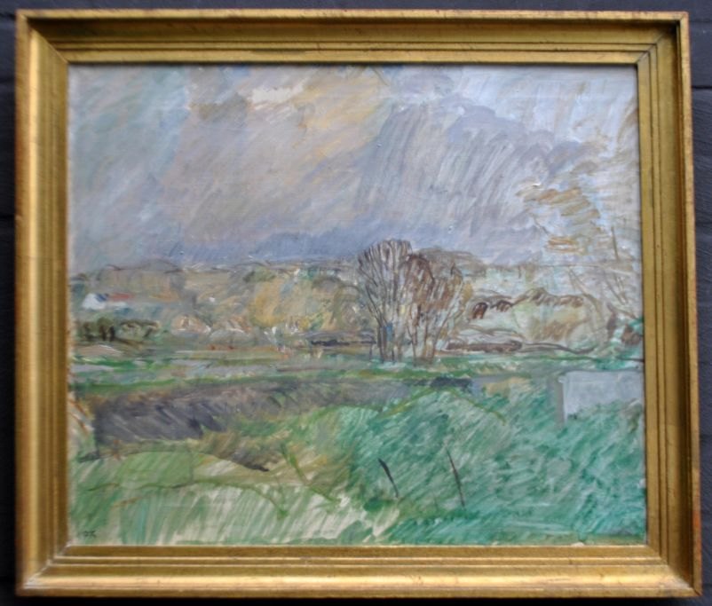 Kielberg, Ole (1911 - 1985) Dänemark: Mailandschaft - Daugløkke, 1962-63. Öl auf Leinwand. Signiert: OK. Auf der Rückseite signiert: Ole Kielberg Daugløkke 1962-3. H: 46 cm. B: 55 cm.Gerahmt: H: 52,5 cm. B: 62 cm.