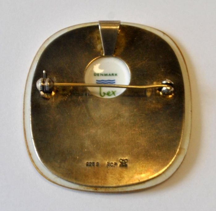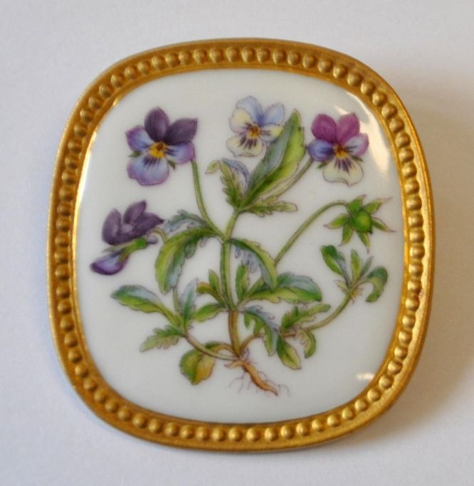 Michelsen für Royal Copenhagen. Brosche/Anhänger "Flora Danica" aus Porzellan und Sterlingsilber, 20. Jahrhundert. Handgemalte Blumendekorationen und Vergoldung. Gestempelt. 5 x 4,5 cm.<br /><br />Bestellnummer: 28041
