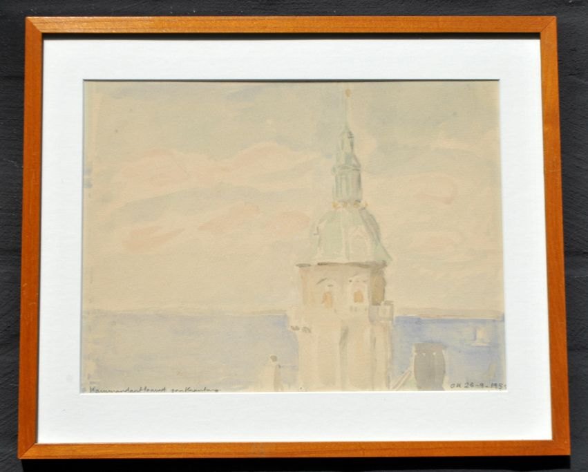 Kielberg, Ole (1911 - 1985) Dänemark: Der Kommandantenturm in Kronborg, 1951. Aquarell auf Papier. Signiert: OK 26-9-1951. H: 23,5 cm. B: 31,5 cm.Gerahmt: H: 33 cm. B: 40 cm.
