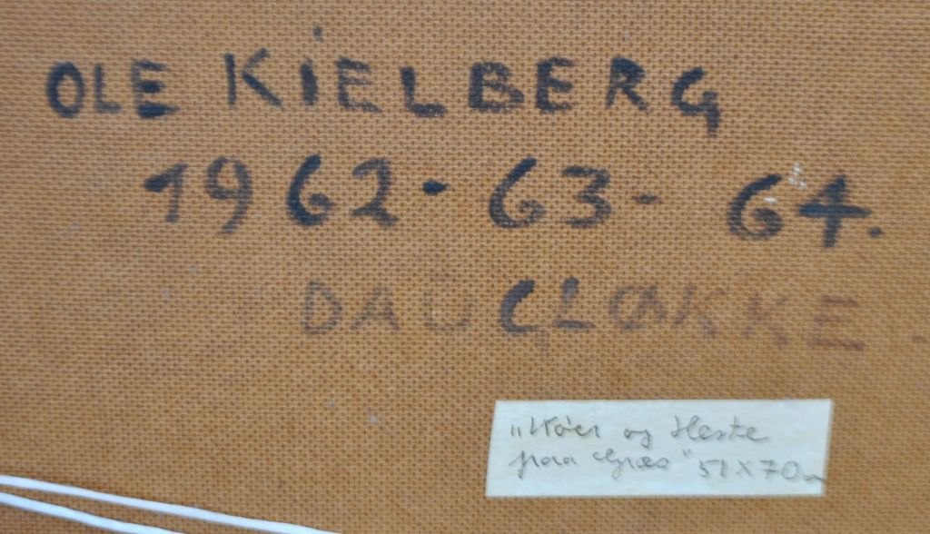 Kielberg, Ole (1911 - 1985) Dänemark: Kühe und Pferde auf der Weide, 1962-64. Öl auf Leinwand. Signiert: OK und auf der Rückseite: Ole Kielberg 1962-63-64 Daugløkke. H: 51 cm. B: 70 cm.Gerahmt: H: 60,5 cm. B: 80 cm.