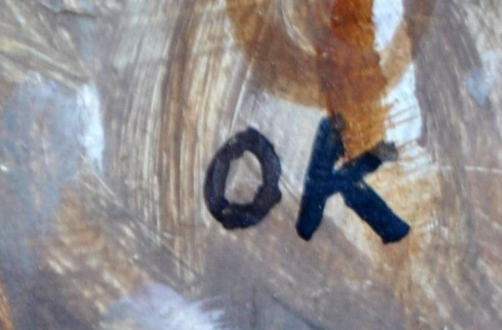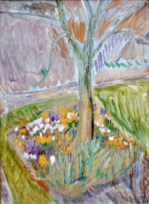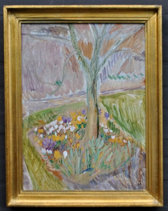 Kielberg, Ole (1911 - 1985) Dänemark: Krokusbett, 1954-60. Öl auf Hartfaserplatte. Signiert: OK und auf der Rückseite: Ole Kielberg Daugløkke 1954-60. H: 48 cm. B: 36 cm.Gerahmt: H: 56 cm. B: 44 cm.