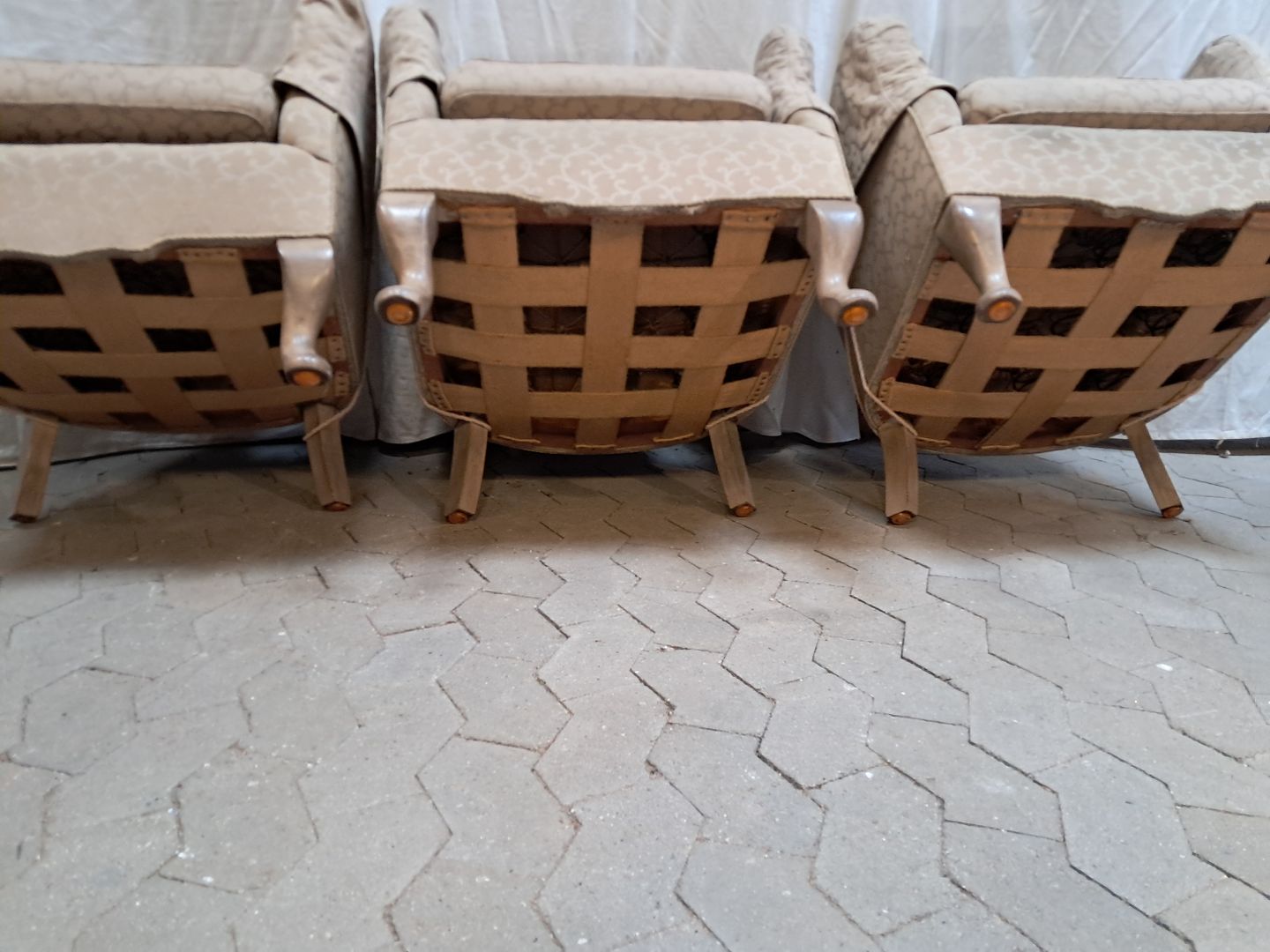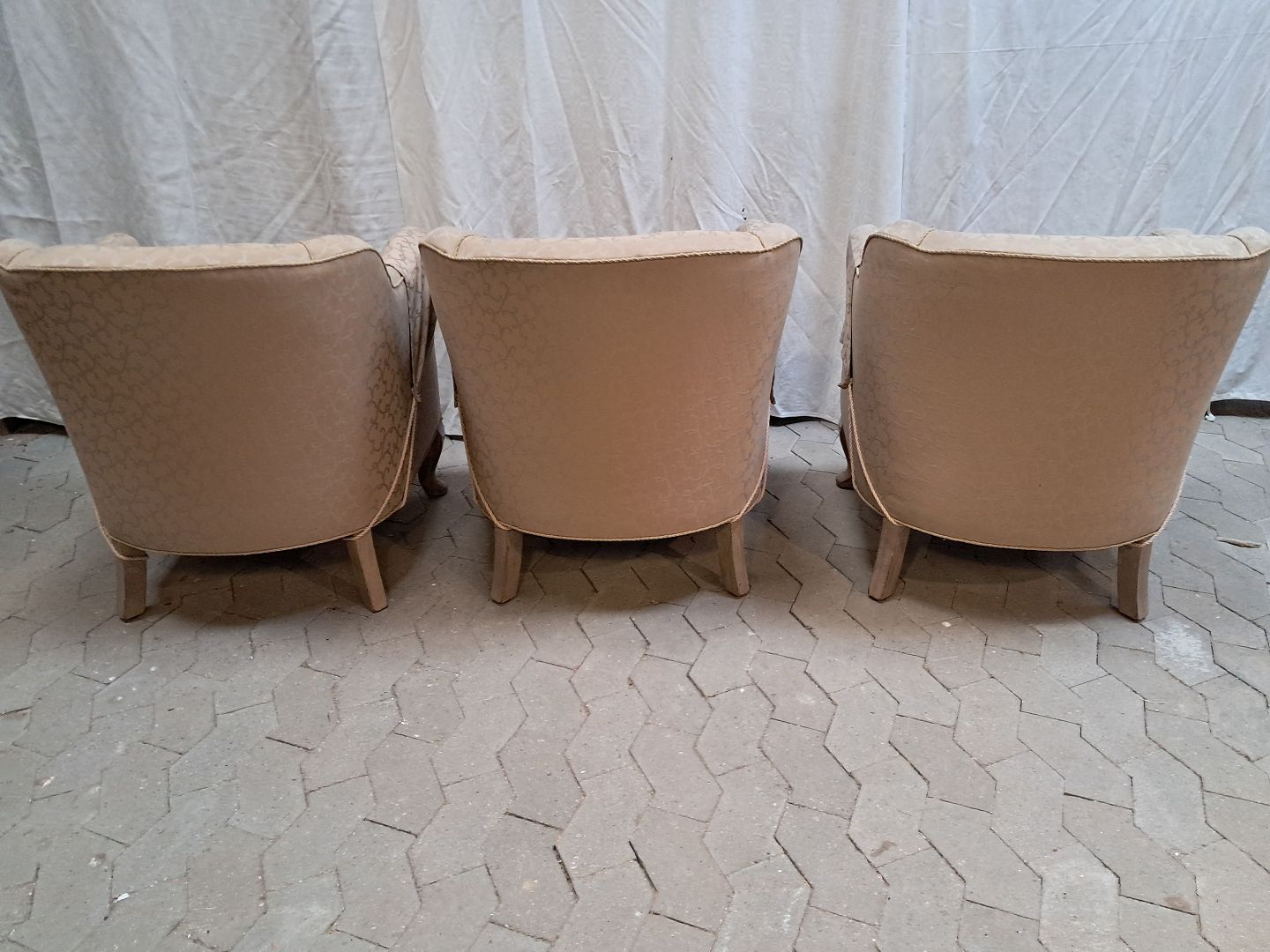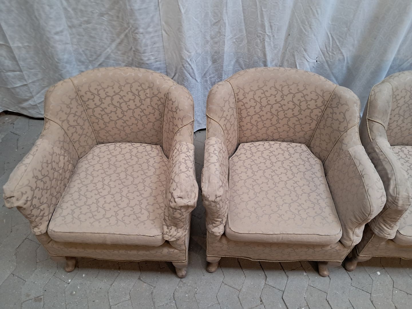 3 Lænestole med stofbetræk, fra 1920erne.De har brugsspor.