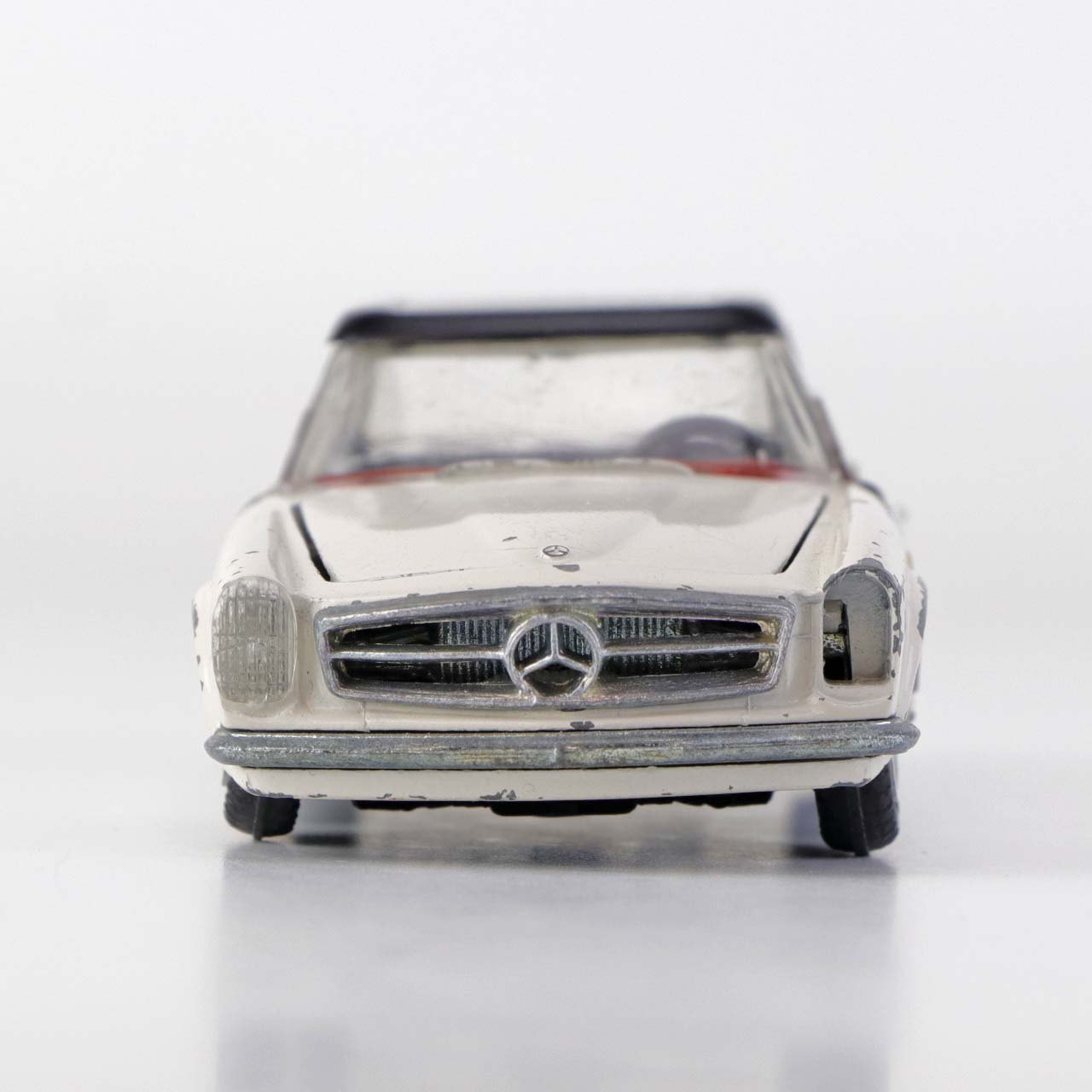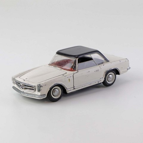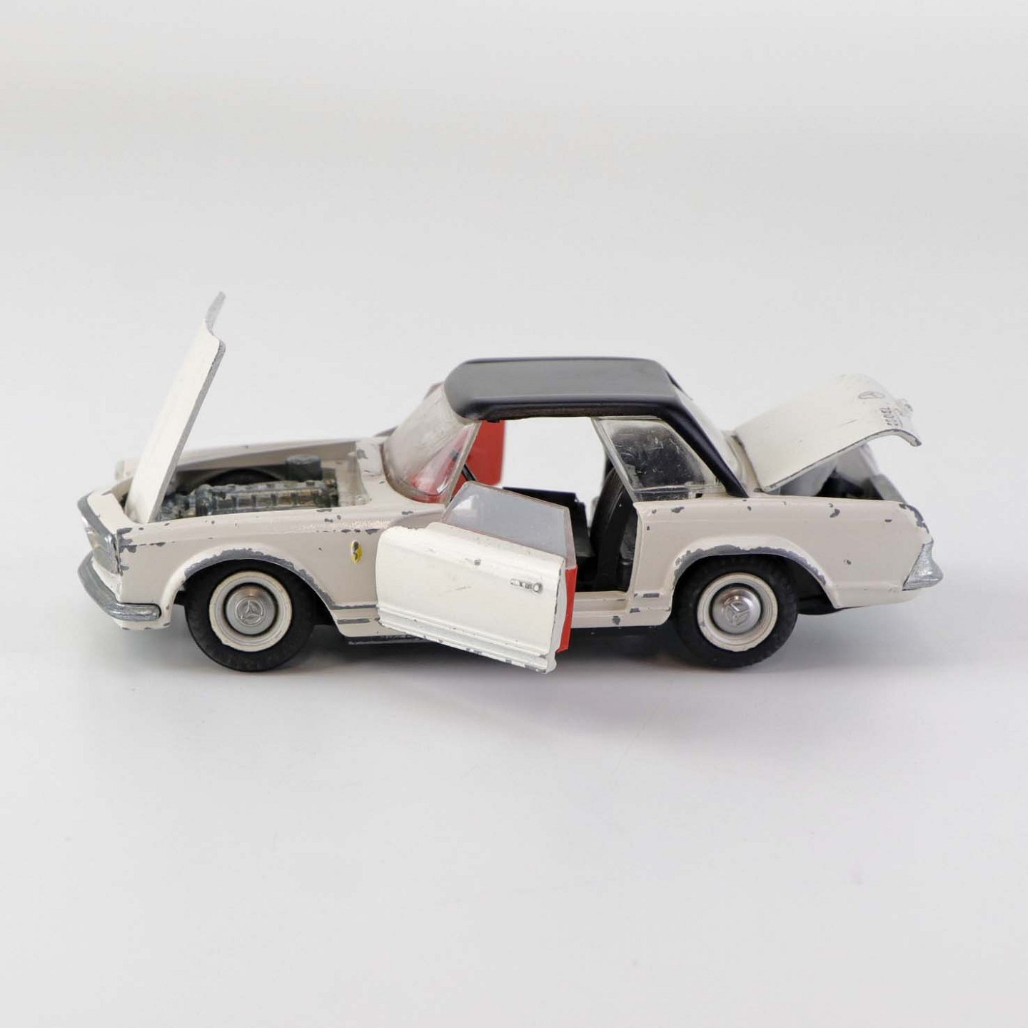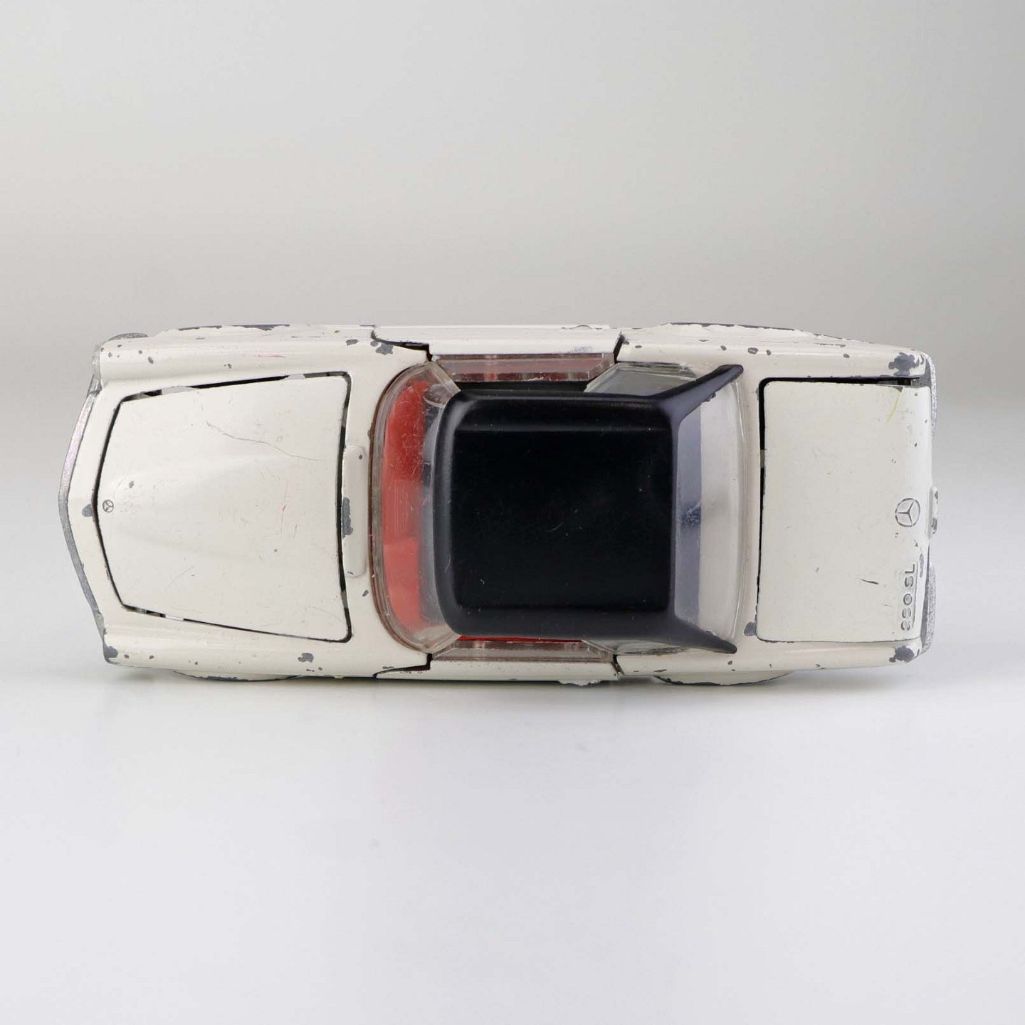 Hvid Mercedes-Benz 280 SL legetøjsbil med sort tag i lakeret metal med gummi hjul. Motorhjelm, bagklap og begge frontdører kan åbnes.Producent Tekno, Denmark