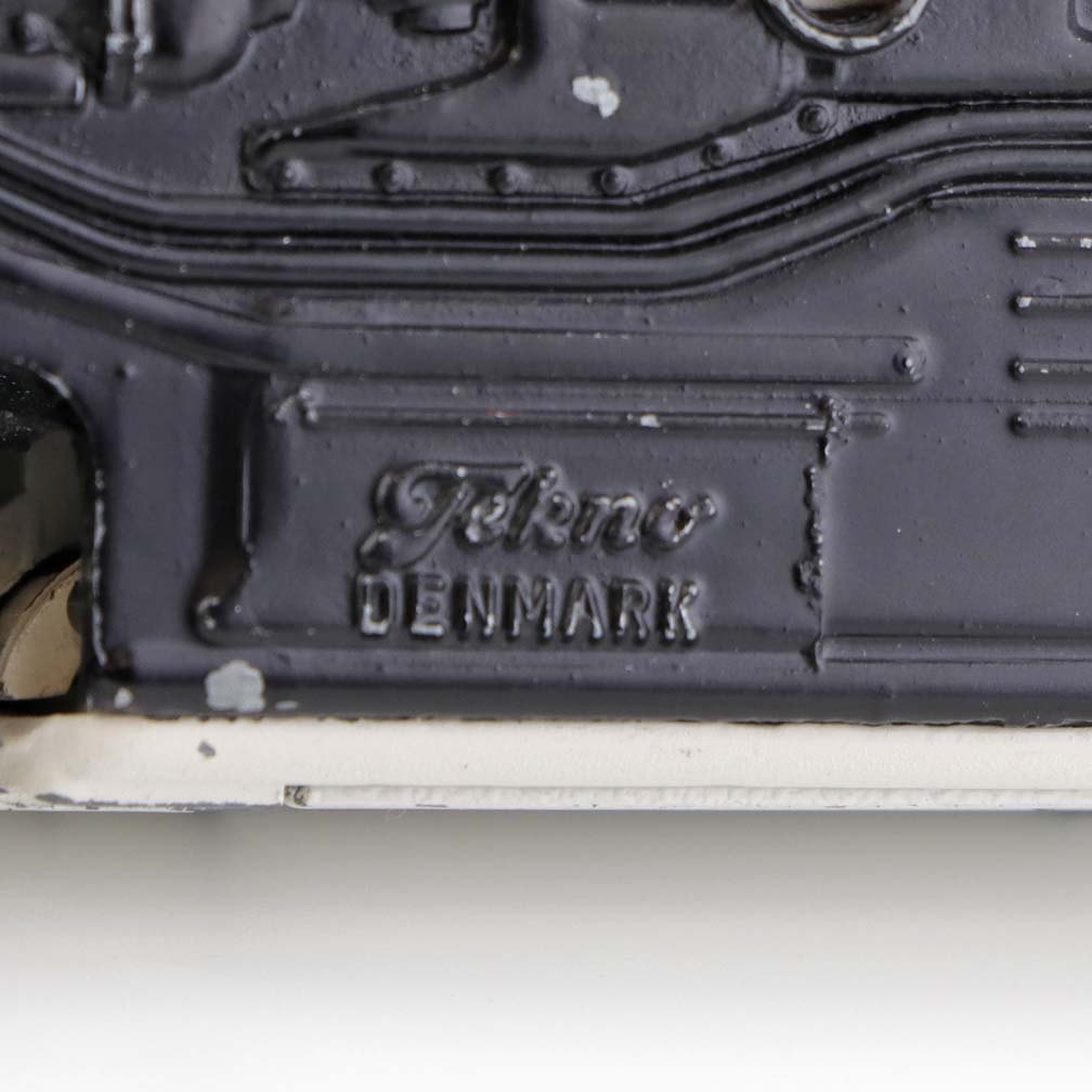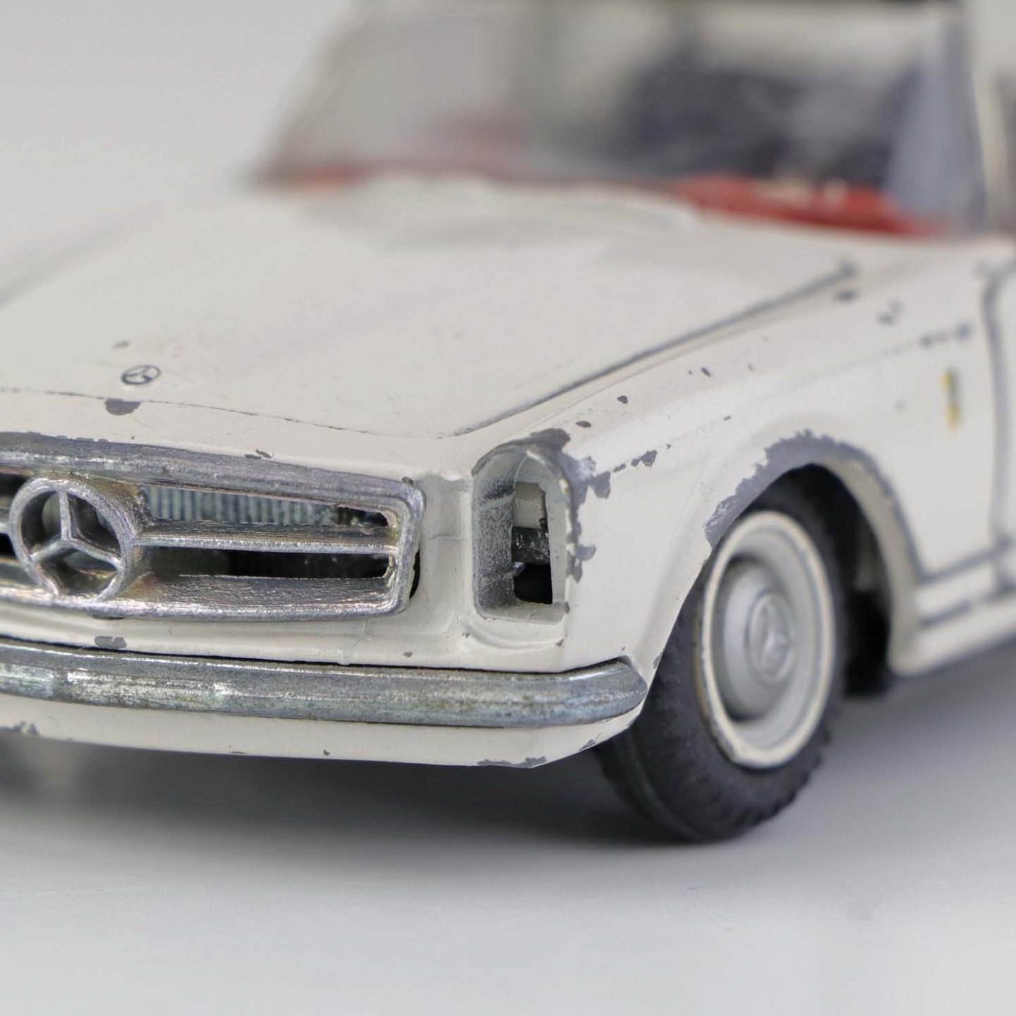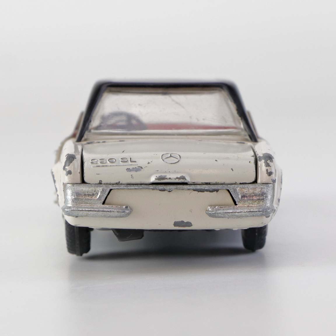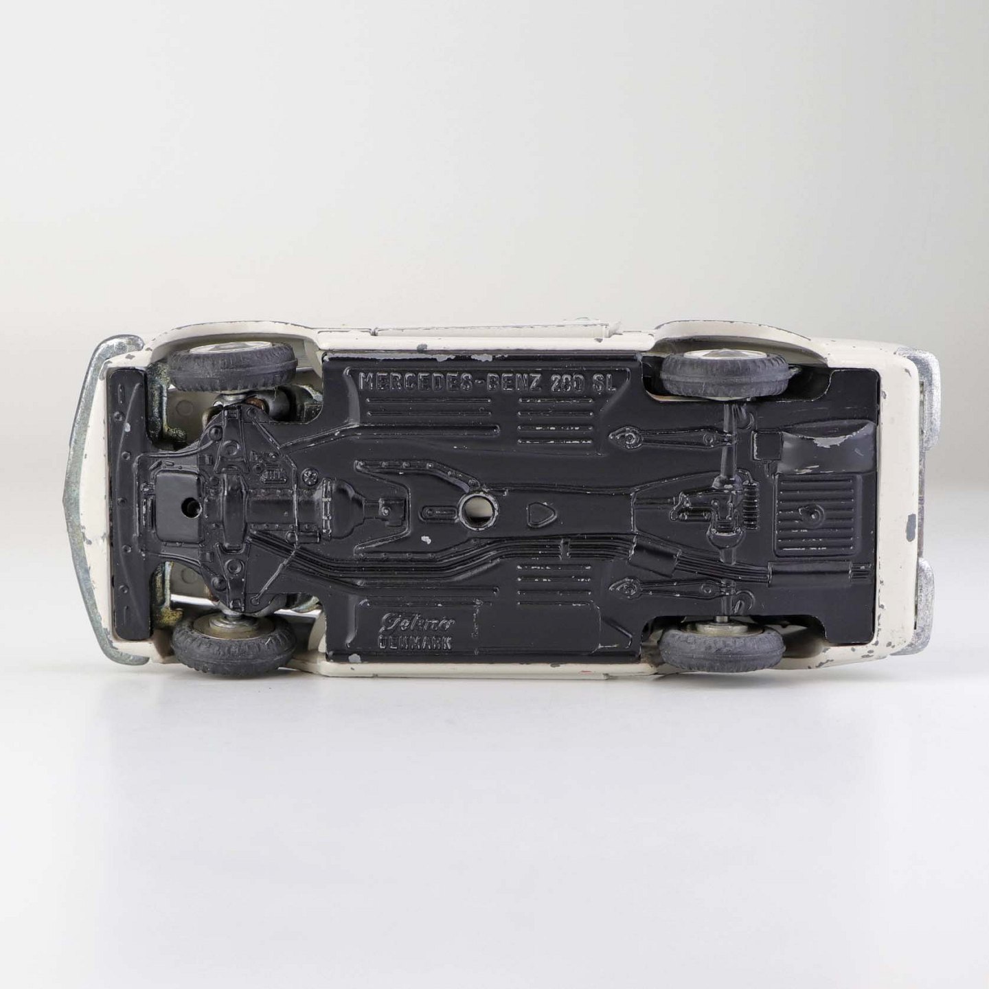 Hvid Mercedes-Benz 280 SL legetøjsbil med sort tag i lakeret metal med gummi hjul. Motorhjelm, bagklap og begge frontdører kan åbnes.Producent Tekno, Denmark