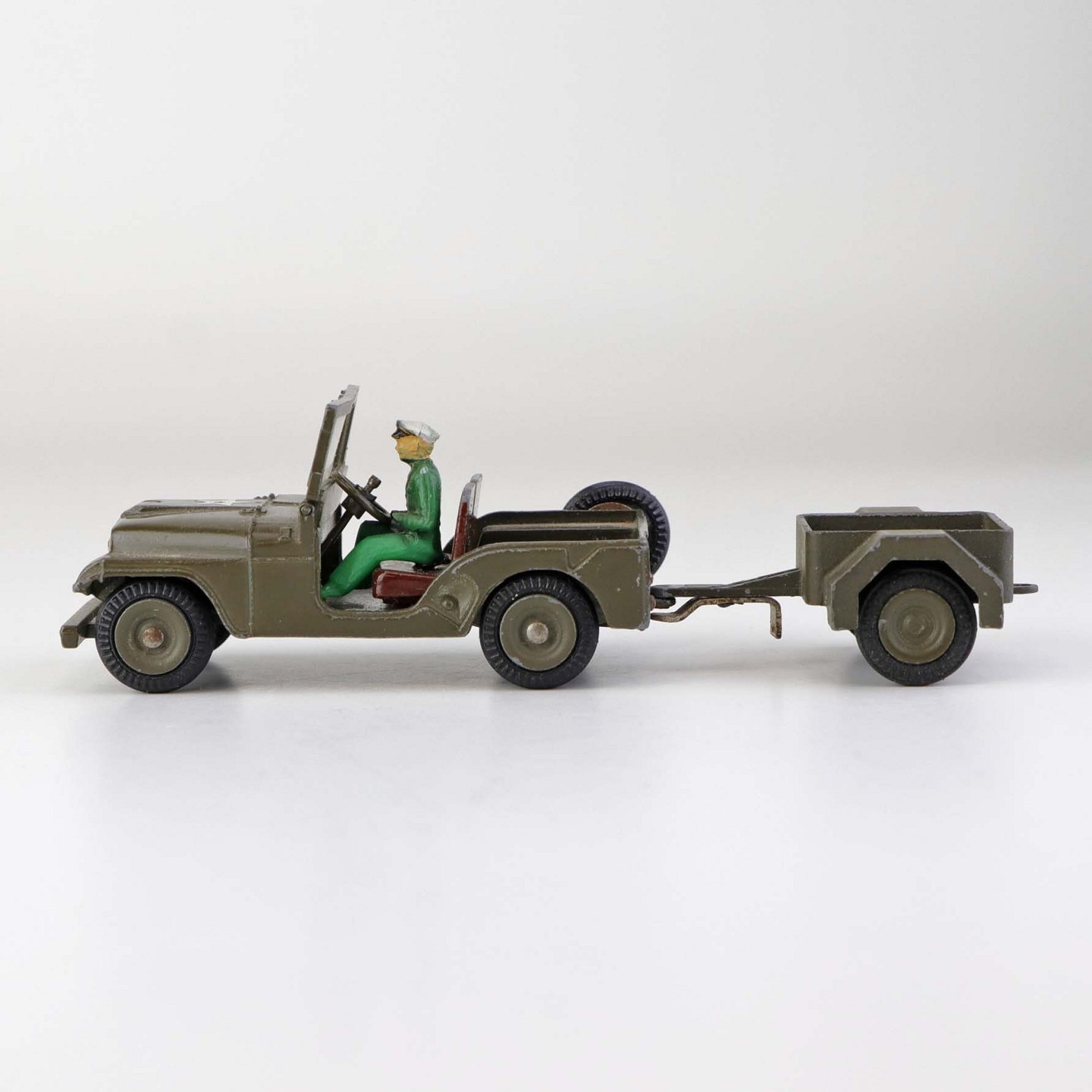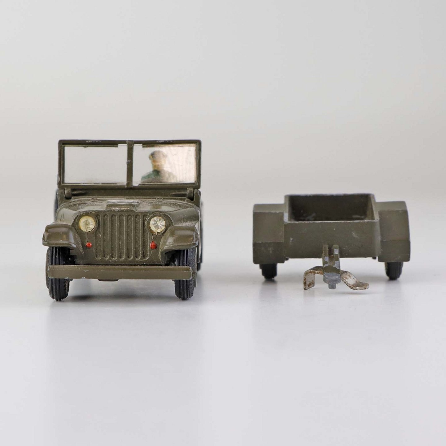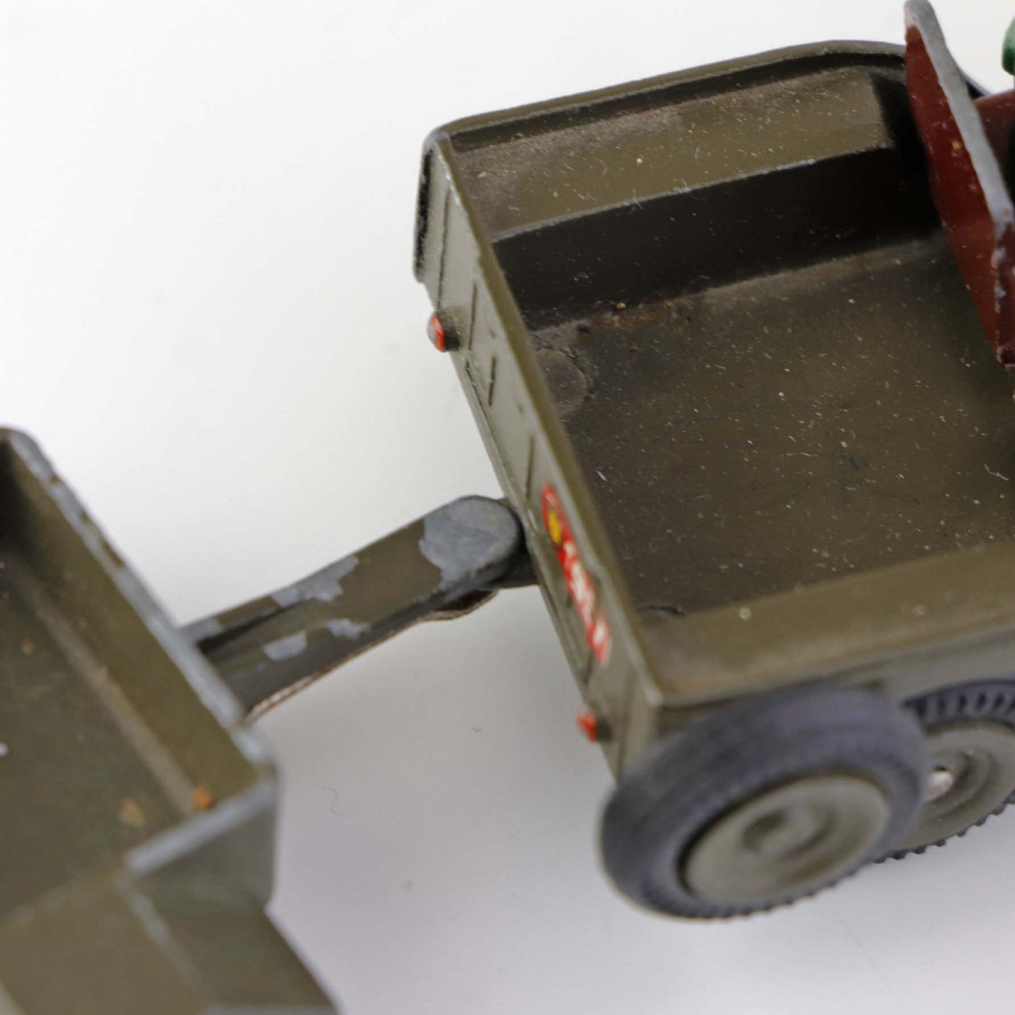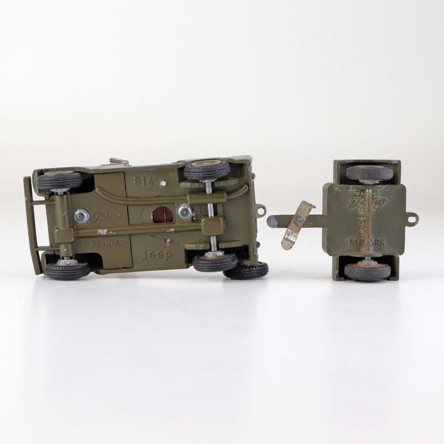 Legetøjsbil model Jeep med påhængstrailer og mand bag rattet i lakeret flaskegrøn metal med gummi hjul. Mærket 1957. Nr. 814Producent Tekno, Denmark