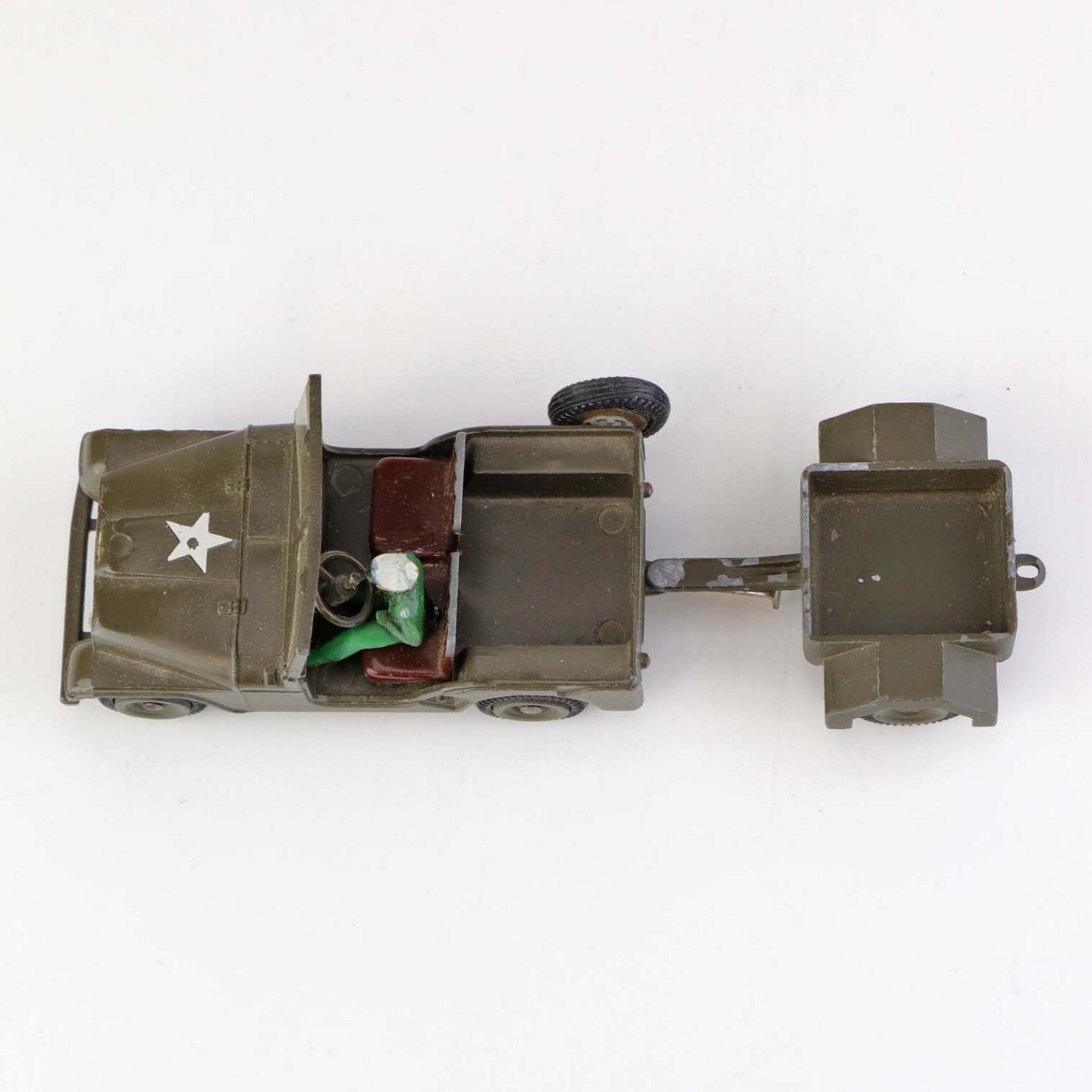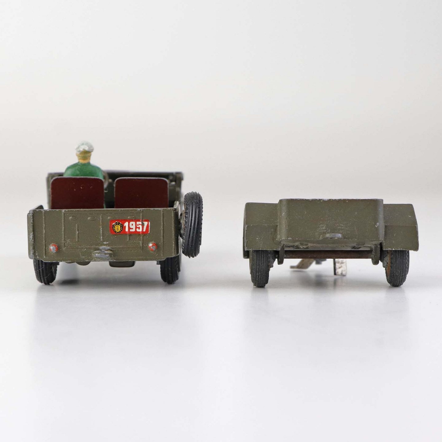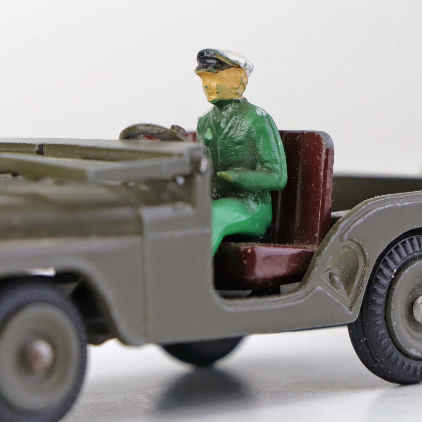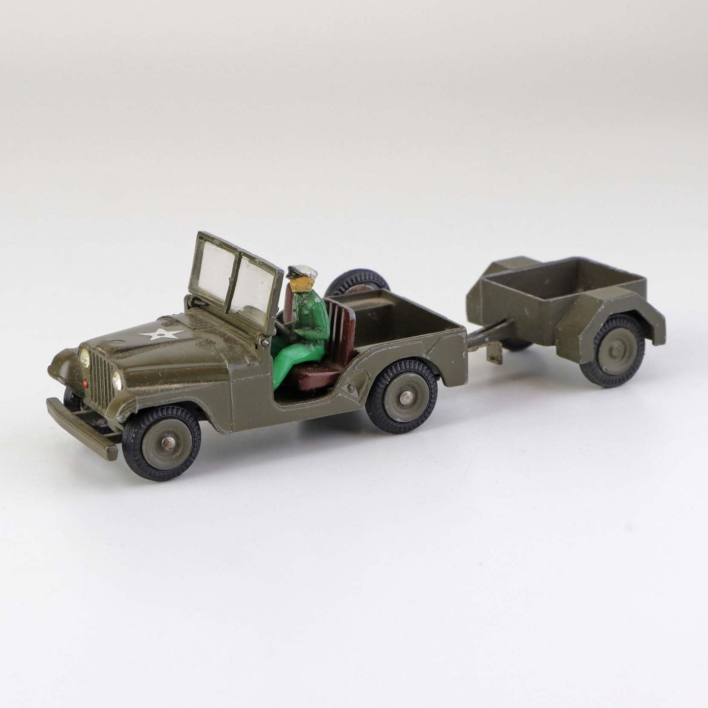 Legetøjsbil model Jeep med påhængstrailer og mand bag rattet i lakeret flaskegrøn metal med gummi hjul. Mærket 1957. Nr. 814Producent Tekno, Denmark