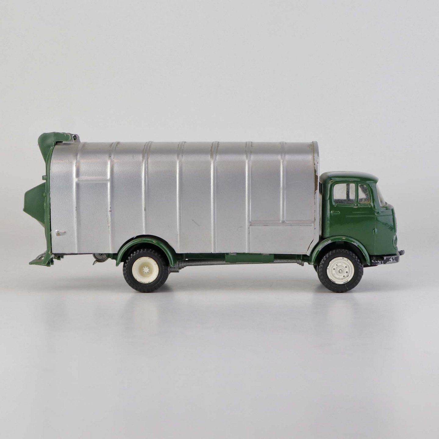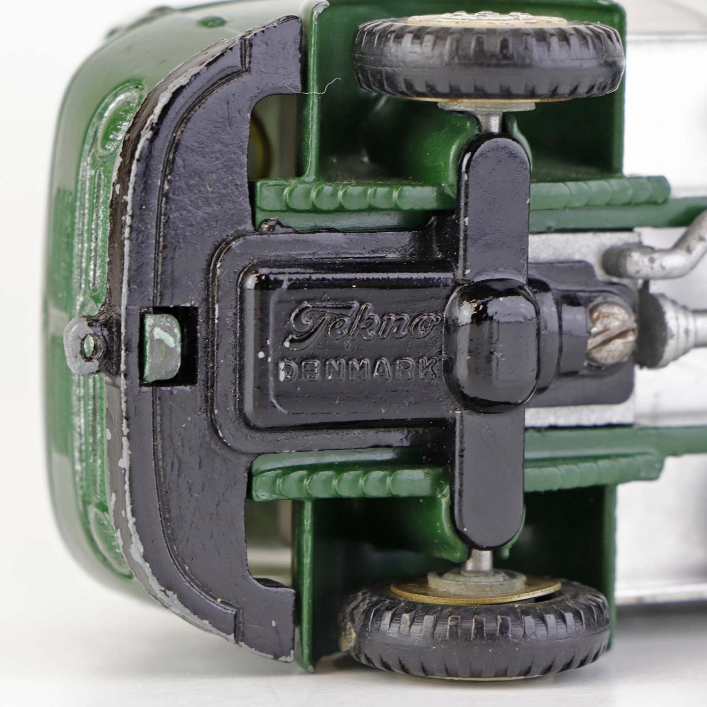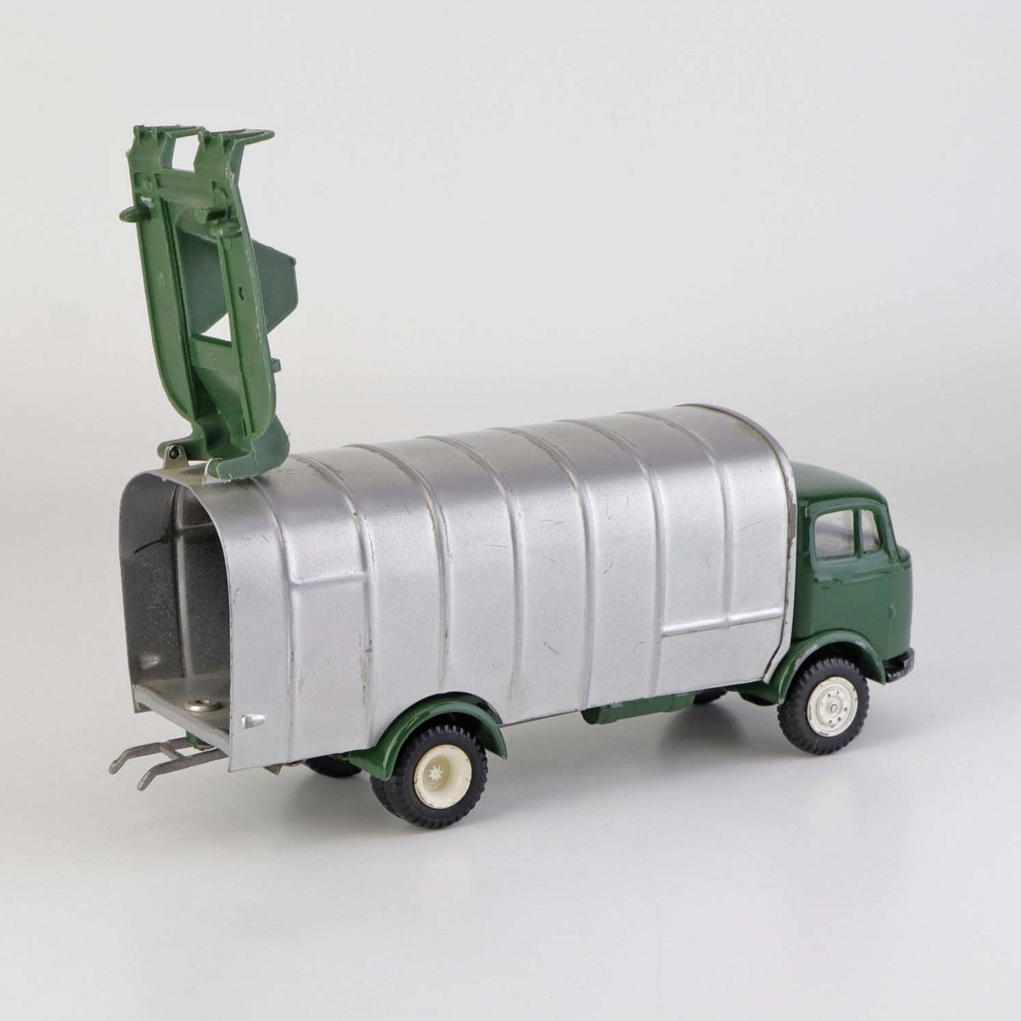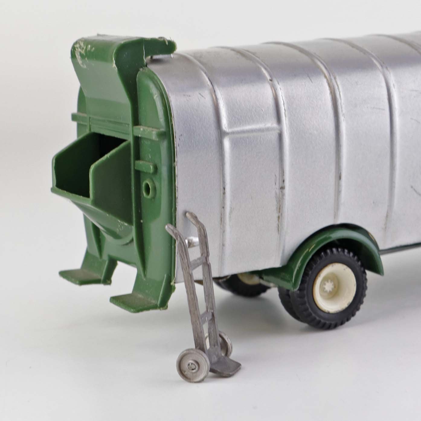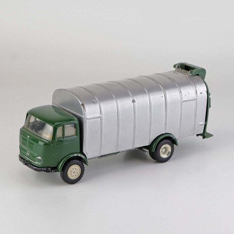 Legetøjsbil. Affaldsbil med sækkevogn i lakeret metal med gummi hjul. Producent Tekno, Denmark