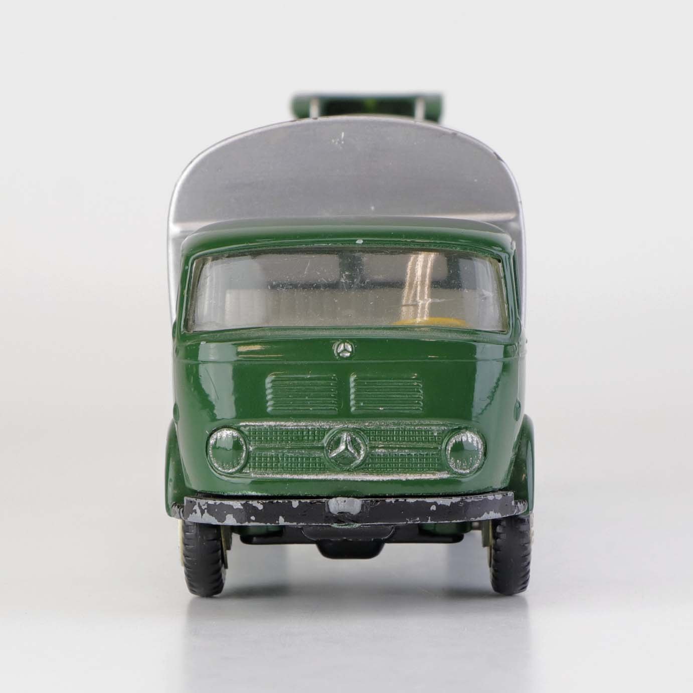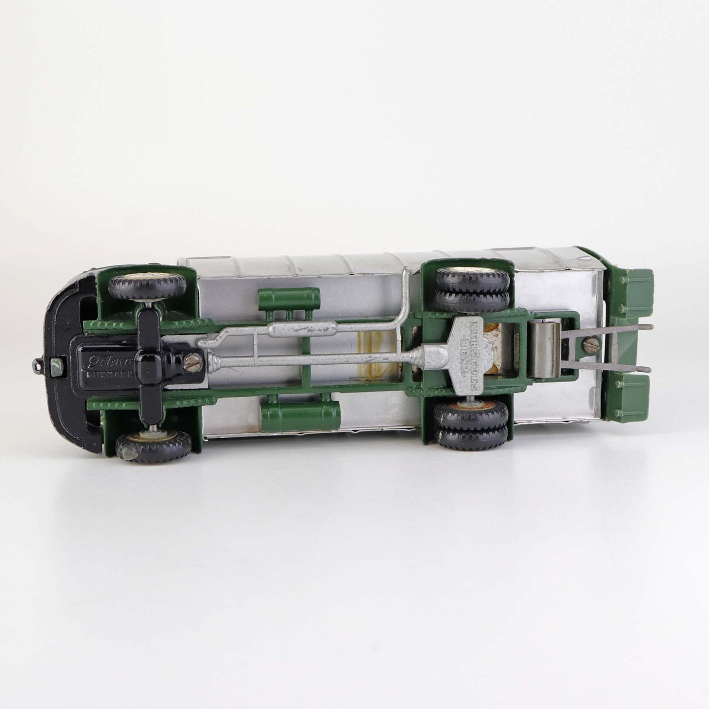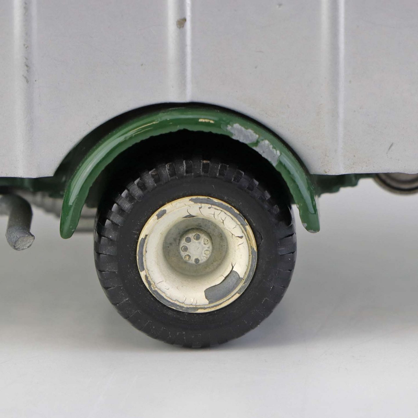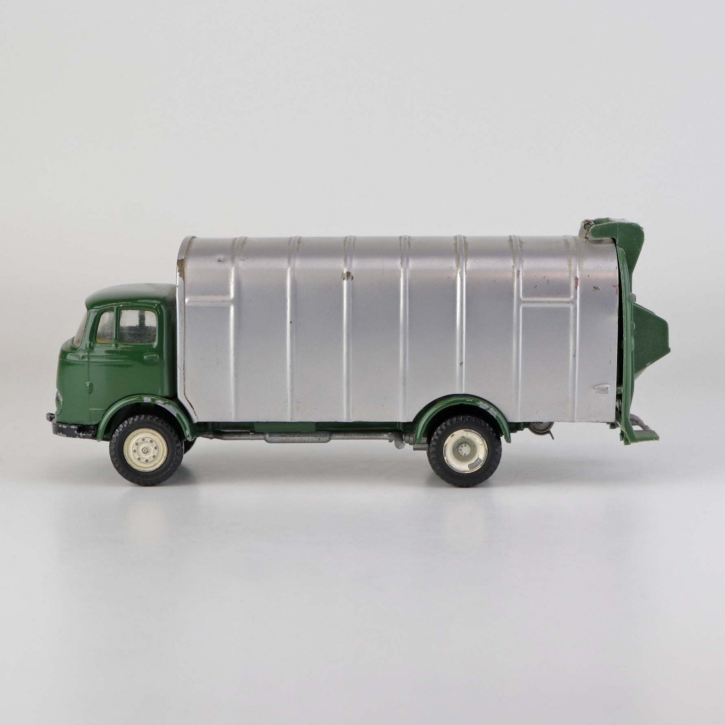 Legetøjsbil. Affaldsbil med sækkevogn i lakeret metal med gummi hjul. Producent Tekno, Denmark