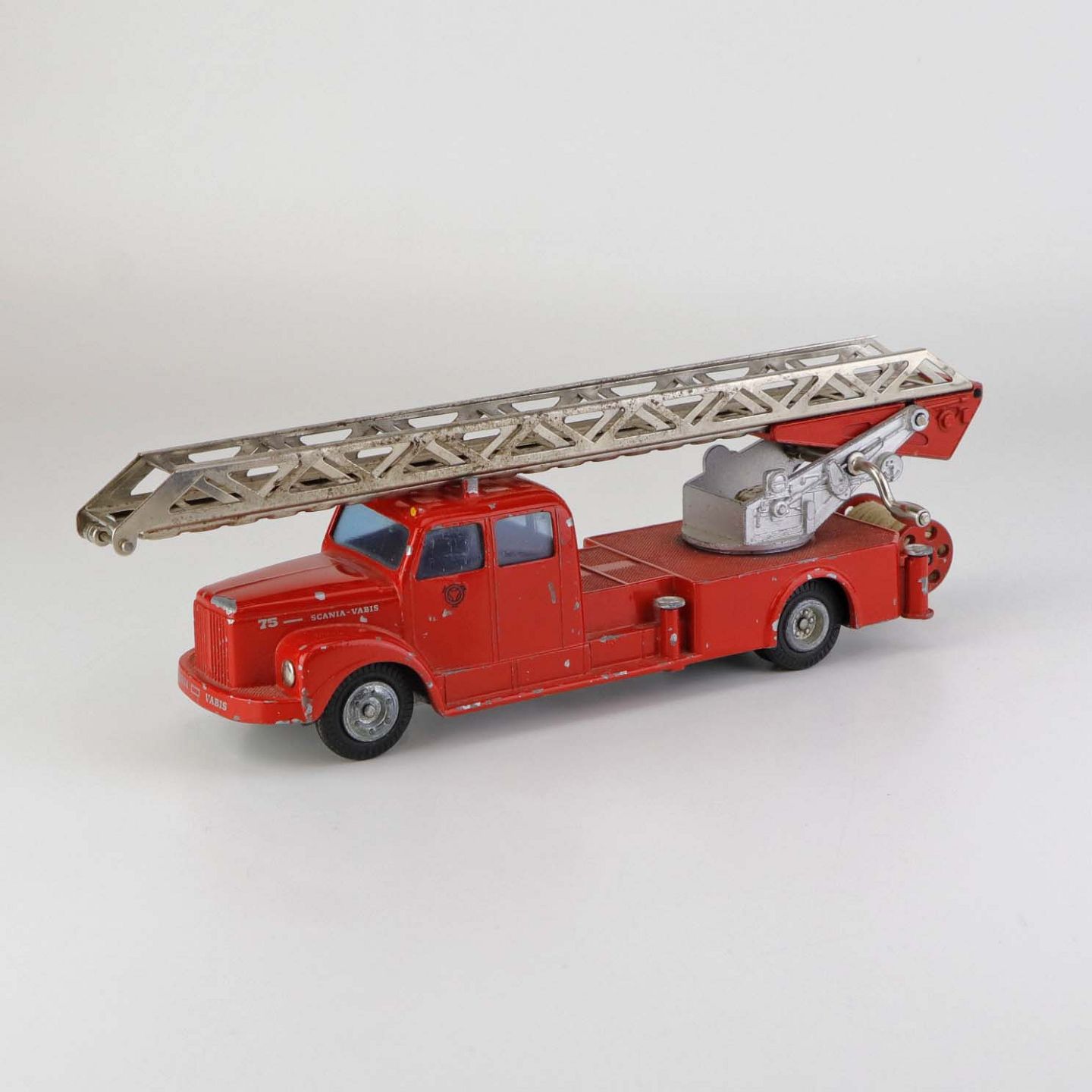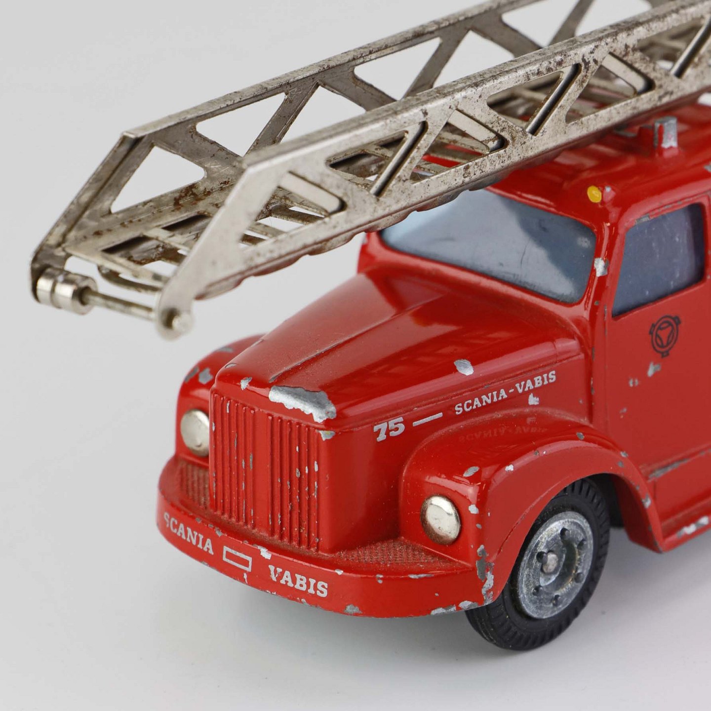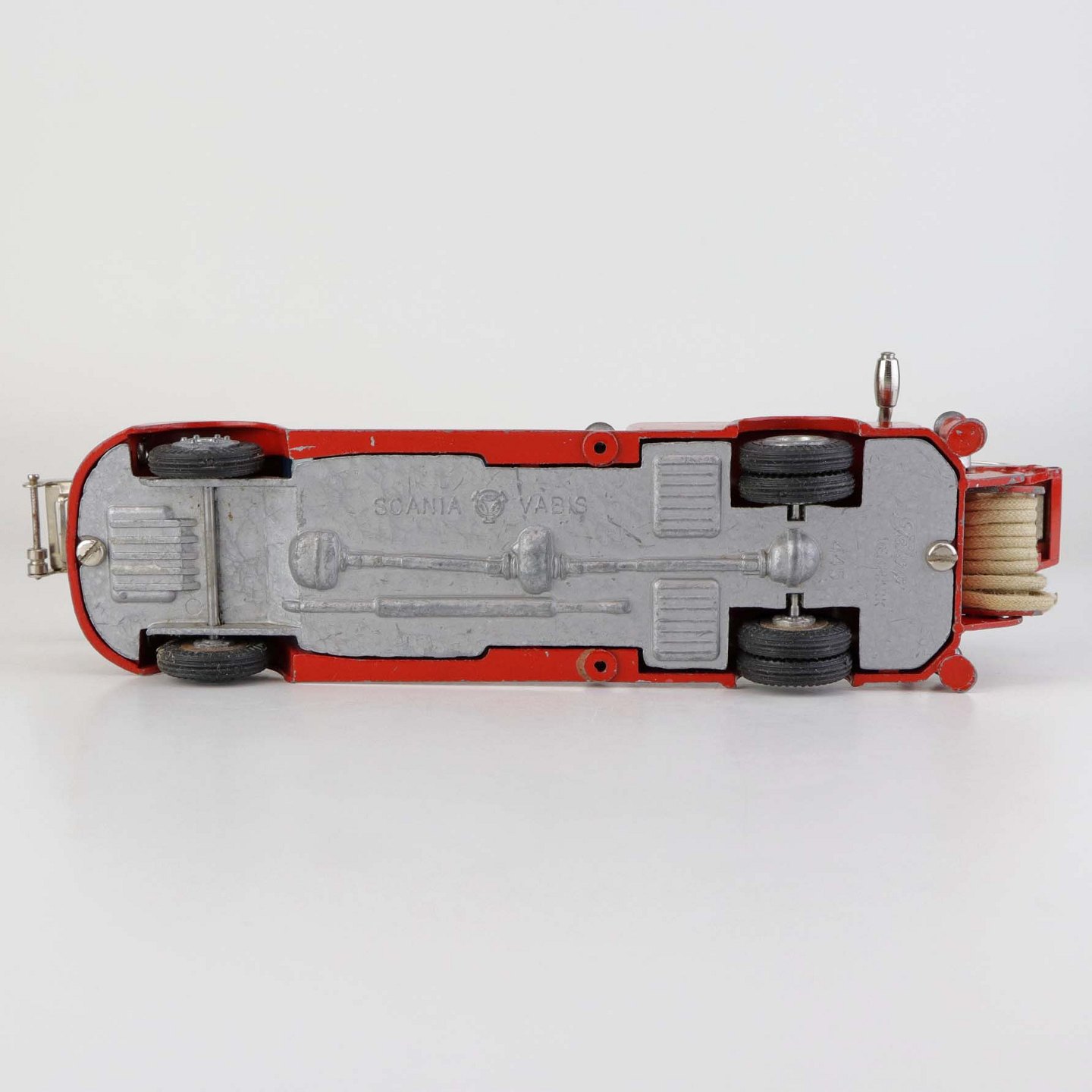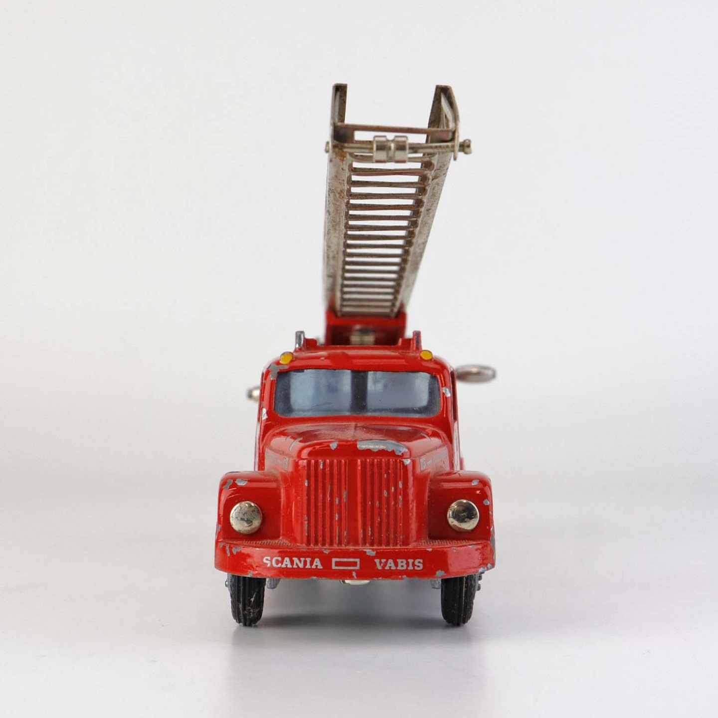 Legetøjsbil. Scania vabis brandbil stigevogn i rødlakeret metal med gummi hjul og drejbar stige med ekstra udtrækstige samt aftagelig oprullet brandslange.Producent Tekno, Denmark