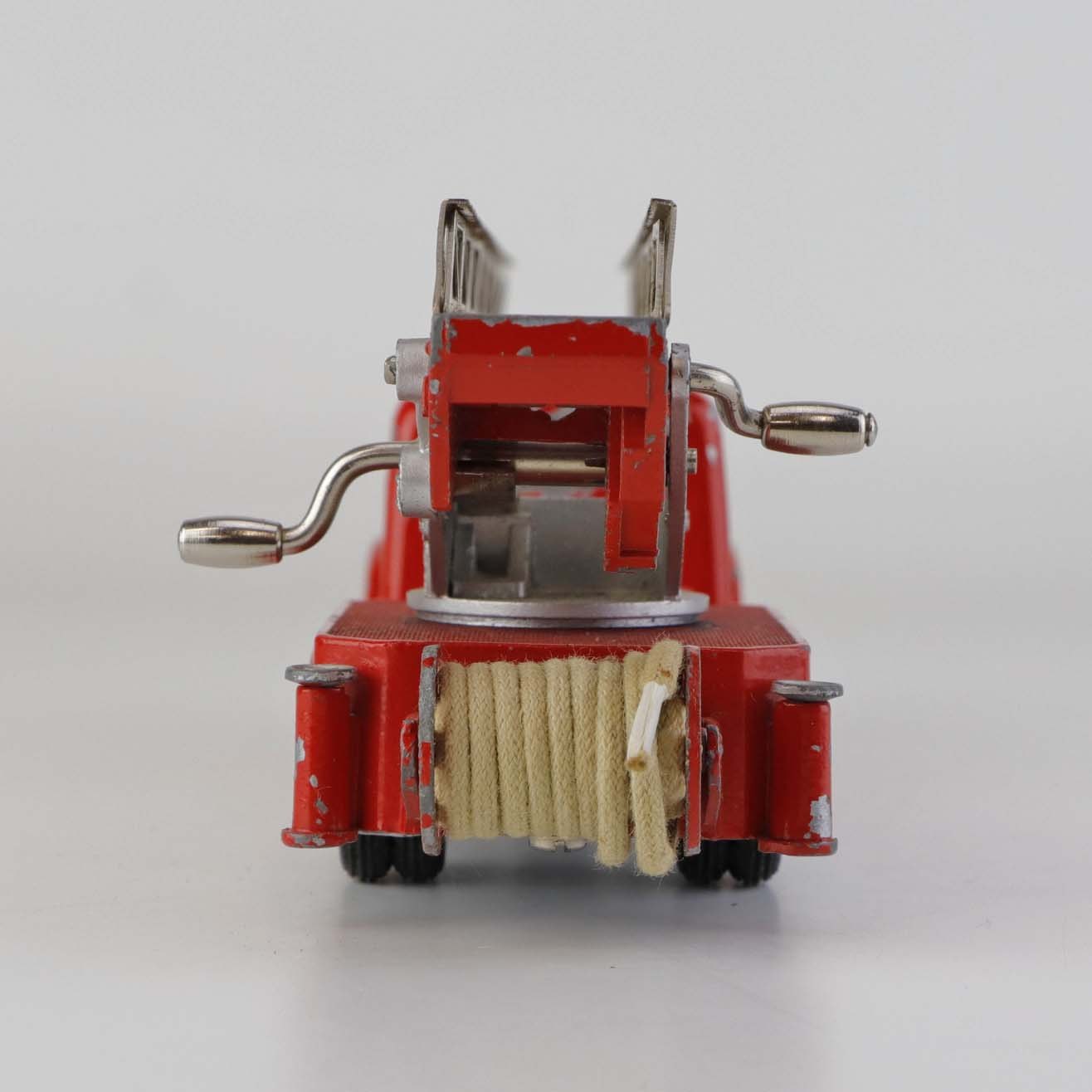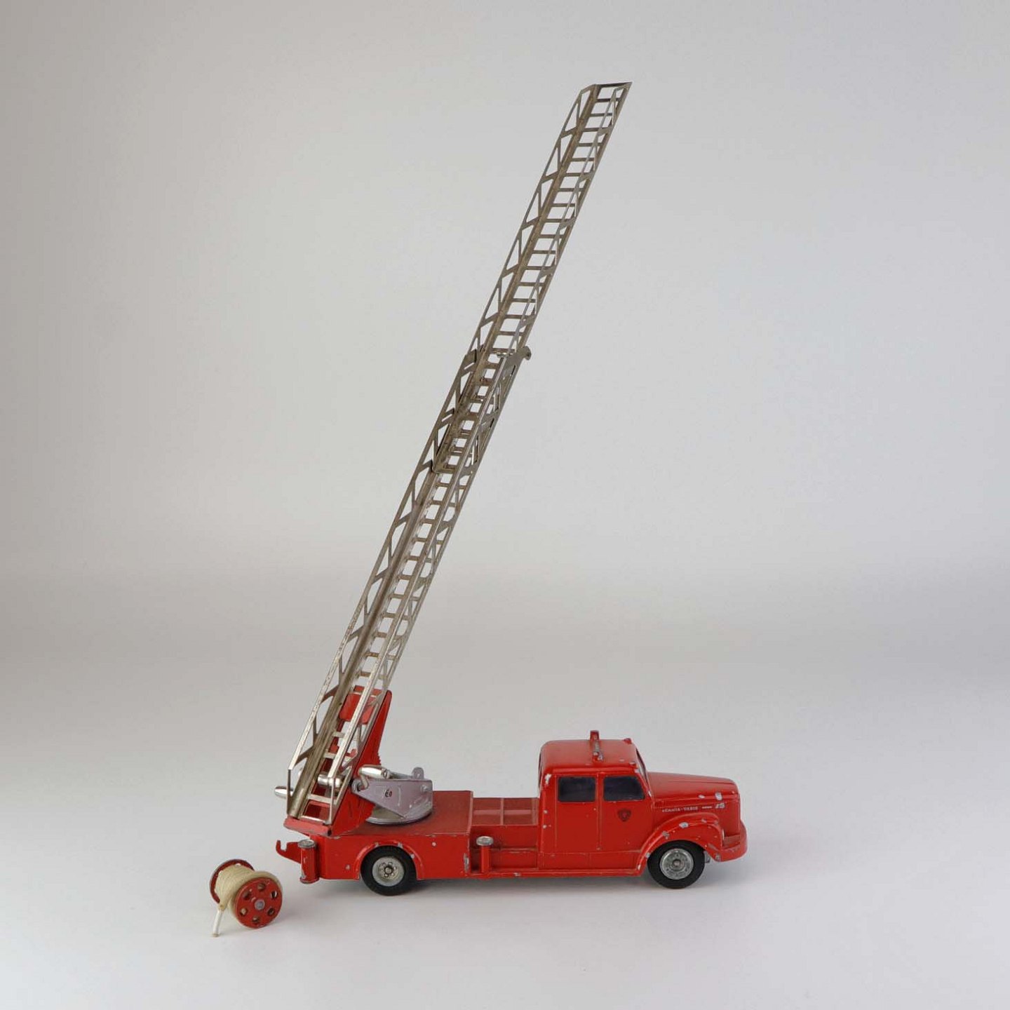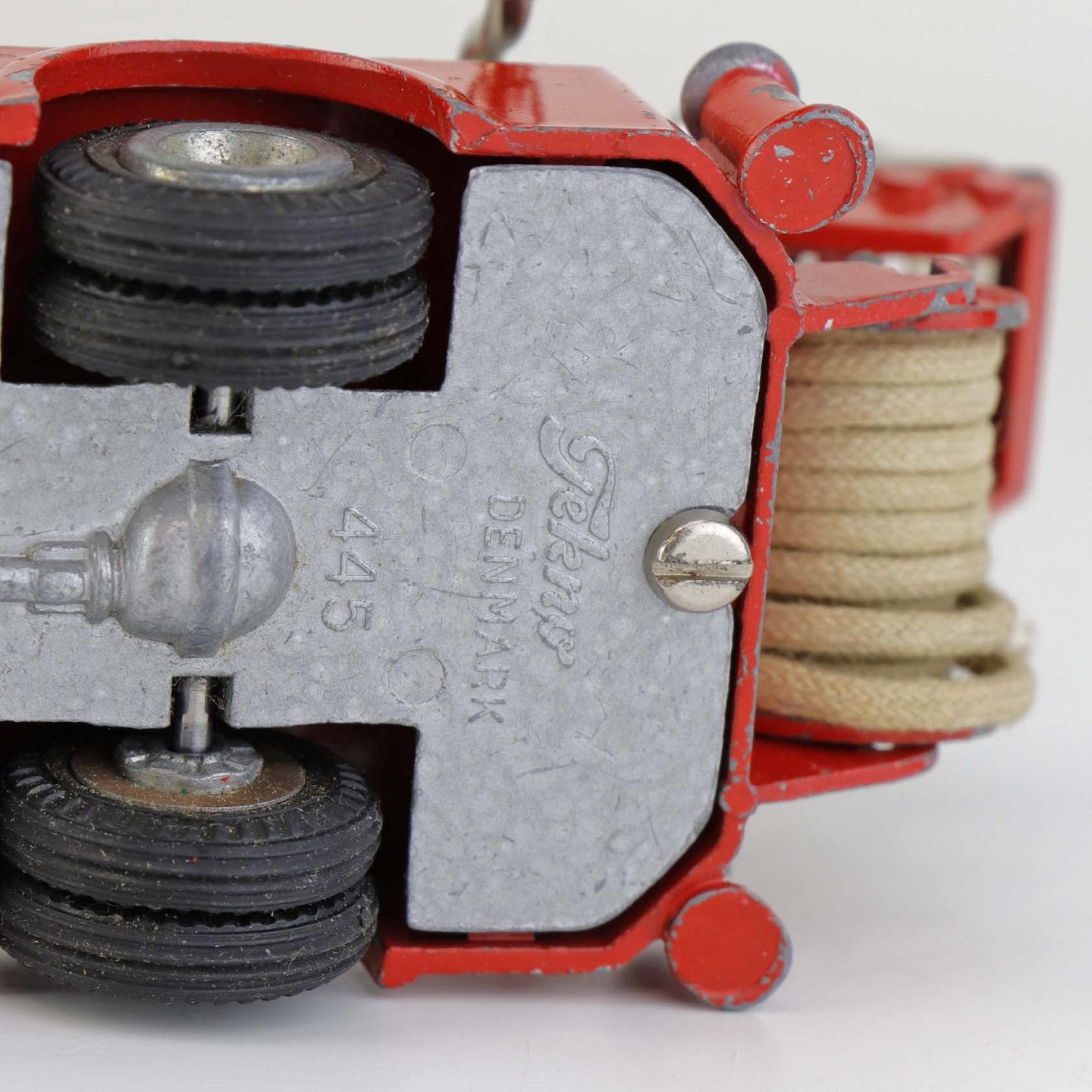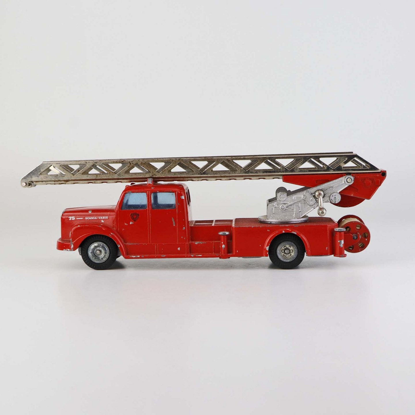 Legetøjsbil. Scania vabis brandbil stigevogn i rødlakeret metal med gummi hjul og drejbar stige med ekstra udtrækstige samt aftagelig oprullet brandslange.Producent Tekno, Denmark