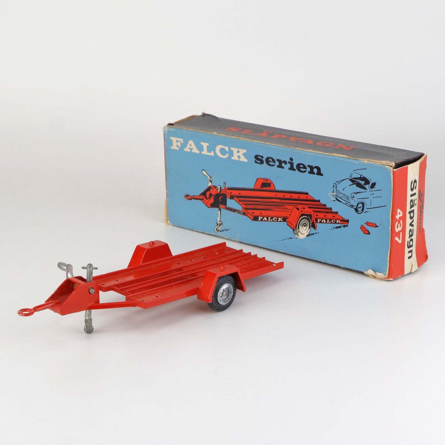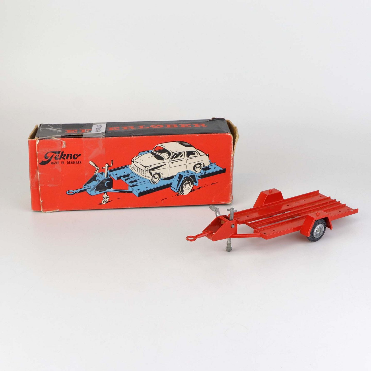Legetøjsbil. Biltrailer model Efterløber fra falck serien i rødlakeret metal med gummi hjul samt original boks. Nr. 437Producent Tekno, Denmark