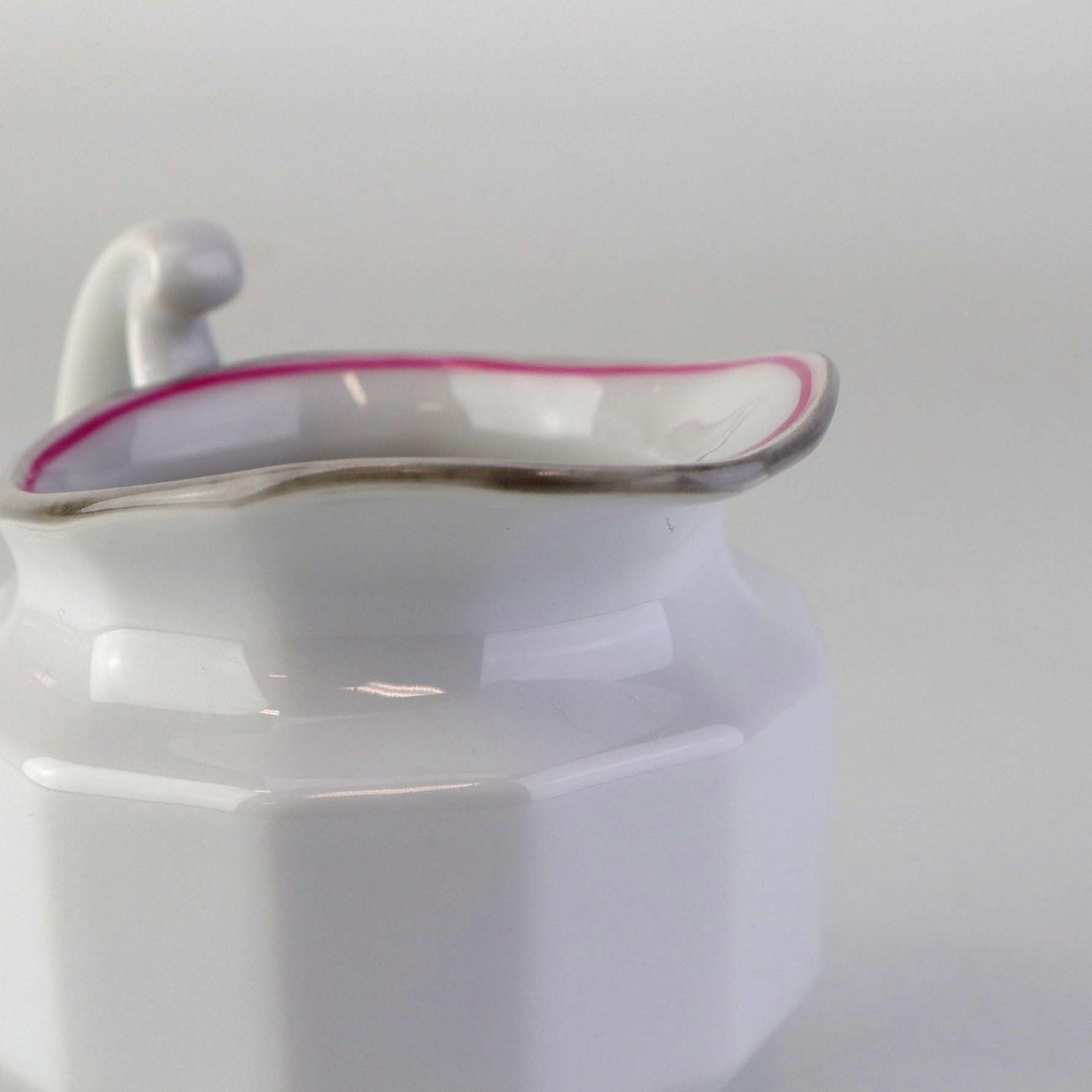 Service i kantet hvidt porcelæn dekoreret med lyserød og grå stribe ved kant.