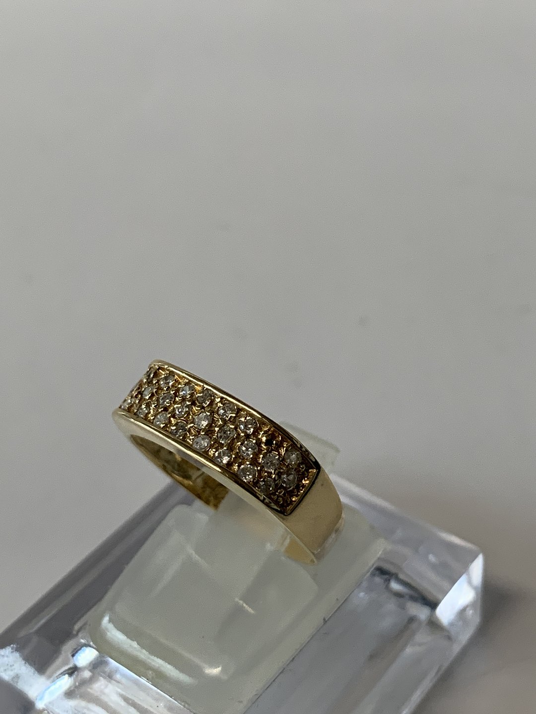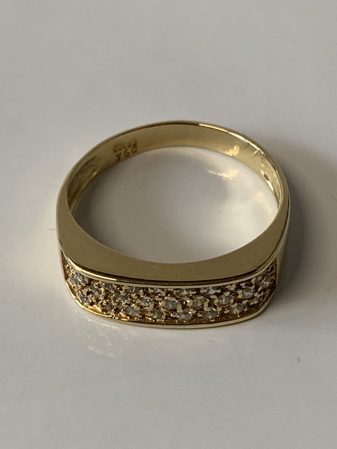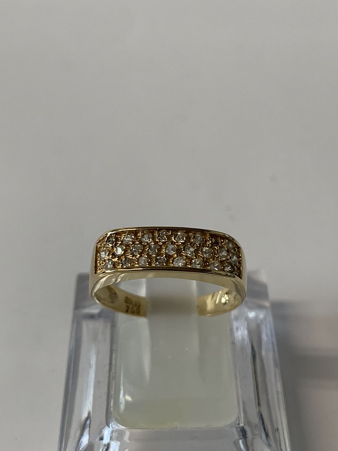 Smuk og elegant guldring med fine hvide sten i 18 karat guld, i enkelt design. Ringen er meget anvendelig til hverdagsbrug, eller til festlige lejligheder. Da ringen er i et enkelt design, er det let at kombinere denne ring med andre guldringe. Ringen findes ikke fysisk i butikken, men kan fremvises efter ønske.