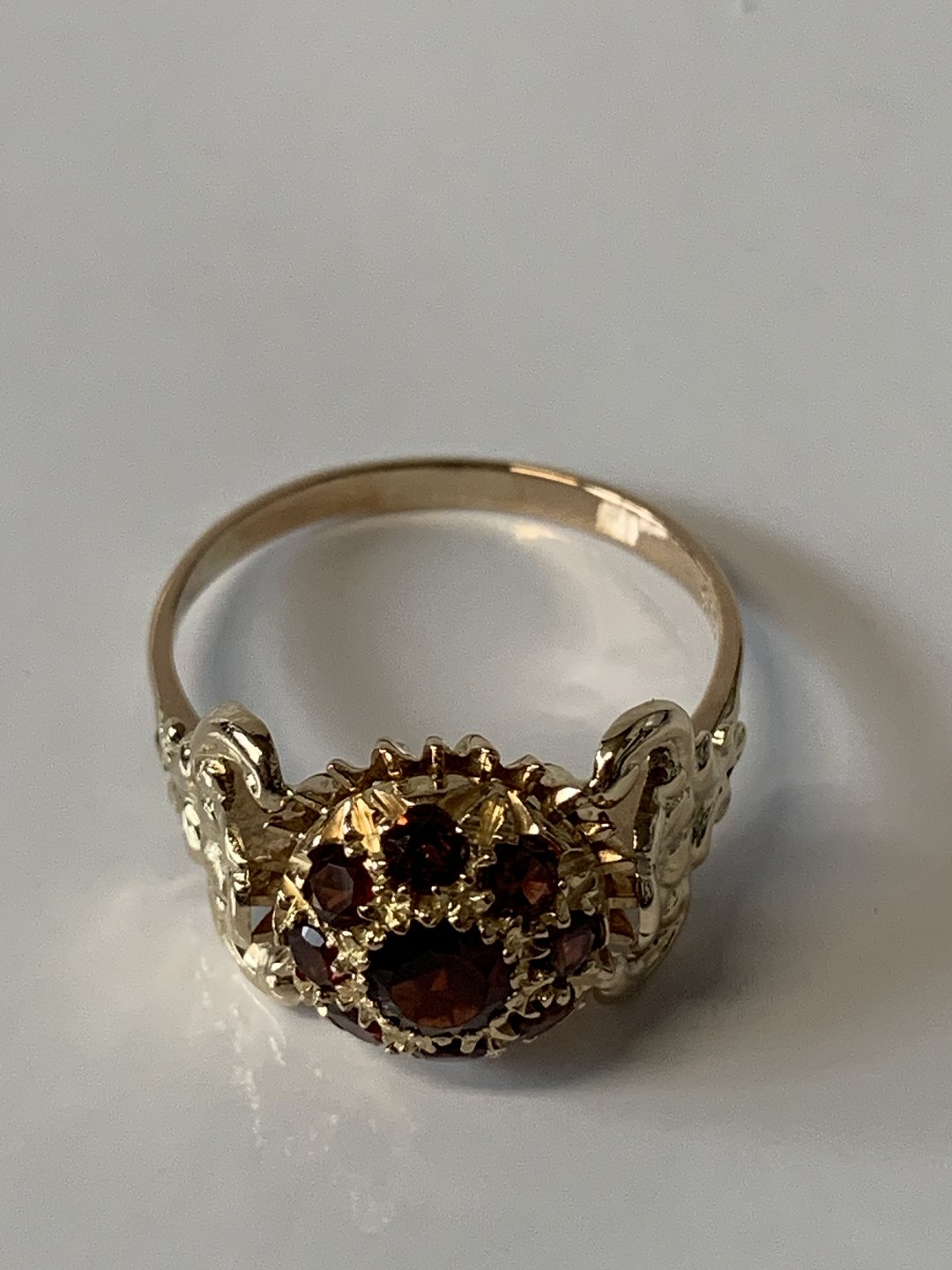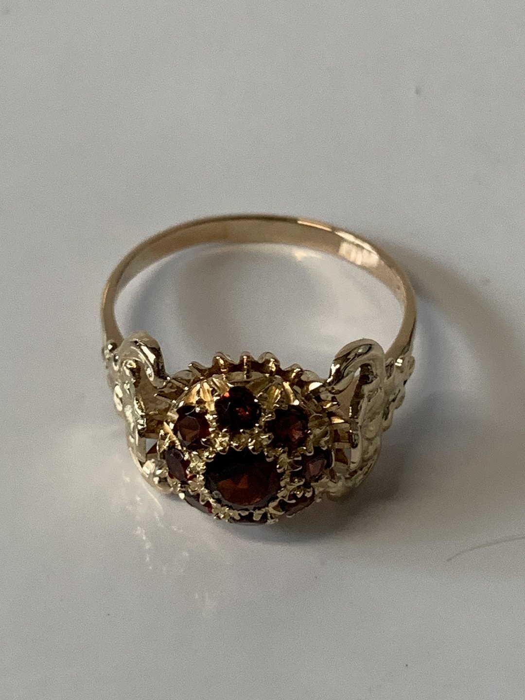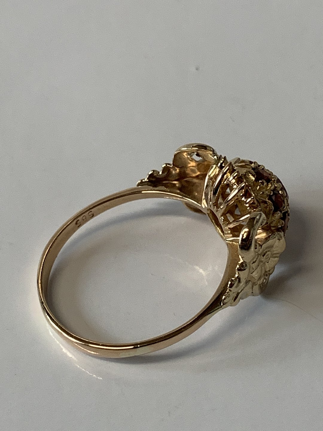Damering i 14 karat guld med røde sten og flotte ornamenteringer. Størrelse 58, stemplet 585.