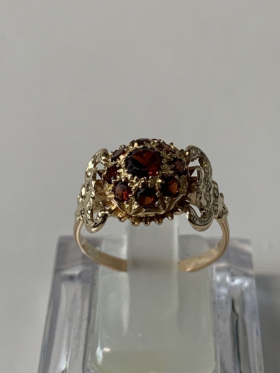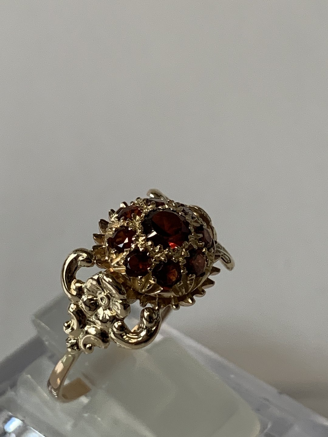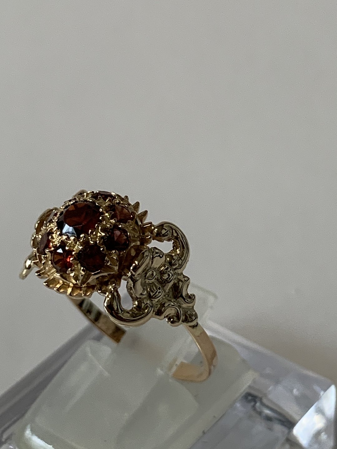 Damering i 14 karat guld med røde sten og flotte ornamenteringer. Størrelse 58, stemplet 585.