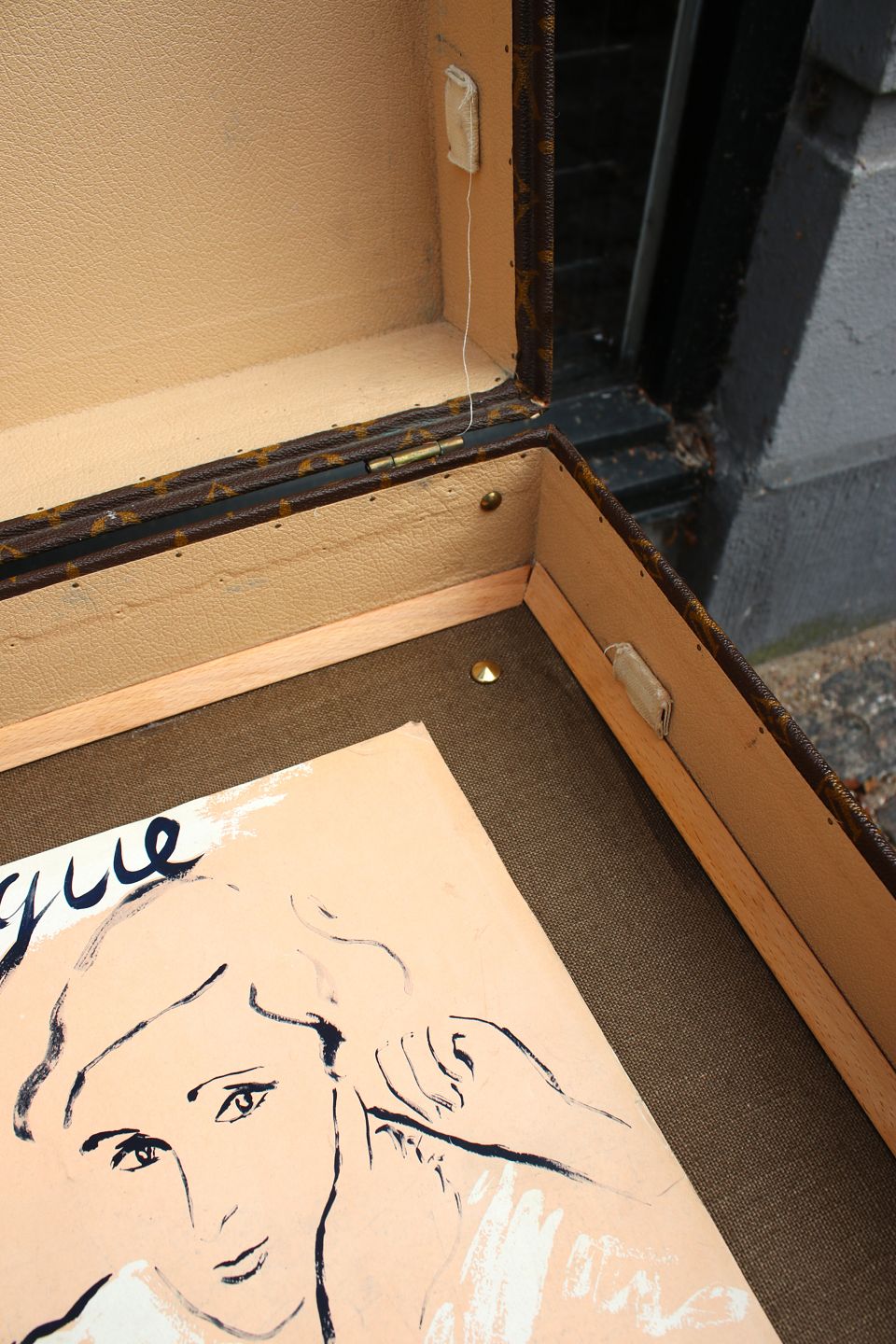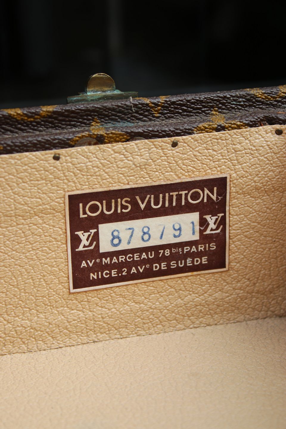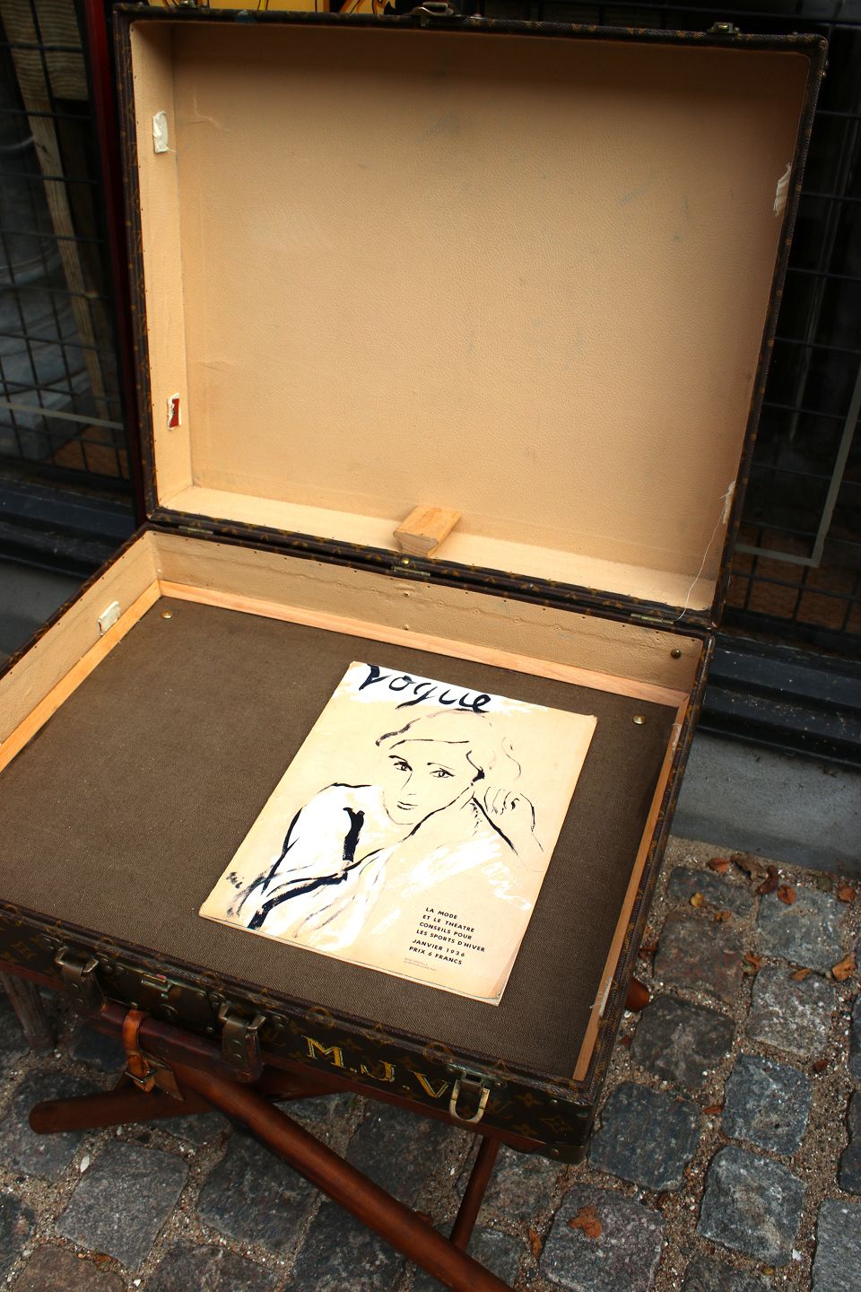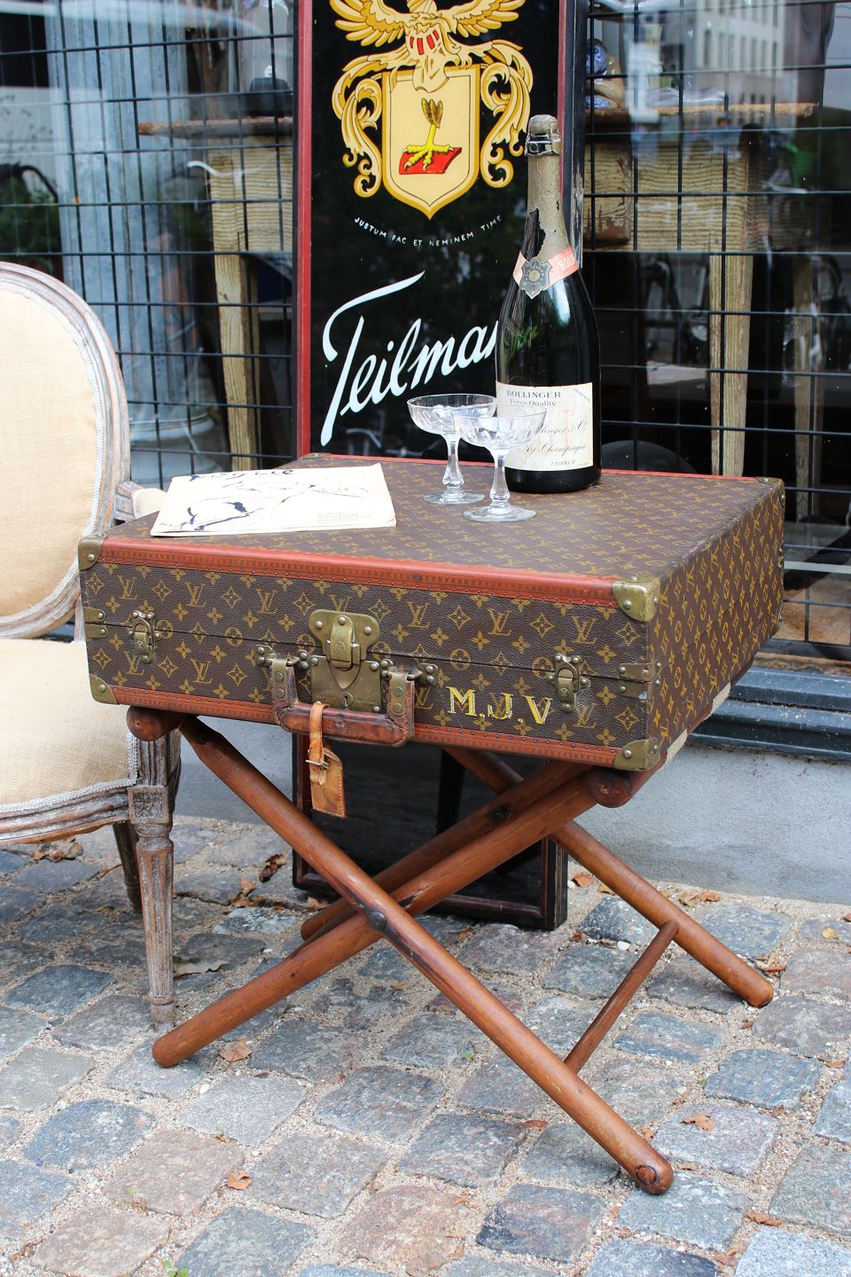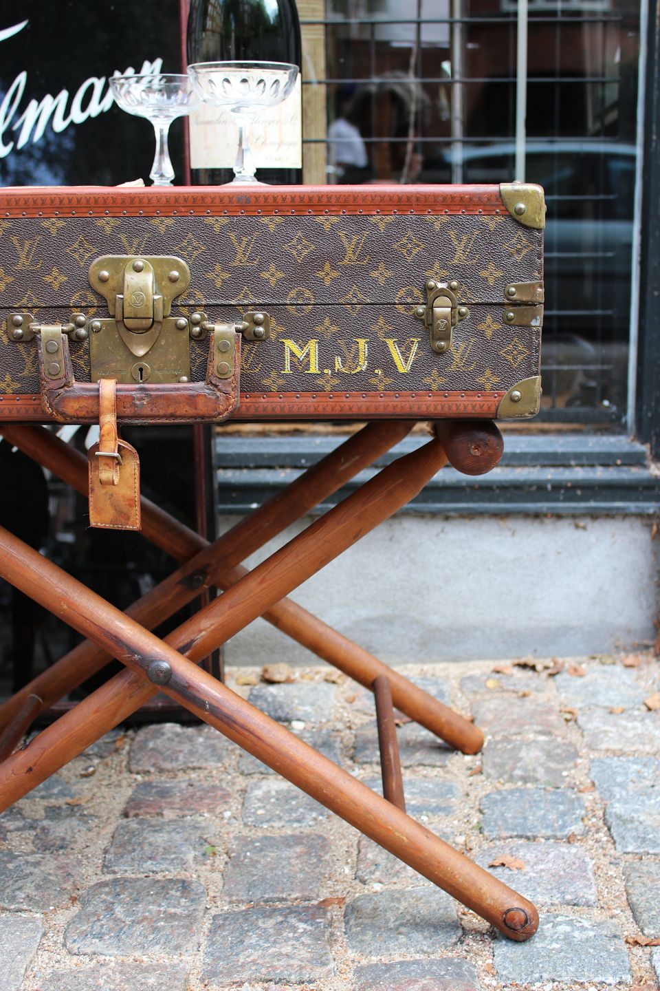 Eksklusivt sofabord / sidebord i form af original vintage LOUIS VUITTON Monogram LV rejse kuffert , nummereret og med flotte messing beslag og en god patina. (Kufferten har nogle brugsspor) Kufferten er fastmonteret på gammelt kuffertstativ i træ.