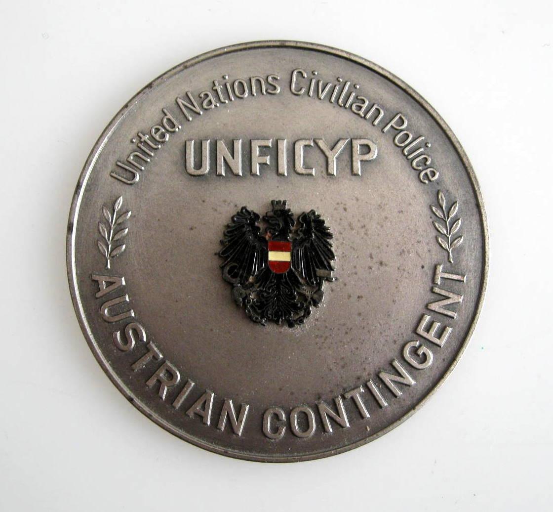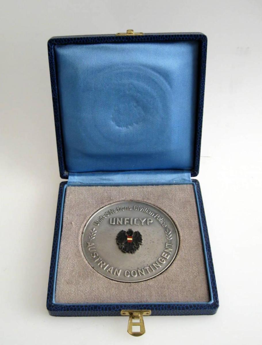 UN-Medaille - Vereinte Nationen Zivilpolizei - UNICYP. Österreichisches Kontingent. Dia:. 7,5 cm. Metall mit Emaille. Mit der Aufschrift:. Lt. Col. PEP Skov CO DANCON zur freundlichen Erinnerung, Zypern 1971. In origniales Etui. Provenienz: Oberstleutnant Poul Ervin O. Skov, Kommandant Dancon XIV, Zypern.Bestellnummer: 5425