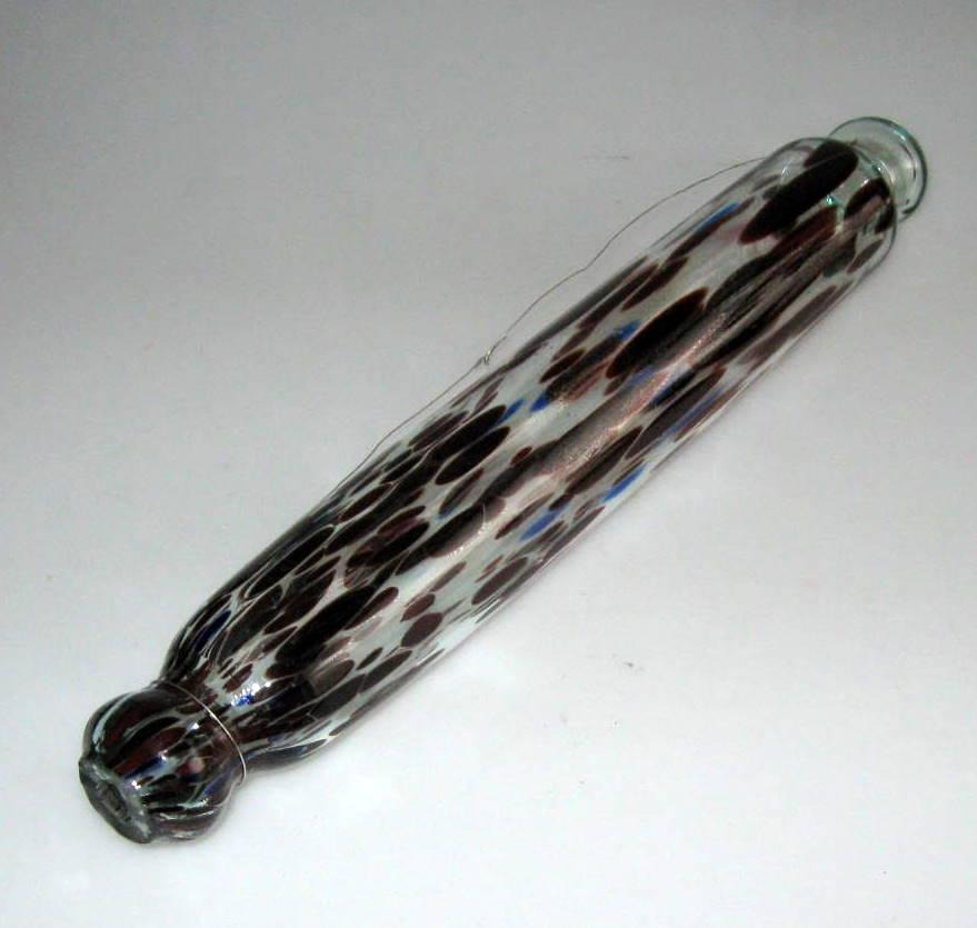 Englische Teigrolle aus gefärbtem Glas, 19. Jahrhundert. Grünliche Glasmasse mit rot und blau. L:. 40 cm.Bestellnummer: 5474