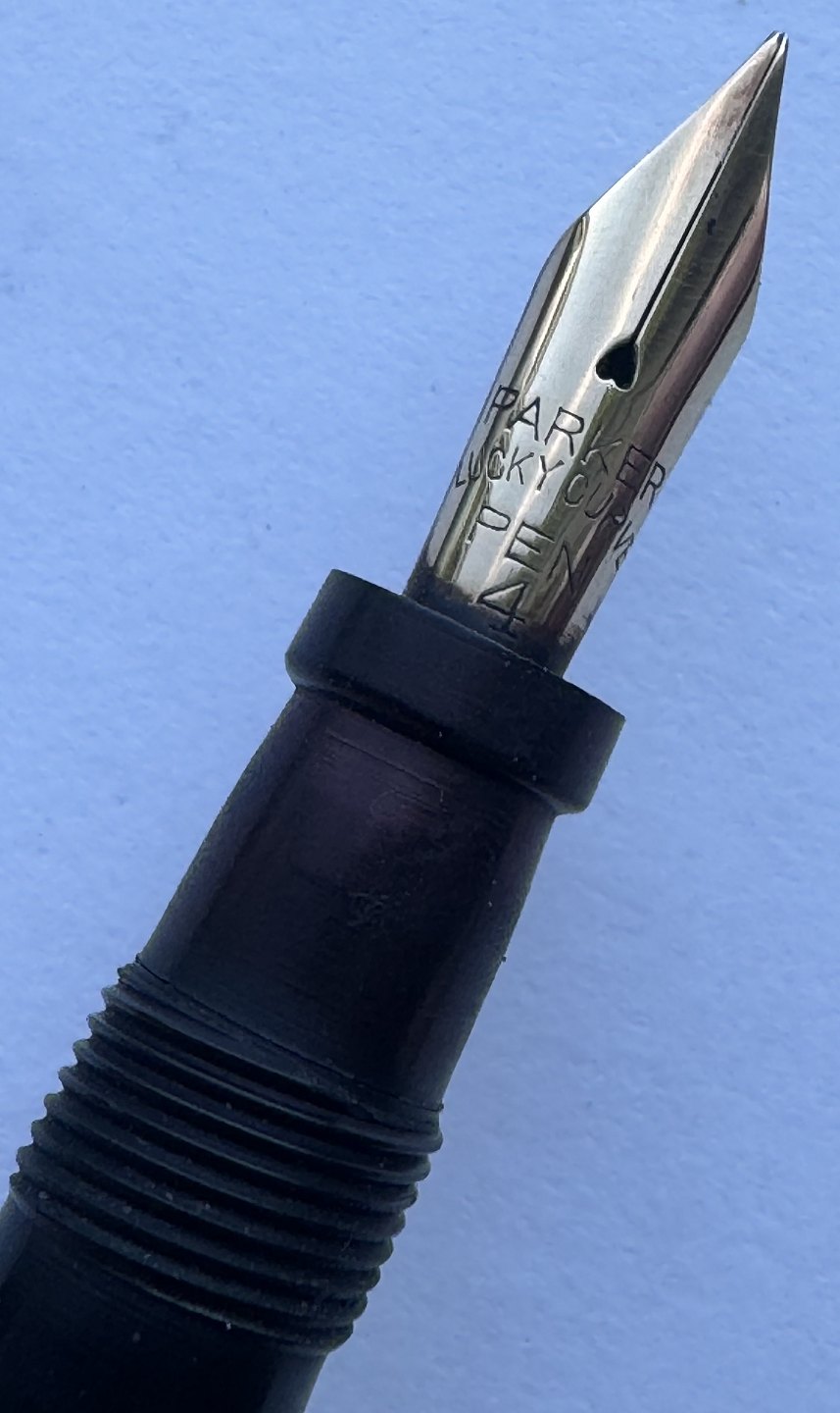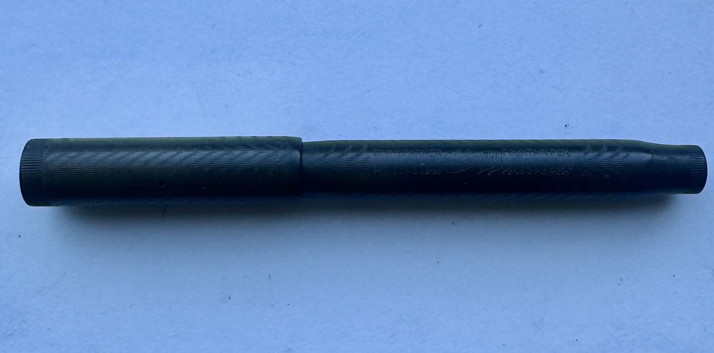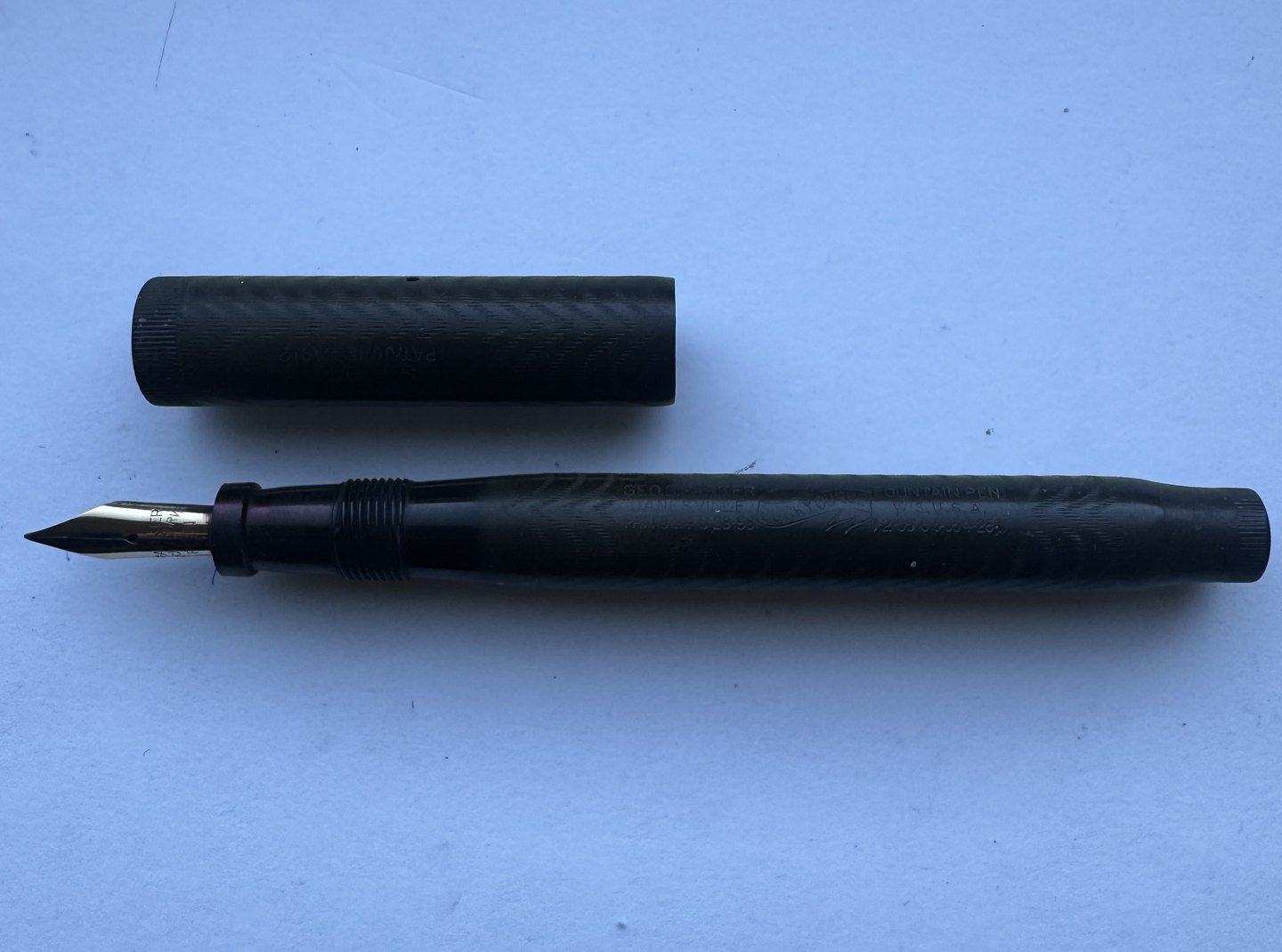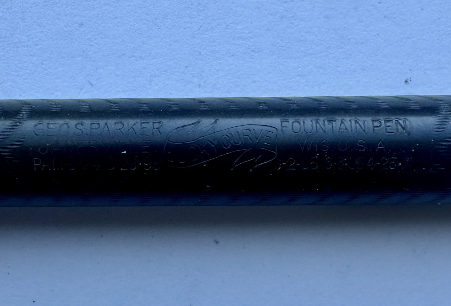 Black Parker “Jack-Knife” Safety Lucky Curve fountain pen from the early 20th century. Does not work. A new rubber sack must be inserted before the fountain pen can absorb ink and write again. Appears to be in good condition. However, the clip at the top of the cap is missing. The fountain pen is 13.5 cm long.