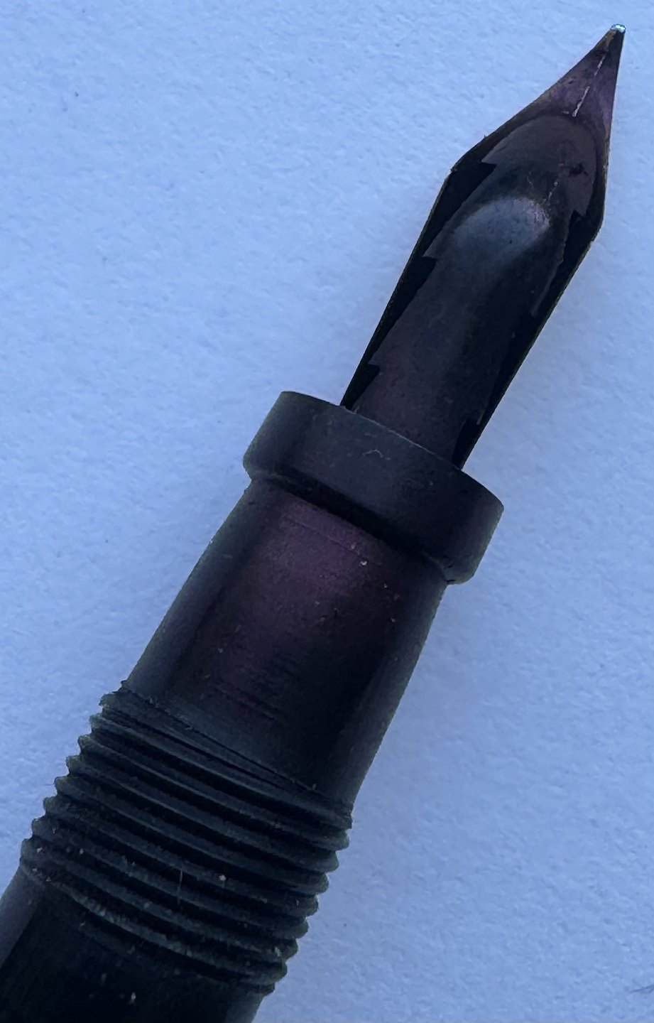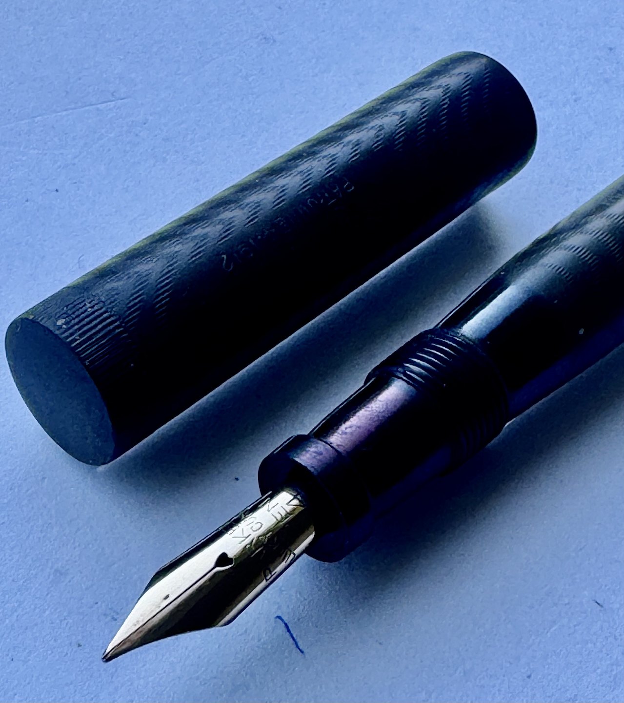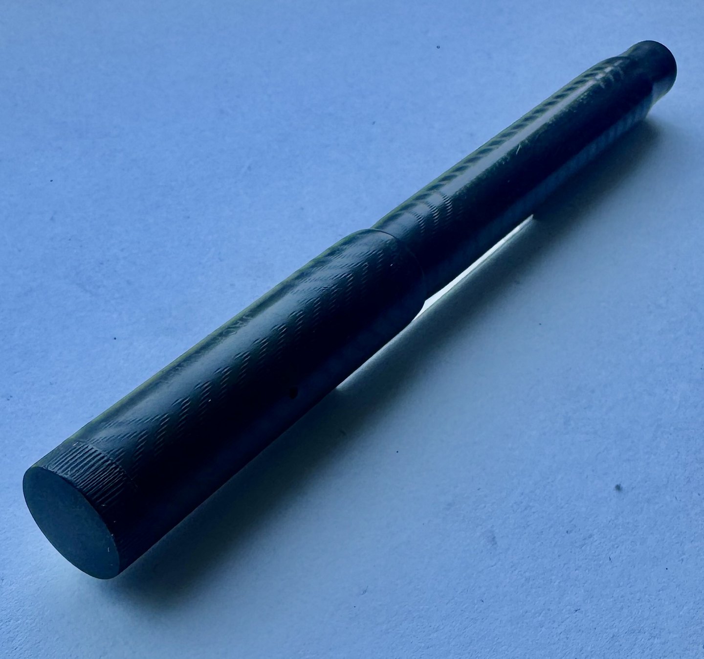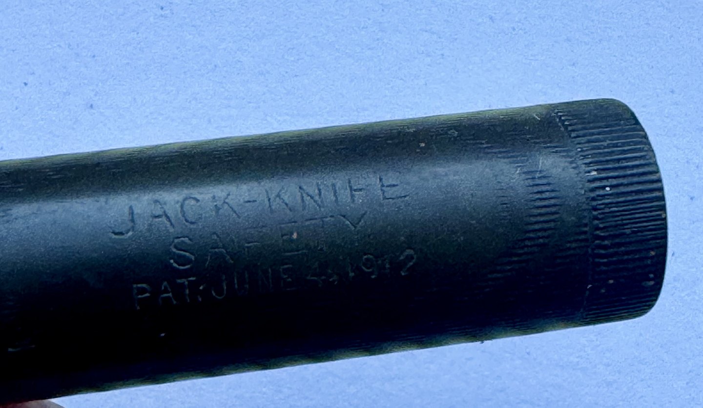 Black Parker “Jack-Knife” Safety Lucky Curve fountain pen from the early 20th century. Does not work. A new rubber sack must be inserted before the fountain pen can absorb ink and write again. Appears to be in good condition. However, the clip at the top of the cap is missing. The fountain pen is 13.5 cm long.