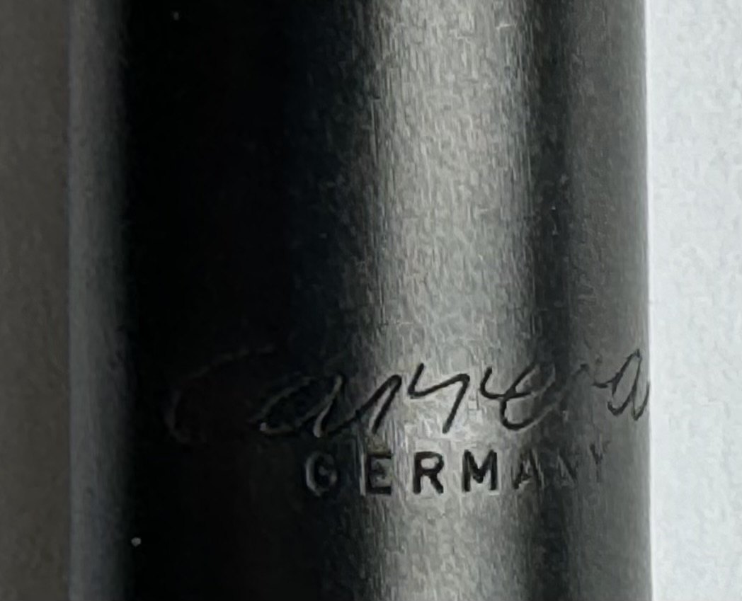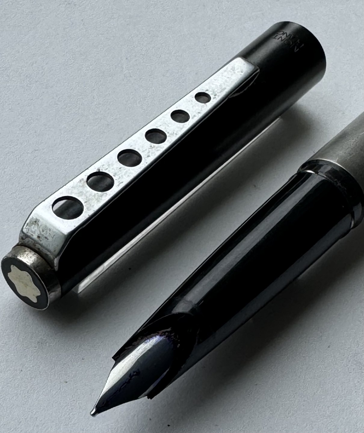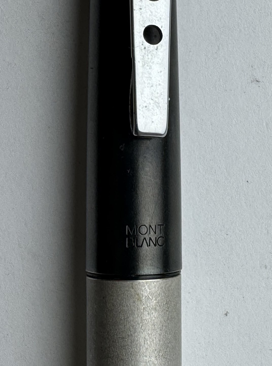 Montblanc Carrera ballpoint pen. Lower part in steel with upper part In black. Clip in retro (racer) style, with “air holes” like in driving gloves from the 1970s. Appears in perfect condition. Ready to use! Works with original Montblanc refill. Dealer
