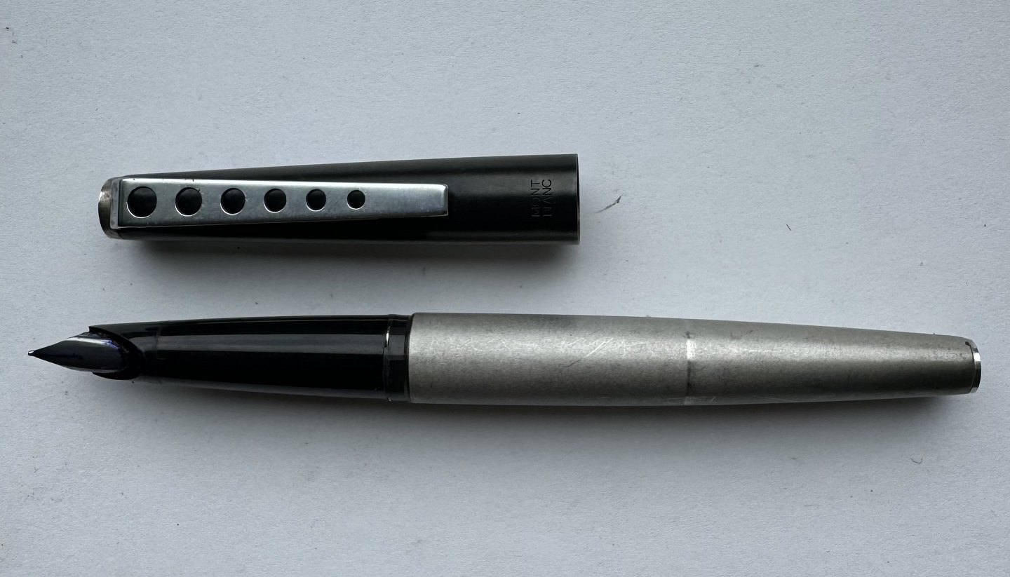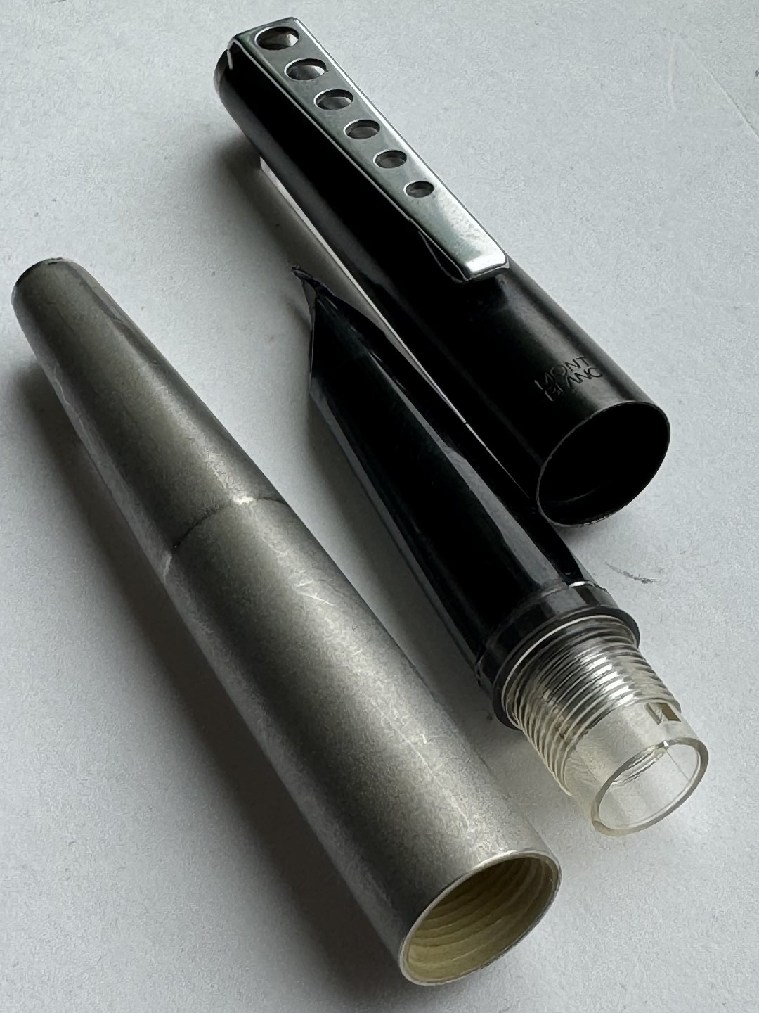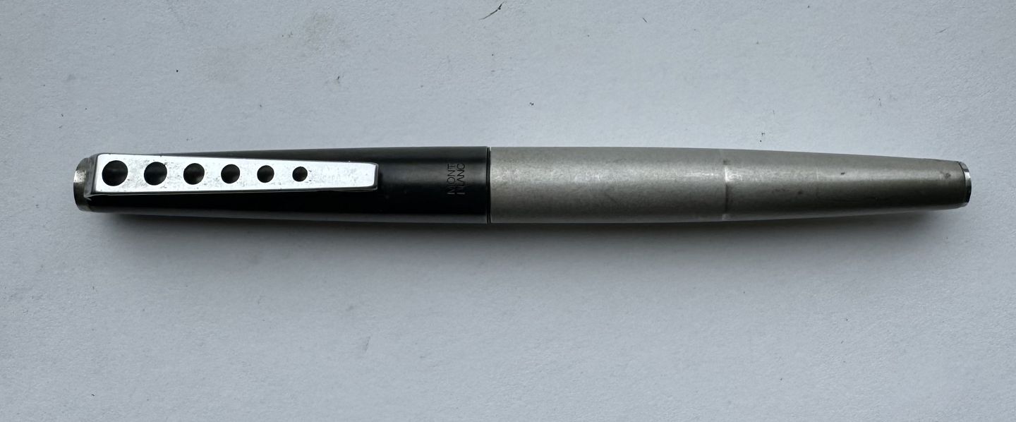 Montblanc Carrera ballpoint pen. Lower part in steel with upper part In black. Clip in retro (racer) style, with “air holes” like in driving gloves from the 1970s. Appears in perfect condition. Ready to use! Works with original Montblanc refill. Dealer