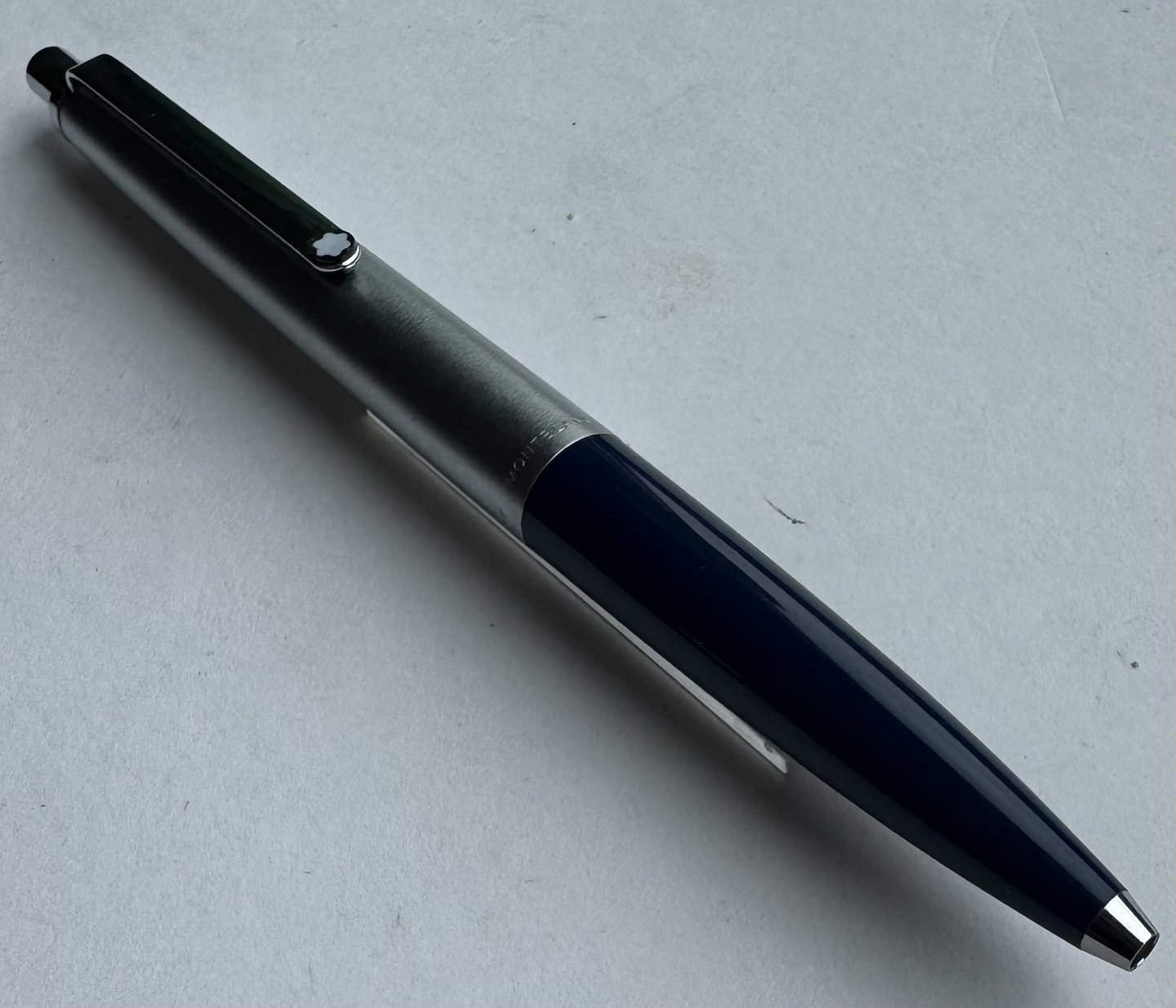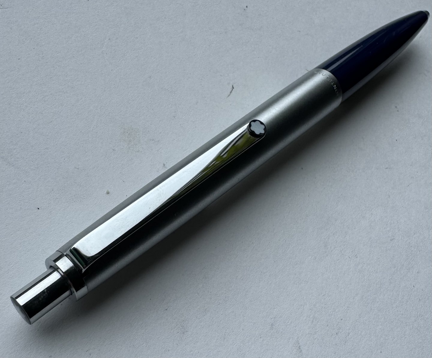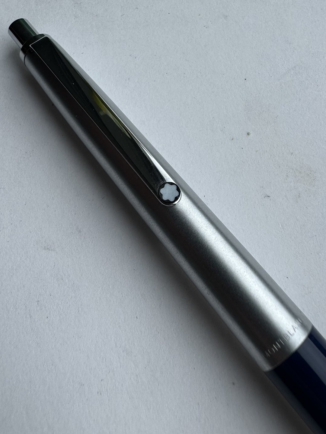 Montblanc Traveller 5201 ballpoint pen. Blue bottom with brushed steel top design. In perfect condition. Ready to use! Works with original Montblanc refill. Dealer