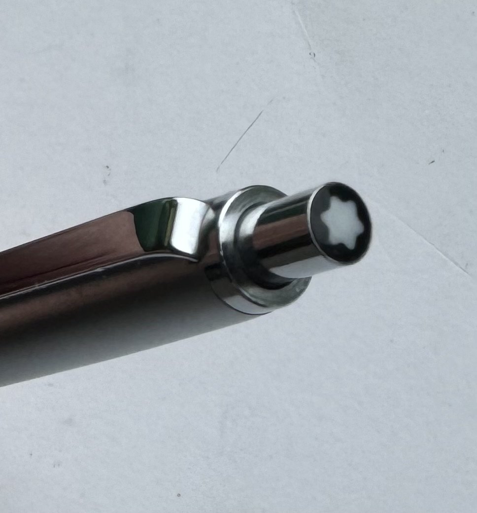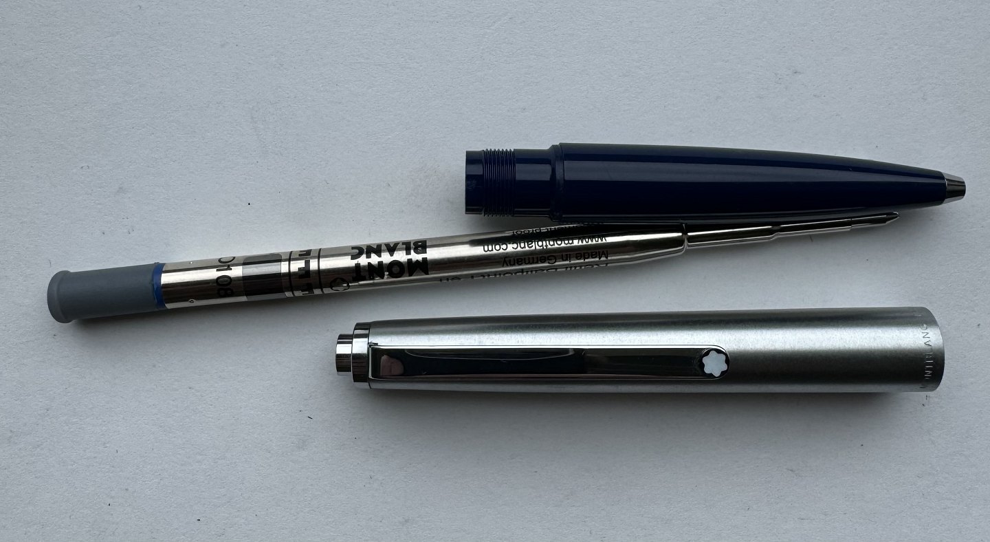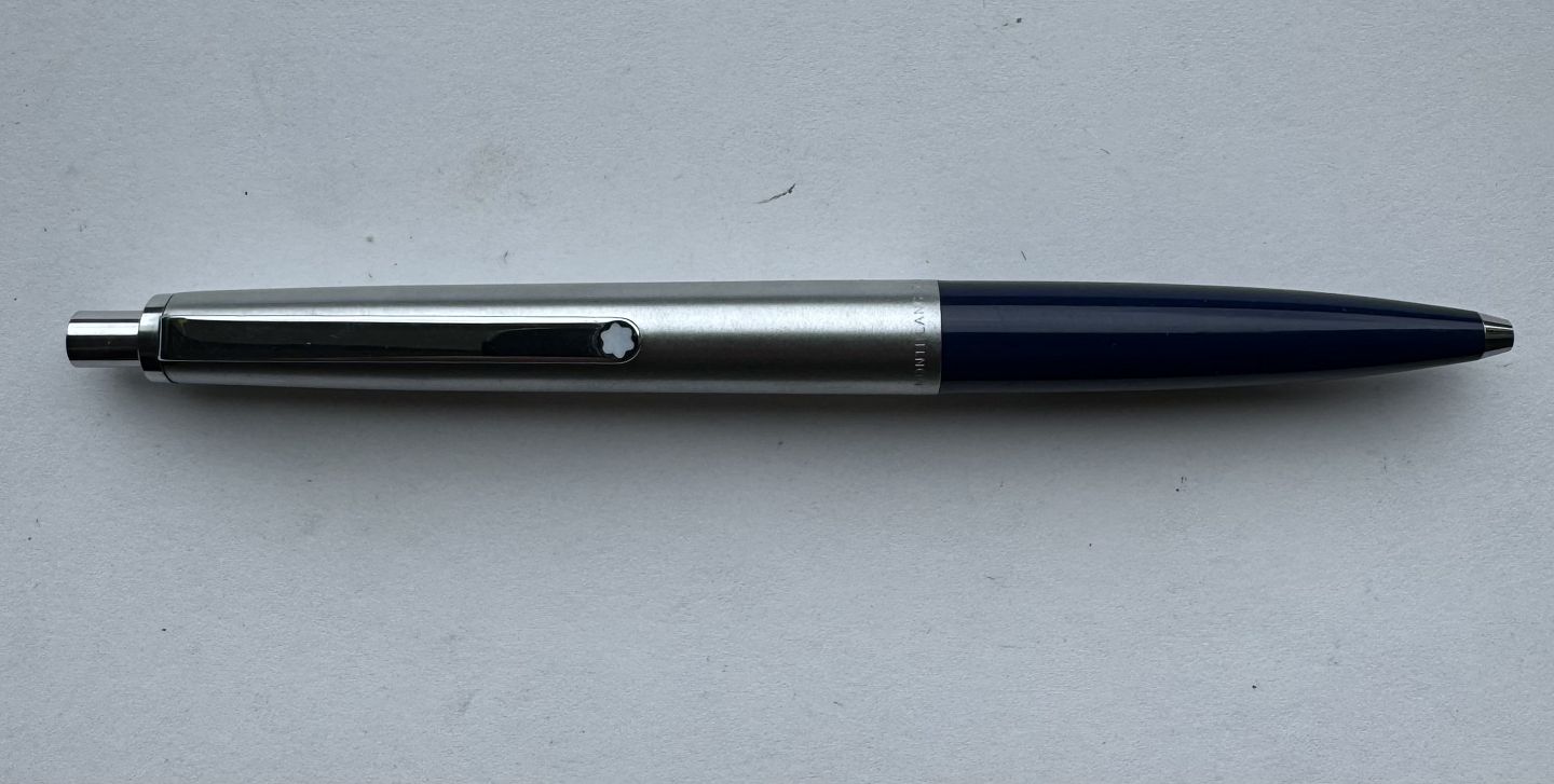 Montblanc Traveller 5201 ballpoint pen. Blue bottom with brushed steel top design. In perfect condition. Ready to use! Works with original Montblanc refill. Dealer