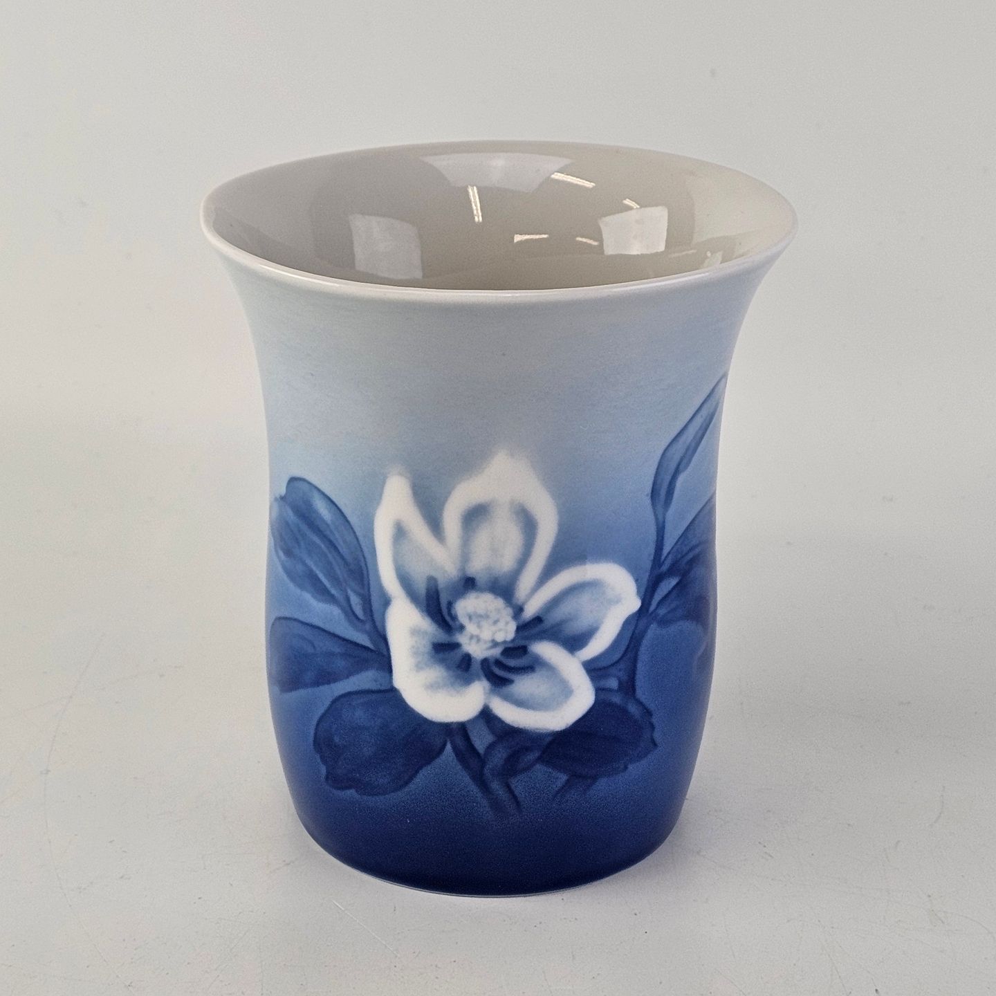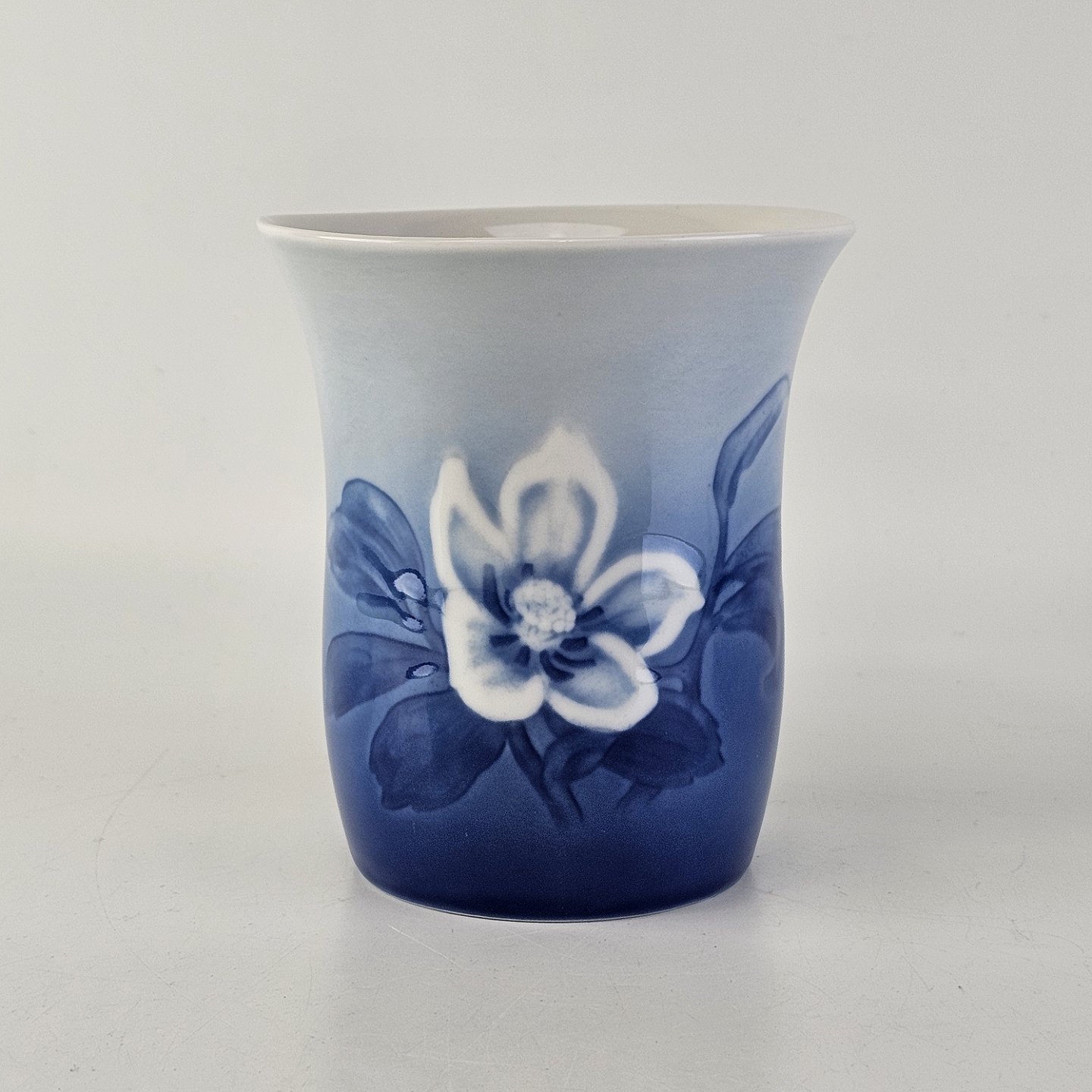 Julerose er hvidt porcelæn med gradueret blå farver, dekoreret med et motiv af en hvid julerose