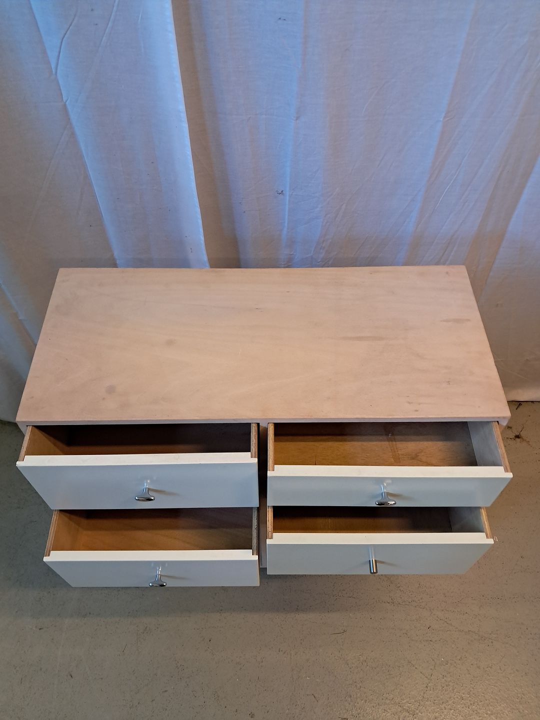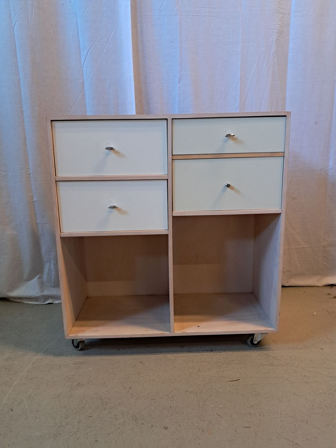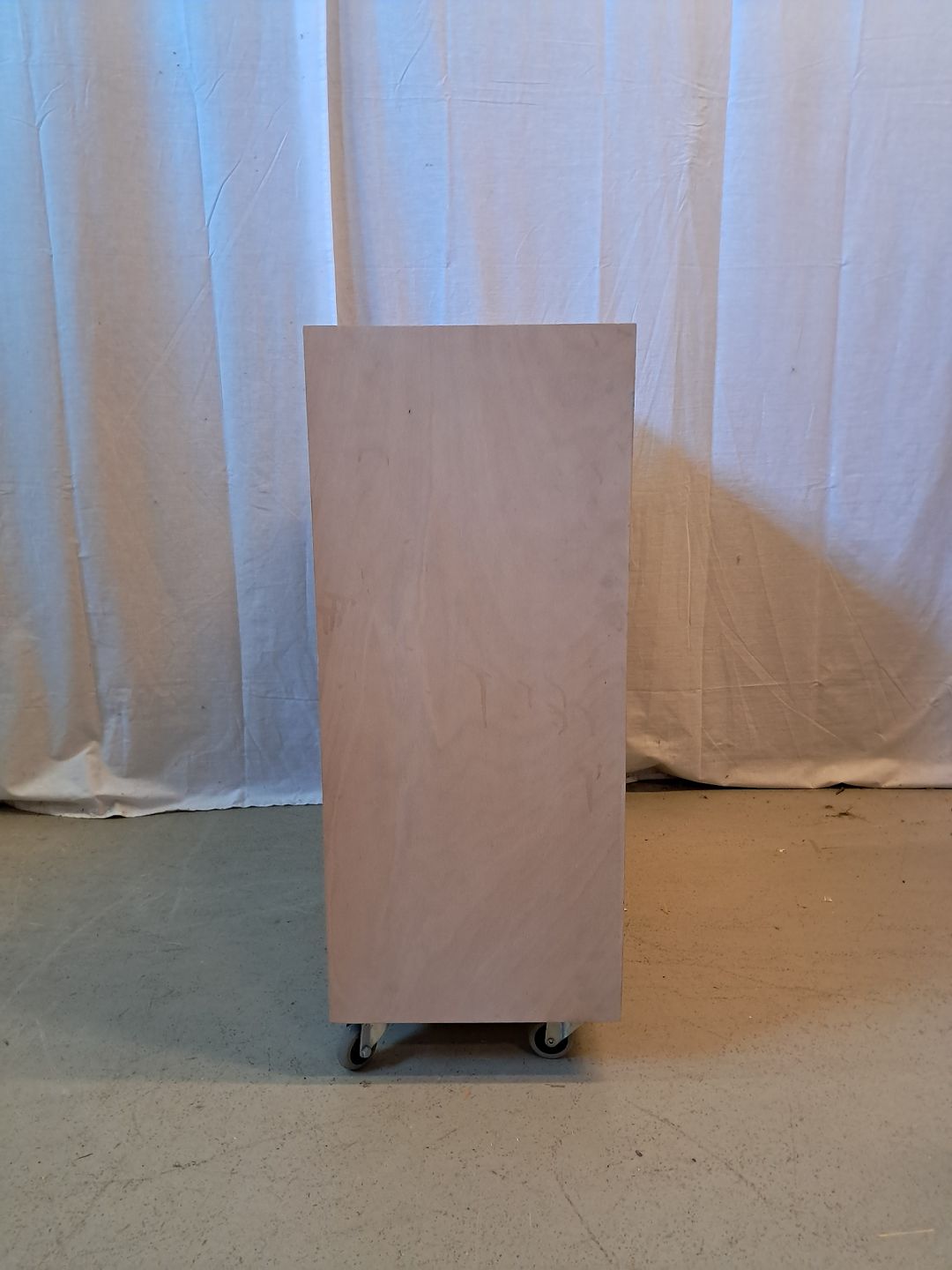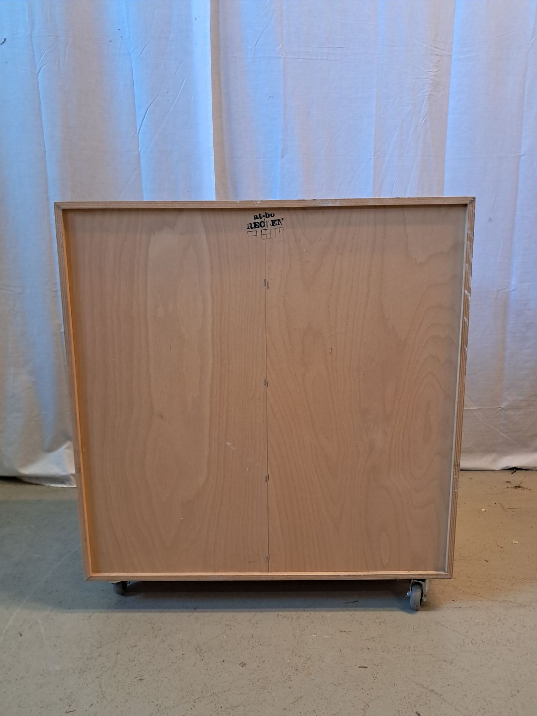 At-bo reolkasse i krydsfiner, fra 2000erne.Den har brugsspor og der er monteret hjul.