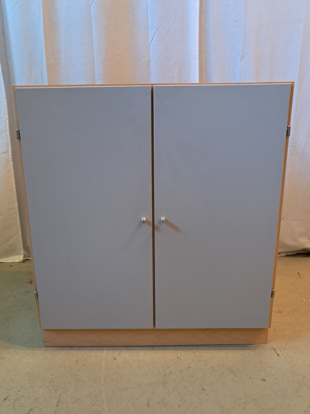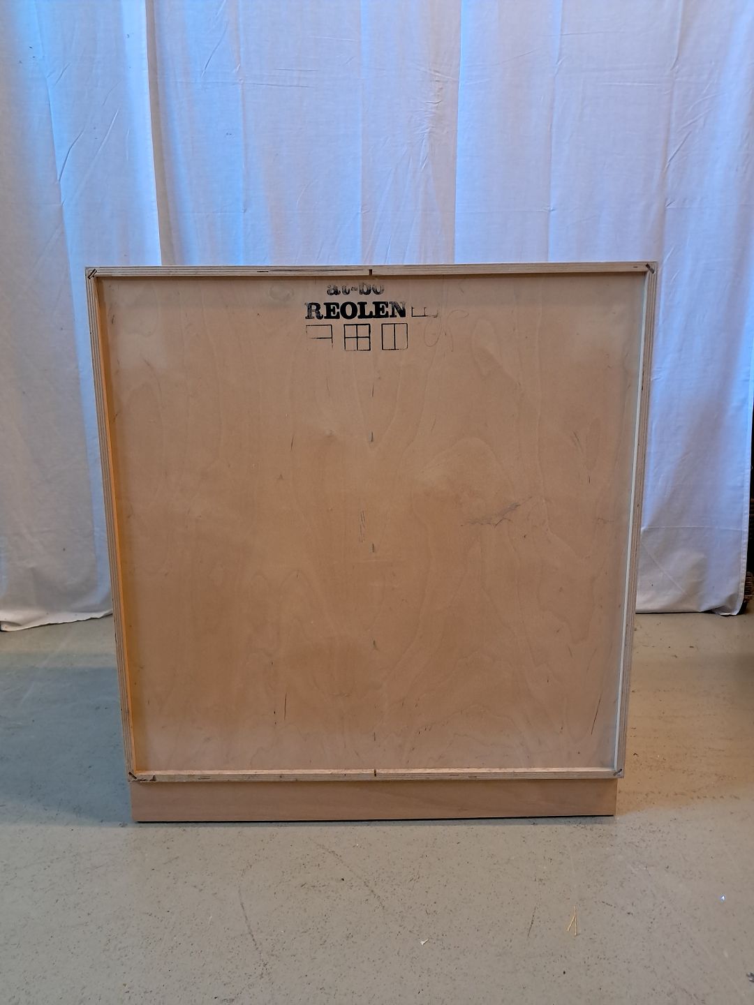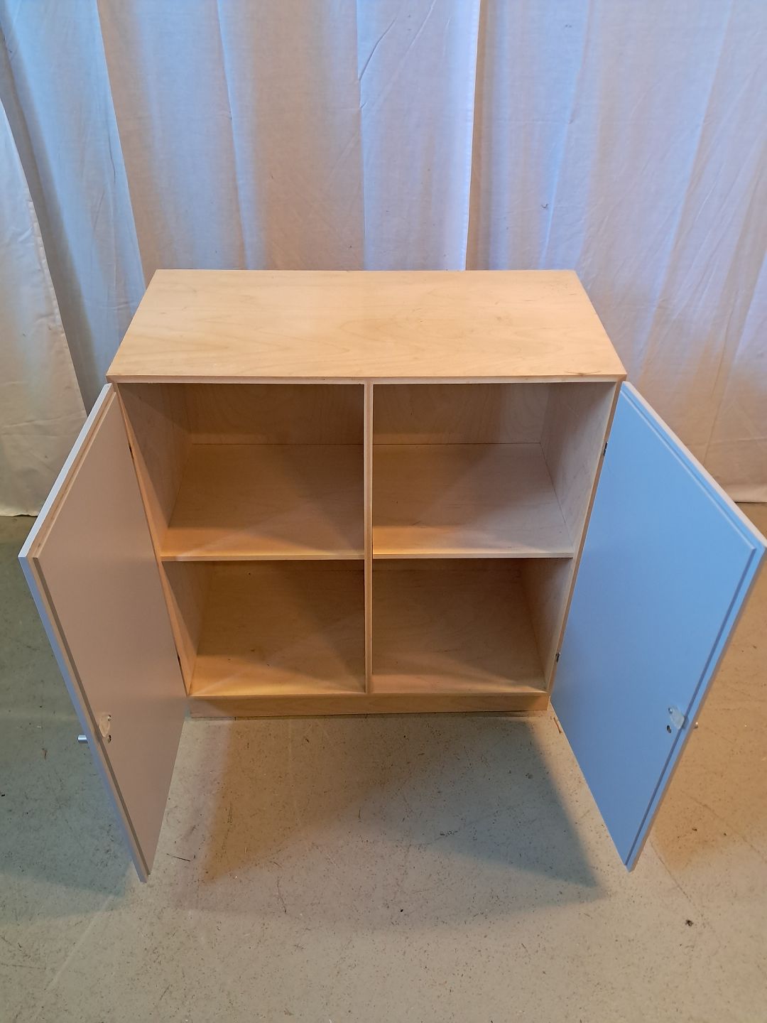 At-bo reolkasse i krydsfiner med malede låger, fra 2000erne.Den har brugsspor.