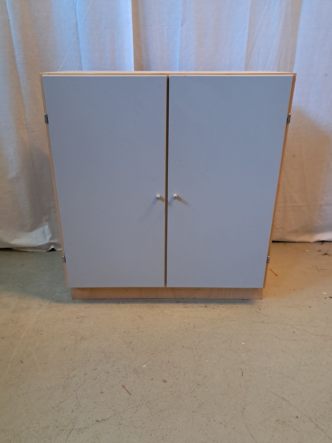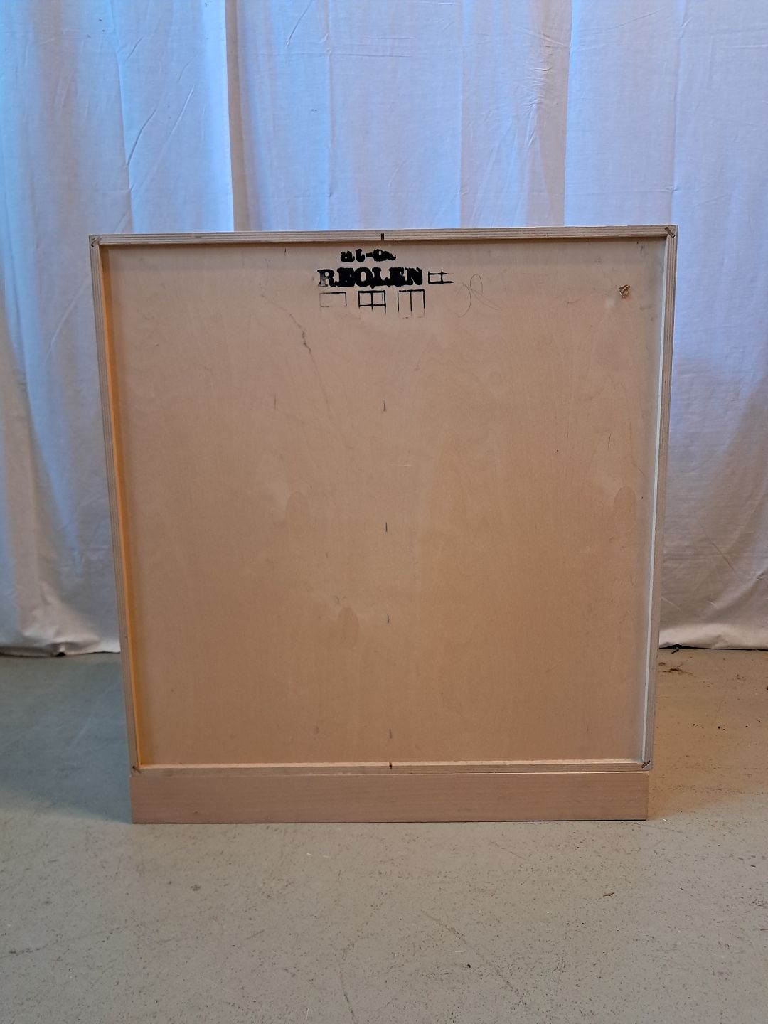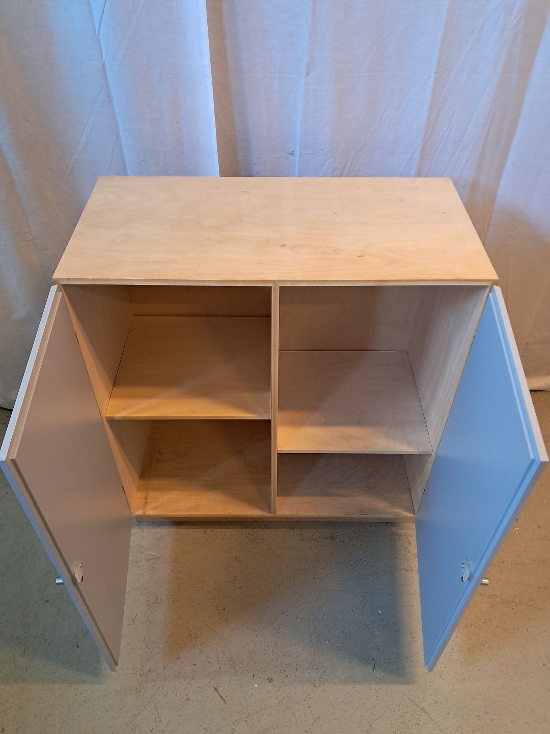 At-bo reolkasse i krydsfiner med malede låger, fra 2000erne.Den har brugsspor.