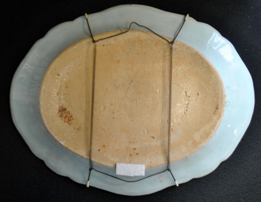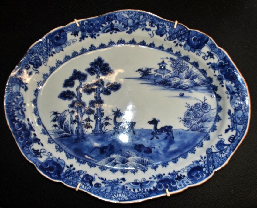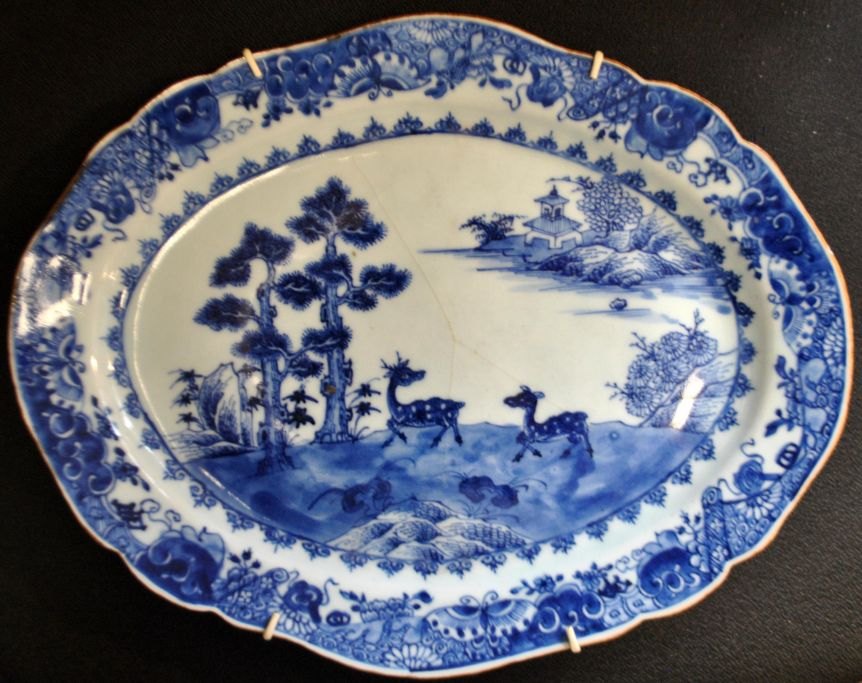 Chinesischer blau-weißer Gericht, 18. Jahrhundert. Mit handgemalten Dekorationen von Hirschen in einer Landschaft. Im Hintergrund eine Pagode. Rand verziert mit Blumen und Schmetterlingen. L.: 36,5 cm. B.: 28,5 cm.NB: Mit Haarrissen - sonst einwandfreier Zustand!