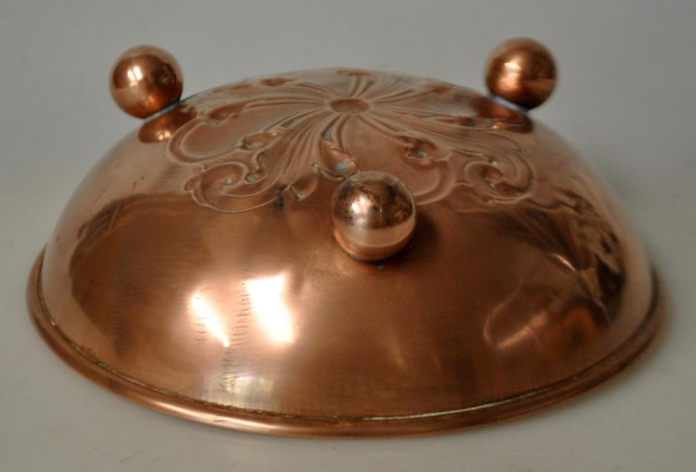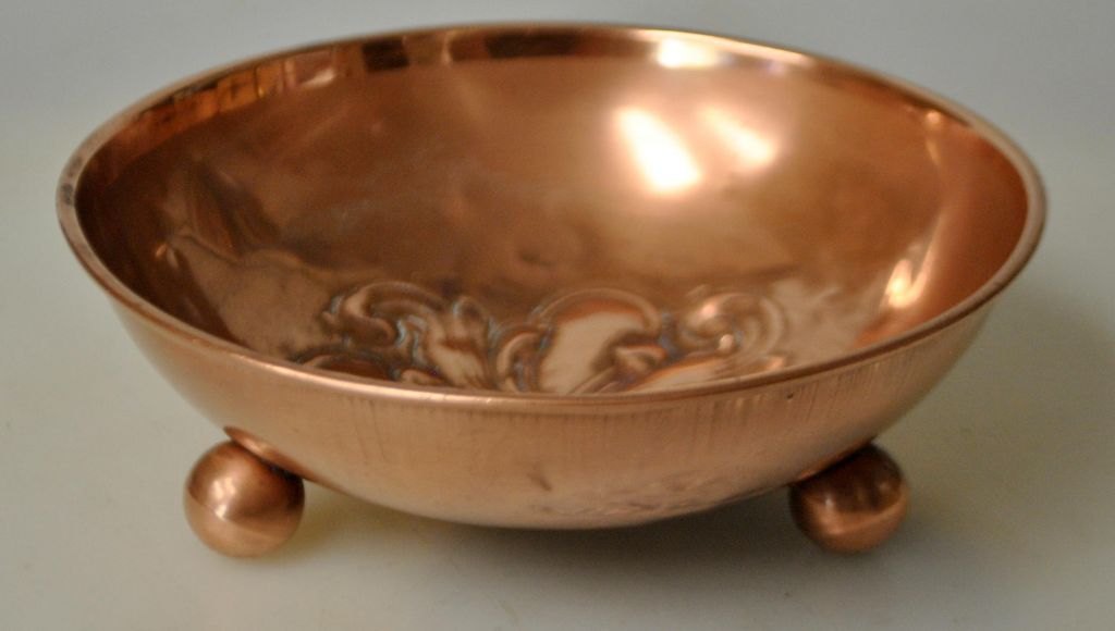 Kupferschale, 19. Jahrhundert. Auf drei Kugelbeinen. Mit Blumendekor. H: 4 cm. Durchmesser: 13 cm.Bestellnummer: 28183