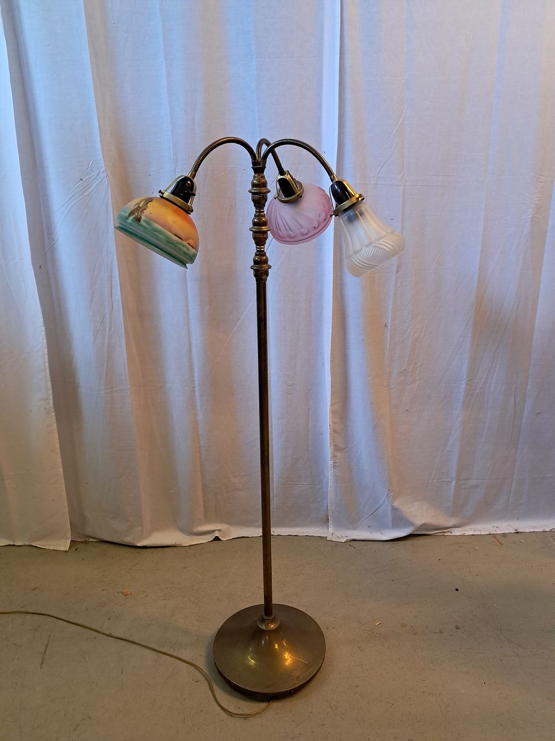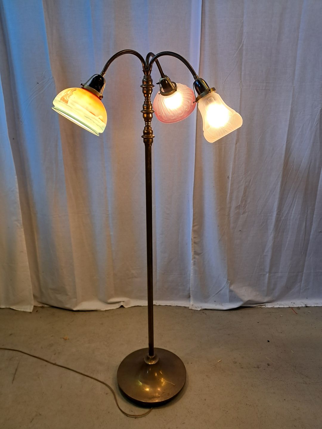 Gulvlampe i metal med 3 glasskærme, fra 1930erne.Den har brugsspor.