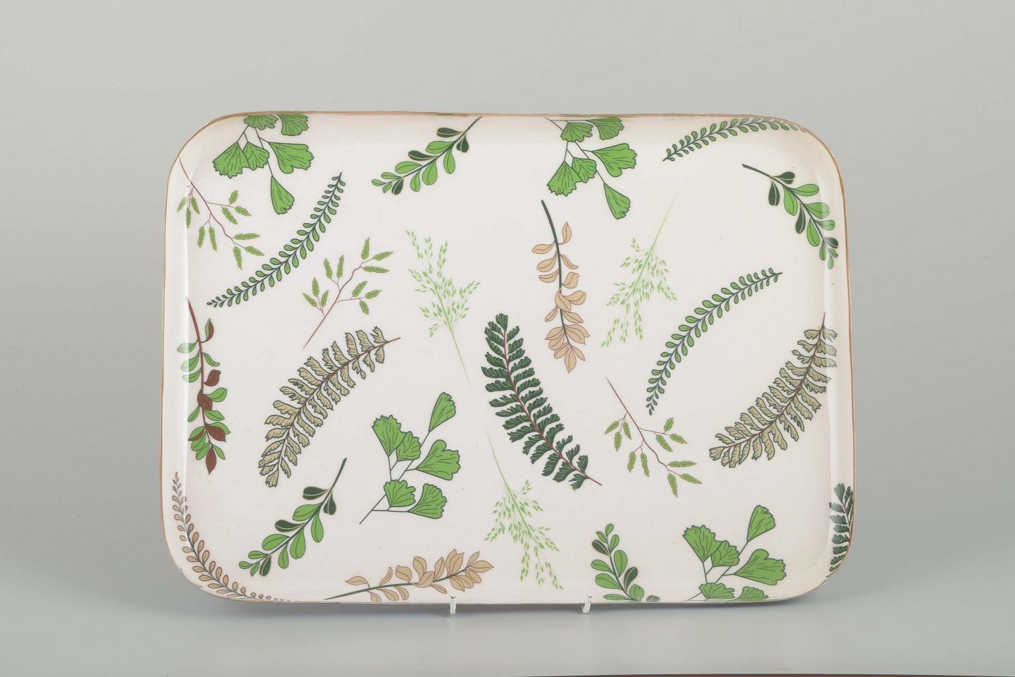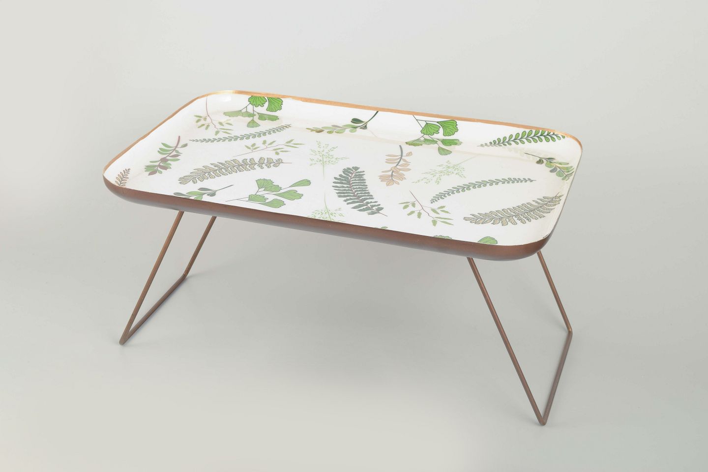 Rektangulært bakkebord med træramme og metalben. Bakken dekoreret med Josef Franks karakteristiske botaniske mønster med grønne blade og bregner på lys bund.