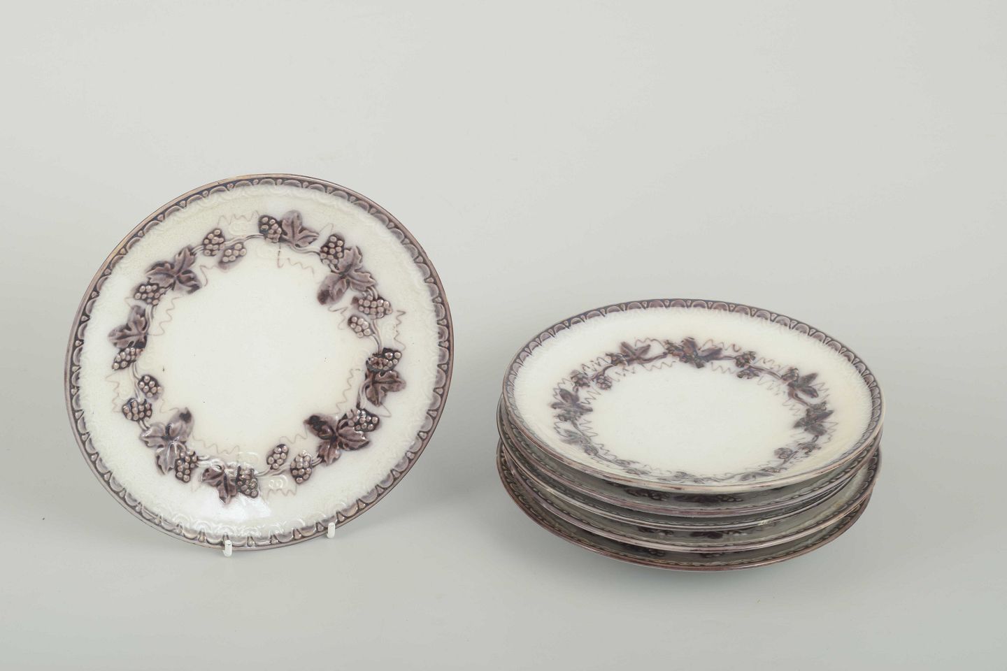 Gefle Tallerkener “Mullbär”, 1930’erneSæt med 6 runde fajancetallerkener med reliefdekor og vinrankemotiv i brunlig tone langs randen.