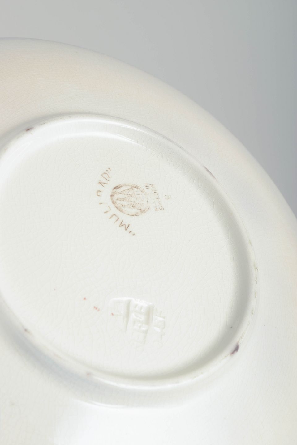 Bio: Gefle Porcelainsfabrik blev grundlagt i 1910 i Gävle og blev hurtigt en af Sveriges mest betydningsfulde producenter af porcelæn og fajance. I 1930’erne fortsatte traditionen med at fremstille klassiske transfertrykte og reliefdekorerede stel til både husholdning og eksport. Dekorationen “Mullbär” er et typisk eksempel på tidens naturalistiske ornamentik, med vinranker som klassisk motiv inspireret af historiske stilarter.