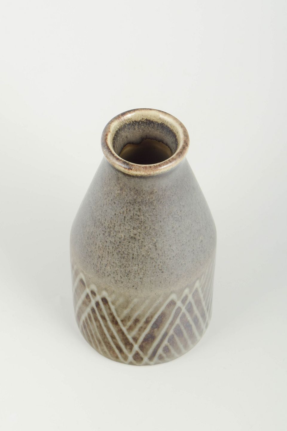 Cylindrisk formet vase i drejet stentøj med brunlig glasur og indridset geometrisk mønster i hvid dekoration.