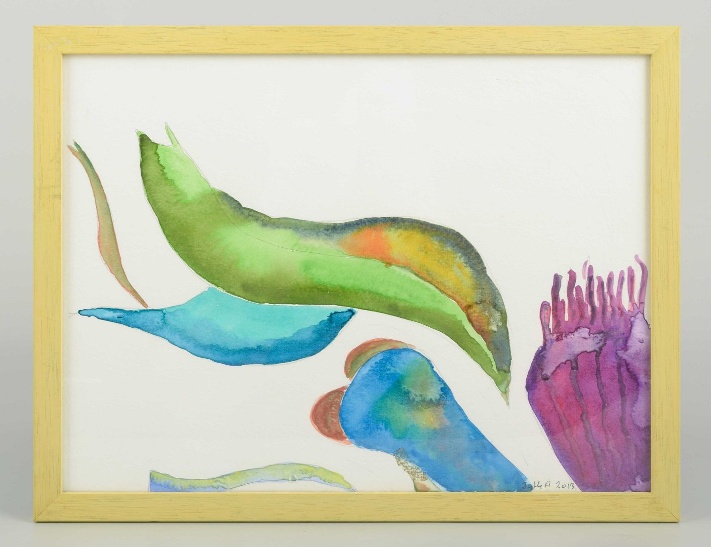 An abstract and colorful work in watercolor, where organic forms in violet, blue, and green tones float across the white surface of the paper. The work appears as a free and experimental composition with both figurative and nature-inspired associations.